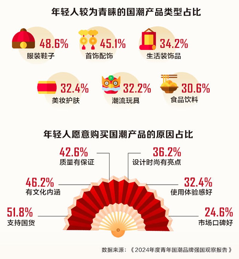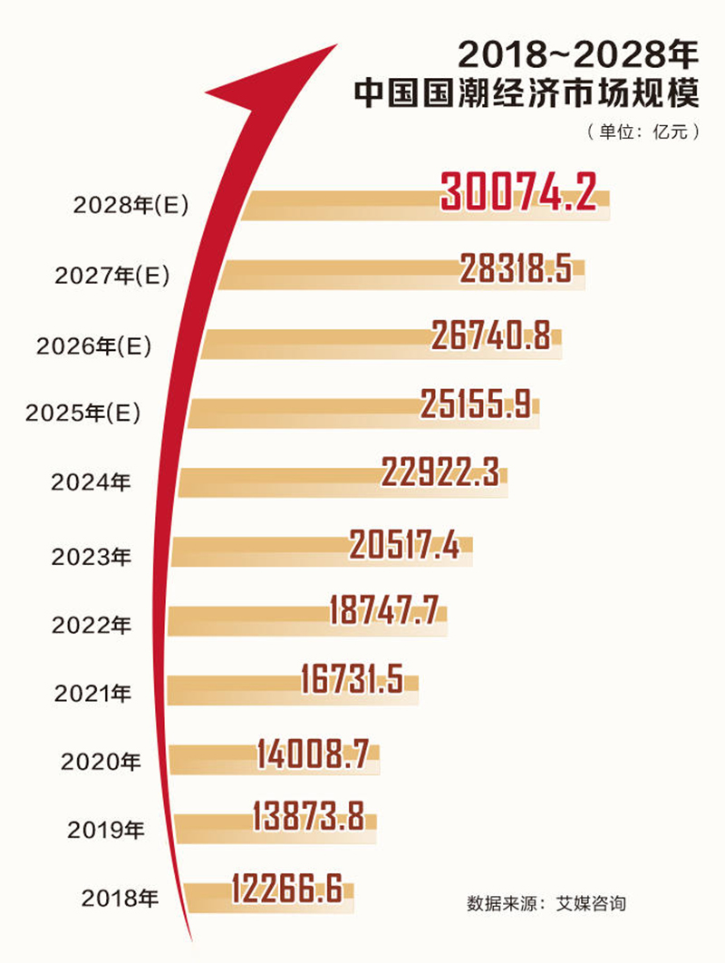 证券时报记者 张智博 在时下的年轻消费群体中,“复古”与“汉唐风”已不止于审美,而是演变成一股强劲的国风消费浪潮。 放眼望去,汉服、马面裙在年轻群体中蔚然成风,新中式穿搭风靡社交媒体,印有繁体字或古典纹样的挂件摆饰成为国人新宠。文创商品更是化身“社交顶流”——国家博物馆推出的凤冠冰箱贴,上市一年多累计销量达227.9万件,带动其原型“明孝端皇后楼九龙九凤冠”成为目前国家博物馆唯一需要排队参观的展品。 透过青年一代的潮流消费,中国古老而绵长的传统文化,正从沉寂许久的高阁之上,渐入车水马龙的烟火人间。 年轻人为何偏爱国潮商品?根据中国青年报发布的《2024年度青年国潮品牌强国观察报告》,在众多选择国潮商品的原因中,“支持国货”成为受访者买单的核心要素,占比高达51.8%;“有文化内涵”“质量有保证”也是重要因素,占比分别为46.2%、42.6%;“设计时尚有亮点”“使用体验感好”也获得三成以上受访者的认可。 传统与时尚的形神合一 国潮,顾名思义——“国”指中国传统文化元素,“潮”则指时尚潮流。“国潮”就是通过创新创意将二者有机结合起来。 开源证券轻工纺服首席分析师郭彬对证券时报·数据宝记者表示,国潮是时尚对于中式审美的再发现和再发掘。国潮的文化和精神内核,是以中华传统文化为核心的中式美学体系。 国潮商品可概括为“时尚符号”与“文化内核”的形神合一,最直观的表现就是对中国传统文化元素的创造性运用。例如在设计中,添加传统色彩(月白、松花绿、琉璃黄等)、经典纹样(龙、凤、貔貅等)、汉字书法(中国李宁、茶颜悦色等)、经典IP(故宫文创、《黑神话:悟空》周边等)甚至美学风格等,均属于国潮商品的形式范畴。 为何传统文化元素能够获得消费者推崇,甚至形成浪潮? 锦泓集团副总经理、南京云锦博物馆馆长简名伟对证券时报·数据宝记者表示,国潮能引起广泛共鸣,在于消费者“有感知”,这类感知扎根于我们的文化基因中,是在日常生活中不断沉淀下来的美学素养。例如,将《千里江山图》《清明上河图》等传统纹样融入现代设计,既保留文化根脉,又符合当代审美,自然能够向国人传递价值认同与情感共鸣。 简名伟进一步指出,传统中国美学是一个比较大的概念,可分为民间艺术、文人艺术和宫廷艺术,其中云锦就是宫廷艺术的代表。在文化的强背书下,如何将文化内涵转化为产品中的“情绪价值”,从而赋能消费、赢得市场认可,关键在于品牌能否实现文化的创新转化与创造发展能力。创新转化在于留住文化的“魂”,但仍要传递出其精神,用新的表达方式,让文化年轻起来;创造发展则是要持续打造“技术壁垒”,结合新材料、新技术,使产品有创造力的表现,焕然一新。 文化创新孕育万亿市场 今年1月,国务院办公厅印发的《关于进一步培育新增长点繁荣文化和旅游消费的若干措施》明确提出,开发时尚国潮产品,推出彰显中国审美、中国风格的时尚穿戴、家居、潮玩、运动、电子设备等产品,推动在服装、箱包、珠宝、美妆、玩具等领域开发联名款文创产品,打造国货“潮牌”“潮品”。 近年来,国潮品牌在产品创新和品牌营销上持续发力,不断创造新的消费潮流,国潮经济市场已经步入万亿级规模。根据艾媒咨询数据,2023年,中国国潮经济市场规模为20517.4亿元,同比增长9.44%;预计2028年将突破3万亿元,达到30074.2亿元。 国潮经济正渗透进国人生活的方方面面。根据《2024年度青年国潮品牌强国观察报告》,如果产品融入国潮元素,78.9%的受访青年表示会更有购买意愿。在不同类型的国潮产品中,48.6%的受访青年倾向于购买服装鞋子,45.1%则对首饰配饰青睐有加。此外,生活装饰品、美妆护肤、潮流玩具、食品饮料等品类也均获得30%以上的受访青年支持。 各类国潮商品市场规模持续扩大。根据广东省服装服饰行业协会数据,2024年,中国国潮服饰市场规模已经超过2200亿元,预计2025年将达到2500亿元。而根据老铺黄金招股说明书,2023年,中国古法黄金市场规模约为157.3亿元,预计2025年将达到278.3亿元,2028年将突破400亿元大关。 国潮经济正奔向全球 如今,国潮经济不仅在国内消费市场掀起热浪,更是接连走出国门,在全球范围内刮起“中国风”。 潮玩文创作为先锋,透过可亲可爱的IP形象,打破文化隔阂。泡泡玛特将潮玩与传统非遗深度结合,多款IP产品融合了瓷器、绒花等技艺,像是点缀着南京绒花饰件的Molly玩偶,受到世界各地消费者的喜爱。文艺方面,九维文化运作出海的舞剧《咏春》在英国伦敦沙德勒之井剧院演出12场、在法国巴黎会议宫演出4场,刷新中国本土舞剧海外商演的时间、场次纪录。这一系列中国品牌出海,标志着国潮文化越来越受全球消费者认同。 简名伟认为,国潮出海,此时恰好站在“国家软实力”与“市场硬需求”的交汇点,如同在近两年中法、中意建交纪念外展上所展示的艺术品《海屋朝鹤》《十全十美》,中华传统文化的现代表现有望成为国家外交的文化名片。未来,跨国融合或可作为国潮商品的重要创新方向,打造全新的消费体验。 郭彬则指出,国潮真正的护城河有三个:一是扎实的产品基础和服务能力;二是对中国文化正确且深入的认知思考;三是对市场和国潮的敬畏之心。只有持续去思考消费者需要什么,进行产品的传承和迭代,将产品输出上