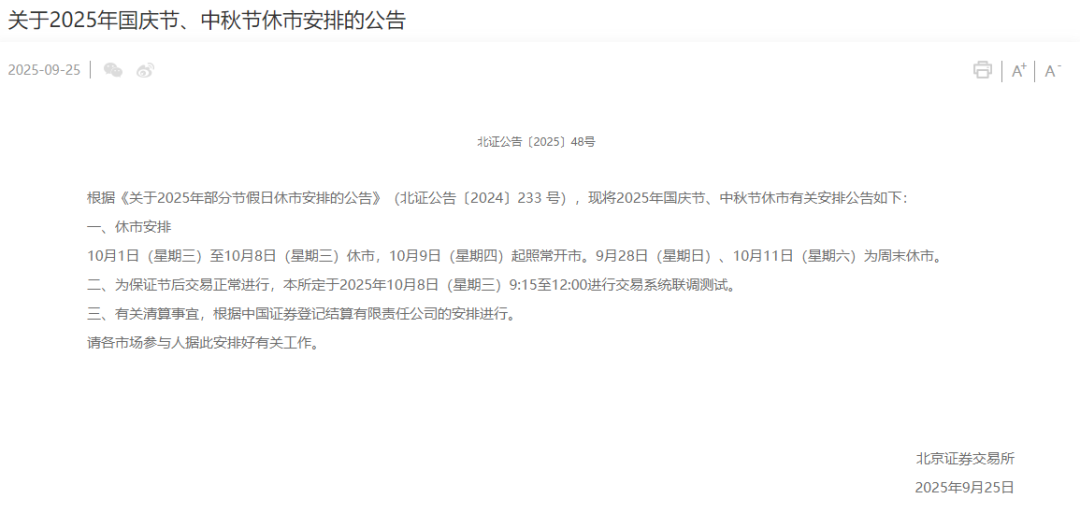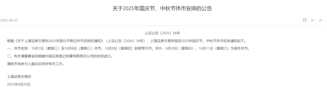 国庆节、中秋节休市安排来了。 9月25日,几大交易所相继发布国庆节、中秋节休市安排。 10月1日(星期三)至10月8日(星期三)休市,10月9日(星期四)起照常开市。另外,9月28日(星期日)、10月11日(星期六)为周末休市。 港股通交易方面,深交所信息显示,10月1日(星期三)至10月8日(星期三)不提供港股通服务,10月9日(星期四)起照常开通港股通服务。另外,9月28日(星期日)、10月11日(星期六)为周末休市。港股通交易的清算交收事宜,按照中国证券登记结算有限责任公司的安排进行。 在此之前,昨日(9月24日),上海国际能源交易中心也发布了《关于2025年国庆节、中秋节期间有关工作安排的通知》,具体内容如下: 一、2025年9月30日(星期二)晚上不进行夜盘交易。 2025年10月1日(星期三)至2025年10月8日(星期三)休市。 2025年10月9日(星期四)08:55—09:00所有期货、期权合约进行集合竞价,当晚恢复夜盘交易。 二、自2025年9月29日(星期一)收盘结算时起,交易保证金比例和涨跌停板幅度调整如下: 国际铜期货合约的涨跌停板幅度调整为9%,套保持仓交易保证金比例调整为10%,一般持仓交易保证金比例调整为11%; 原油、低硫燃料油期货合约的涨跌停板幅度调整为12%,套保持仓交易保证金比例调整为13%,一般持仓交易保证金比例调整为14%; 20号胶期货合约的涨跌停板幅度调整为11%,套保持仓交易保证金比例调整为12%,一般持仓交易保证金比例调整为13%; 集运指数(欧线)期货合约的涨跌停板幅度调整为20%,交易保证金比例调整为22%。 如遇《上海国际能源交易中心风险控制管理细则》第十六条规定情况,则在上述交易保证金比例、涨跌停板幅度基础上调整。 三、2025年10月9日(星期四)交易后,自第一个未出现单边市的交易日收盘结算时,涨跌停板幅度和交易保证金比例调整如下: 所有期货合约的涨跌停板幅度和交易保证金比例恢复至原有水平。 关于涨跌停板幅度和交易保证金比例的其他事项按《上海国际能源交易中心风险控制管理细则》执行。 综合自:交易所网站 责编:万健祎 校对:冉燕青 |