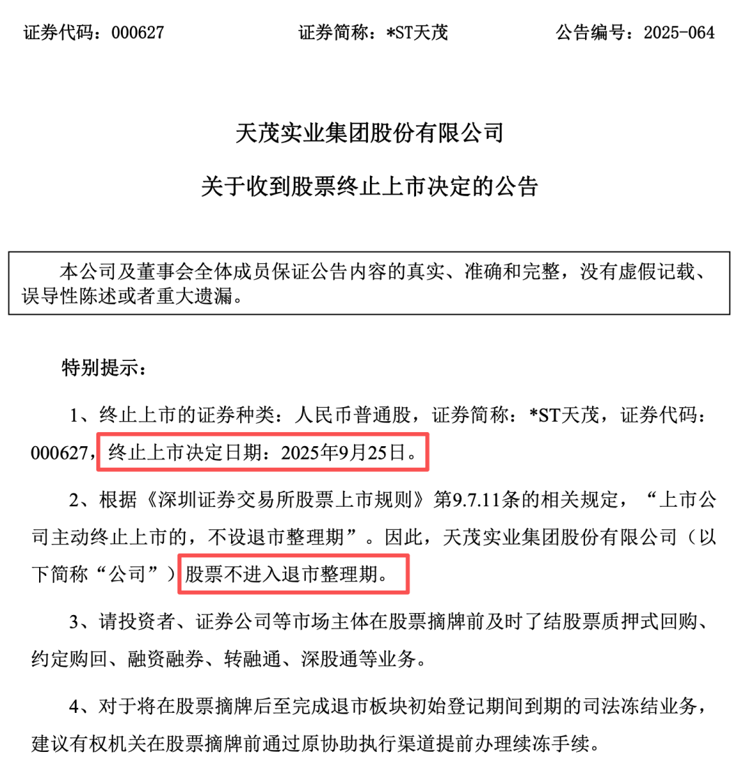 主动终止上市的*ST天茂(000627),即将摘牌。 9月25日晚,*ST天茂公告称,公司于2025年9月25日收到深交所《关于天茂实业集团股份有限公司股票终止上市的决定》,深交所决定终止公司股票上市。 此前,*ST天茂于2025年9月4日向深交所提交了主动终止上市申请材料。2025年9月10日,深交所正式受理公司股票终止上市申请。 *ST天茂主要通过控股子公司国华人寿和华瑞保险从事保险业务,保险业务相关的营业收入占到公司主营业务收入99.99%,是公司的核心业务。 今年8月,*ST天茂公告,拟以股东会决议方式主动撤回A股股票在深交所的上市交易,并在股票终止上市后,申请转入全国中小企业股份转让系统代为管理的退市板块转让。 *ST天茂当时提到,由于公司拟进行业务结构调整,面临重大不确定性,可能对公司造成重大影响。若《关于以股东会决议方式主动终止公司股票上市事项的议案》未能获得股东会审议通过,可能损害中小股东利益。请各位股东在股东会表决时做出慎重决策。 今年8月25日,*ST天茂2025年第一次临时股东会通过主动终止上市的议案。 根据最新公告,*ST天茂股票将在交易所公告终止上市决定之日起(即9月25日)五个交易日内摘牌。 根据《深圳证券交易所股票上市规则》第9.7.11条的相关规定,“上市公司主动终止上市的,不设退市整理期”。因此,*ST天茂股票不进入退市整理期。 这意味着,再过几个交易日,*ST天茂的上市历程就将走到终点。 此次主动终止上市,*ST天茂为投资者提供了现金选择权。现金选择权的行权价格为1.60元/股。根据公司近期披露,在此次现金选择权申报期间,共有约14.42亿份现金选择权进行了有效申报。目前,上述有效申报的现金选择权已完成交收。 截至2025年7月18日,*ST天茂股东共计11.2万户,公司停牌前最后一个交易日收于1.58元/股,市值约77亿元。 |