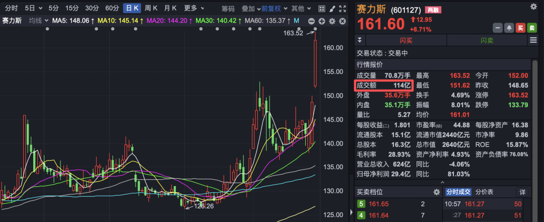 9月26日早盘,汽车板块爆发。 赛力斯(601127)涨停,股价创历史新高,开盘不到一个半小时成交超110亿元,总市值突破2600亿元。 消息面上,9月25日,赛力斯发布公告称,公司发行境外上市外资股(H股)获中国证监会备案。根据备案通知书,公司拟发行不超过3.31亿股境外上市普通股并在中国香港联合交易所上市。 此外,曙光股份、千里科技、北汽蓝谷、比亚迪等跟涨。港股汽车与零配件板块持续走高,截至发稿,小鹏汽车涨超6%,奇瑞汽车、零跑汽车、蔚来等跟涨。 国内新能源车企销量持续向好。据欧洲汽车制造商协会数据,特斯拉8月在欧盟市场的新车注册量下降近37%,而比亚迪8月欧盟新车注册量增长201%,特斯拉在欧盟市场份额已经连续第二个月被比亚迪超越。 根据中国汽车流通协会乘联分会的数据,今年7月,纯电动汽车批发销量为73.6万辆,同比增长44.8%;狭义插混车型批发销量为33.6万辆,同比增长3.3%;而增程式车型批发销量为10.9万辆,同比下降6.2%。8月,纯电动汽车批发销量为81.5万辆,同比增长38.5%。 |