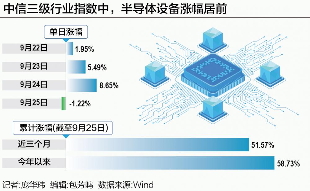 3日涨超16%,半个月涨超30%,3个月涨超50%,半导体设备板块以“一骑绝尘”的姿态引领科技股反弹,成为A股市场最亮眼的明星。 但在狂欢之后,9月25日,半导体设备指数出现回调。 回调是机会还是风险? 21世纪经济报道记者采访的多家机构指出,这场由AI需求驱动的狂奔,背后的核心逻辑依然坚挺。 暴涨背后 近期,半导体设备板块迎来爆发式上涨。 9月22日至9月24日,中信三级行业指数中的半导体设备指数分别上涨1.95%、5.49%、8.65%,3天累计上涨16.85%,在276个中信三级行业指数中位列第一。 以9月24日为例,多只半导体设备主题ETF盘中一度涨停,截至当日收盘,国泰基金、易方达基金、万家基金旗下中证半导体设备ETF领涨,涨幅分别为9.55%、9.44%、9.4%,华泰柏瑞科创半导体设备ETF上涨9.1%,招商半导体设备ETF上涨8.67%。 拉长时间来看,9月10日至9月24日,在中信三级行业指数中,半导体设备指数大涨逾33%,在276个细分行业中位列第一。 对此,止于至善投资总经理何理分析,近期半导体设备指数表现突出由多个因素推动:首先,长存三期(武汉)集成电路有限责任公司9月5日注册成立,长存三期公司成立是长存三期扩产的重要标志,半导体设备国产化率有望继续提升。其次,存储芯片价格涨幅超出市场预期,有望推动全球存储芯片产能扩张。另外,近期工博会上光刻机的相关展示对市场情绪产生了较为明显的催化作用。 此外,业内认为,补涨需求凸显也是近期半导体设备指数大涨的重要因素。 华夏基金指出,本轮科技行情共识很高,资金逐步挖掘低位机会。“其中,8月国内算力行情中主要是芯片设计公司上涨,而半导体上游的设备、材料等前期表现一般,近期则迎来加速补涨。”华夏基金表示。 值得一提的是,有业内人士表示,半导体尤其成长性好的半导体设备,是今年第四季度机构的胜负手。 国泰基金的研究显示,从估值层面看,半导体设备ETF还处在相对较低的位置。截至9月24日,半导体设备ETF标的指数PETTM为89.45x,位于上市以来73.04%分位。在AI大趋势中,很多核心的板块都已经创了新高了。半导体这个位置还相对偏低,总体上看还是比较诱人的。 回调是机会还是风险? 不过,在快速上涨之后,9月25日,中信半导体设备指数出现回调,当日收盘跌1.22%。 “半导体设备指数近期大幅上涨,累积了比较多的获利盘,所以短期内出现调整在情理之中。”对此,前海开源基金首席经济学家杨德龙表示。 此轮半导体设备行情能否延续? 业内人士认为,当前半导体设备板块的调整,更像是狂奔途中一次短暂的歇脚。在AI需求驱动下,其长期成长赛道依然清晰。 事实上,截至9月25日,中信半导体设备指数近半个月上涨31.81%,近3个月上涨51.57%,年内上涨58.73%。 “近期,半导体设备板块‘一骑绝尘’,成为A股科技反弹的核心主线之一。9月24日,半导体设备板块加速上涨,进入严重超买区间,短期存在技术性回调压力。”融智投资基金经理兼高级研究员包金刚表示。 但包金刚认为,从基本面角度看,“国产化率持续提升+资本开支扩张”仍是核心驱动。2025年中国大陆晶圆厂设备投资预计连续四年保持在300亿美元的高位,国产化率持续提升。因此,此时半导体设备板块的回调并非趋势反转,而是情绪过热后的理性修复,短期震荡后有望重新走强。 9月25日,何理也表示,“9月25日出现回调主要因为板块短期涨幅过大,但是半导体设备板块的上涨逻辑依然通顺。” 何理指出,近年来,半导体设备国产化率持续提高,在国产算力落地及自主可控驱动下,设备板块发展趋势明确。 华夏基金策略团队认为,半导体设备材料的国产化率长期将提升,相关公司持续导入后业绩提升是大趋势;全球半导体景气度持续较高后,资本开支扩张,也利好设备材料等公司的盈利预期。 诺安基金科技组基金经理刘慧影表示,半导体板块上涨并非短期脉冲,而是近期需求爆发、中期技术突破、远期生态成型的三重逻辑共振的结果,且均有实质性产业进展佐证,行情走势或具备持续性。“在近期驱动半导体板块走强的因素中,AI存储需求爆发与设备环节利好频现成为核心主线。” 增长潜力较大 杨德龙表示,“半导体行业是我国政策重点支持的行业,发展前景向好,如果出现较大幅度调整,将是一个配置的机会。未来半导体设备行业的发展趋势依然向好,可以关注行业龙头股,或者是相关的主题投资基金。” 何理建议,可以关注高性能测试机、先进封装设备、键合设备以及半导体刻蚀设备等环节。 格上基金研究员托合江认为,在AI算力需求增长、下游扩产等因素的支撑下,半导体设备板块仍然具备增长潜力,特别是具备核心技术的细分领域,未来增长空间较大。建议关注技术突破环节的公司,并积极跟踪下游扩产动态。 展望后市,国泰海通证券的最新分析指出,人工智能发展带来的SoC、HBM、电源管理芯片等测试设备以及服务器主板级测试设备的需求将快速增长,相关企业迎来新的成长空间。 |