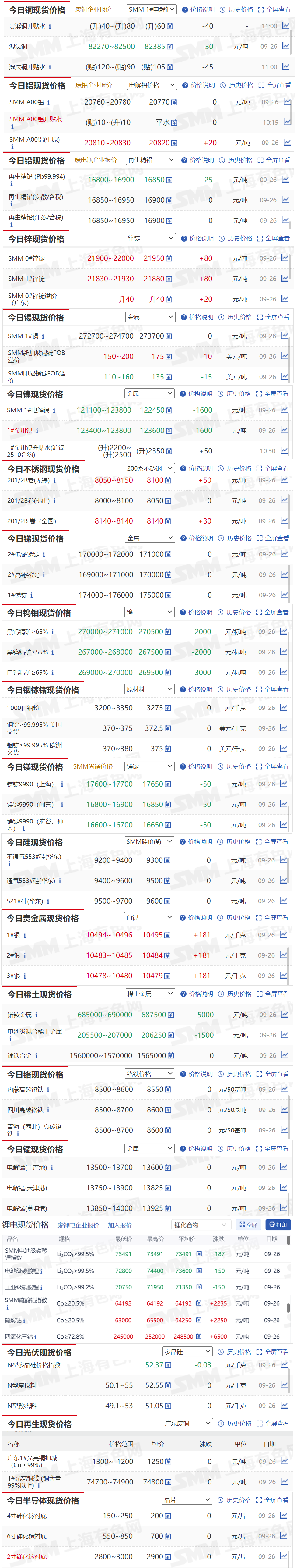 ►外盘金属普涨 沪银再攀新高 焦炭、欧线集运跌幅居前 油价四连涨【SMM午评】 ►铜价继续走高下游补货欲下降,但持货商仍坚持挺价出货【SMM华南铜现货】 ►国庆临近下游刚需备货 现货升贴水承压【SMM华北铜现货】 ►9月26日上海市场铜现货升贴水(第四时段)【SMM价格】 ►SMM 2025/9/26 国内知名再生铅企业废电瓶采购报价 ►天津锌:锌价小幅上行 市场成交转弱【SMM午评】 ►锡市午盘震荡偏强 节前资金博弈加剧【SMM锡午评】 ►【SMM镍午评】9月26日镍价回落,美国第二季度GDP被大幅上修至增长3.8% 》点击进入SMM官网查看每日报价 》订购查看SMM金属现货历史价格走势 (建议电脑端查看) |