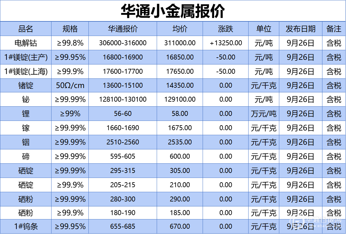 华通白银网 9月26日讯:电解钴、1#镁锭(生产)、1#镁锭(上海)、锗锭、铋、锂、镓、铟、碲、硒锭(99.99%)、硒锭(99.9%)、硒粉、硒粉(99.9%)、1#钨条报价