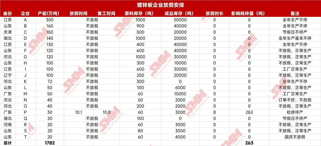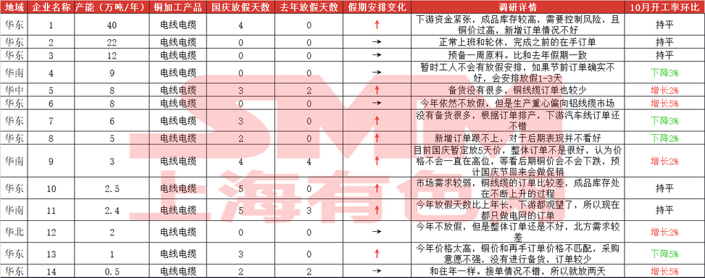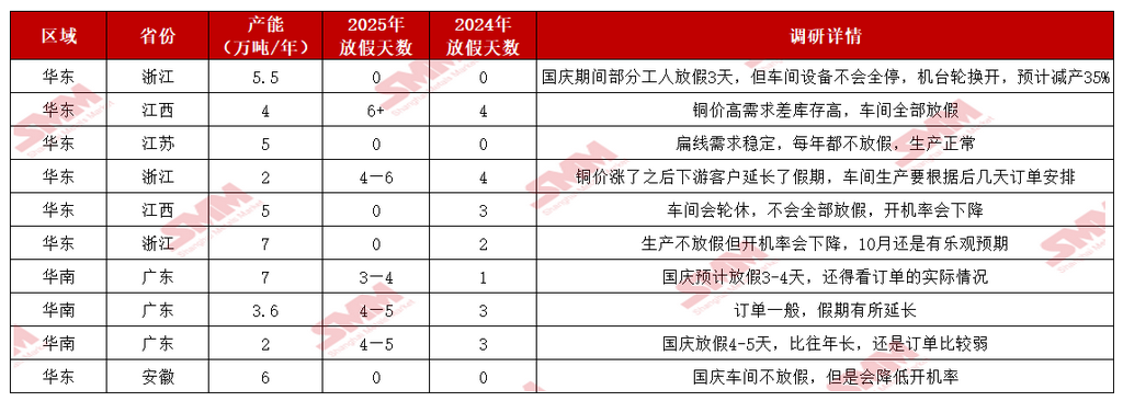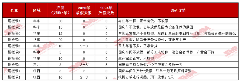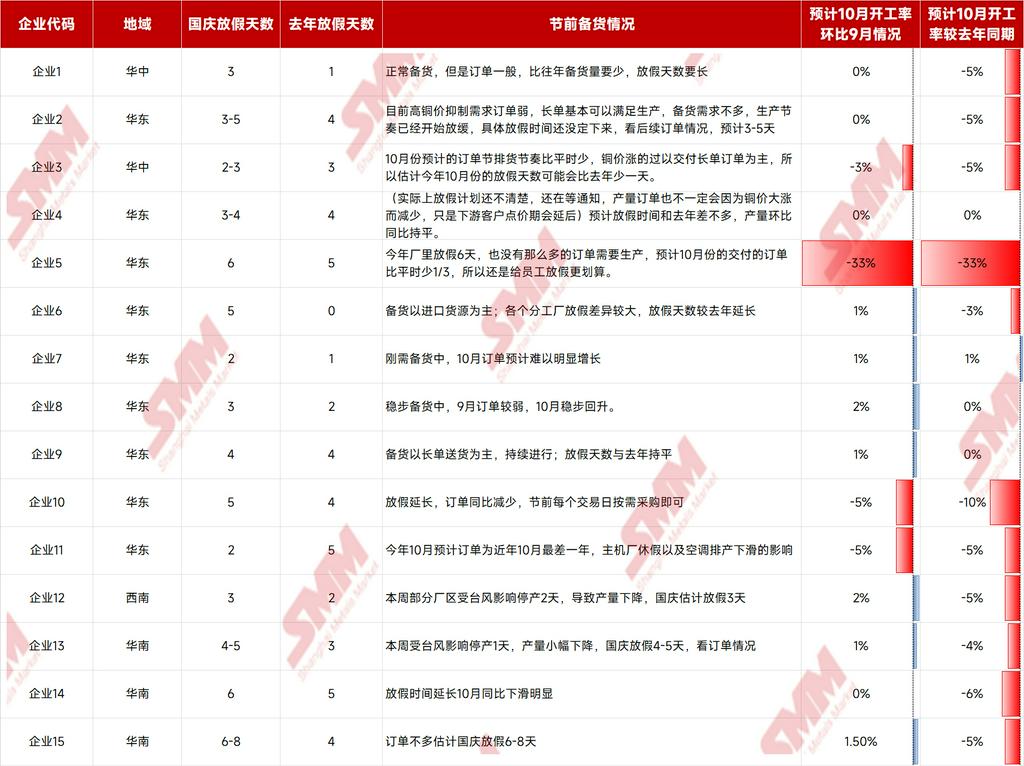 中秋与国庆双节将至,SMM提前祝大家节日快乐! 2025年中秋与国庆双节临近,根据《国务院办公厅关于2025年部分节假日安排的通知》,本次双节放假调休时间已明确:10月1日(周三)至8日(周三)共8天,9月28日(周日)、10月11日(周六)正常上班。SMM在此提前向各位致以节日祝福,愿大家假期顺遂舒心! 国内宏观面利好持续释放,海外美联储于9月落地年内首次降息,25个基点的宽松举措叠加国内偏暖的宏观氛围,为金属市场注入稳定预期。不过,不少金属价格居高,当前大部分金属价格并未出现大幅波动,多以窄幅整理为主,唯有铜价受供应端扰动表现突出——日前不仅刷新阶段新高,目前继续维持高位震荡态势。而铜价的高企,已对下游消费积极性产生明显抑制,进而直接影响铜企节前备货节奏。 当前市场正处于传统行业旺季,且中秋、国庆双节临近,双重节点下,金属产业链整体呈现怎样的态势?在此背景下,今年各品类企业的节前备货节奏、假期生产安排,较往年又有哪些新变化? 为助力大家及时掌握最新市场动态、合理规划假期相关事宜,SMM对金属产业链的节前备货与假期安排展开全面调研,现将核心信息整理如下,供各位参考! 铜 》2025年国庆假期铜加工企业放假调研——铜管【SMM分析】 2025年国庆与中秋双节同庆,共放假8天;往年“金九银十”作为新年度冷年的开启,铜管市场订单以及开工率均较为亮眼。然而今年十月或为近几年铜管开工最冷清的一年。 一、放假天数 SMM与企业交流得到,多数企业放假天数均较去年国庆放假天数增多1-3天,仅部分企业放假天数可能减少1-2天,但也要根据节前最后三个交易日实际订单情况再做调整。 二、节前备货 节前铜价冲高至年内最高点,盘中已经突破83000元/吨大关,多数企业表示新增订单有限。大型企业表示原料库存备货有进口货源以及长单货源补充即可,小型企业未有长单和进口货源补充的则刚需购买电解铜,但高铜价令提前备货所需的资金成本较高,预计节前两个交易日再根据订单情况做备货调整……》点击查看详情 》2025年国庆假期加工企业放假调研——铜板带【SMM分析】 国庆长假将至,SMM对10家大中小型铜板带企业的生产计划进行了了解,涉及年产能共131万吨,具体放假安排如下: 2025 年铜板带企业假期放假时间与 2024 年相比无明显变化,放假时长基本保持一致,行业整体生产节奏规划延续往年规律。从企业规模维度看,分化特征显著:大型企业为保障订单交付效率、维持产能稳定,假期期间多不安排集中放假,持续保持正常生产状态;而个别小型企业受双重因素制约,一方面面临订单量不及预期的压力,另一方面再生原料采购或供应环节存在问题,因此选择放假 5-7 天,以调整生产计划、缓解运营压力……》点击查看详情 》2025年国庆假期铜加工企业放假调研——黄铜棒【SMM分析】 中秋节与国庆节相遇,国家法定节假日休息8天时间,SMM对中国黄铜棒企业假期间生产以及目前备货情况进行调研,具体如下: 企业生产安排:放假天数同比增加 调研覆盖12家黄铜棒生产企业,总年产能达135万吨。结果显示,企业非生产人员基本按照国家法定节假日放假8天,但生产工人普遍放假3-5天。与去年相比,今年黄铜棒企业平均放假时长增加1.15天。 节前备货情况:"金九银十"成色不足 传统9月与10月是铜棒市场需求旺季,往年国庆节前下游备货情绪积极。然今年“金九银十”行情未能如期显现,订单表现相对较弱,导致节前备货并不明显。 市场面临多重挑战:近期海关加强对原产地证明的核查,导致再生黄铜现货供应紧张。同时,受矿端供应扰动等因素影响,铜价快速上涨,沪铜主力合约价格已突破83000元/吨大关,显著抑制了下游企业的备货积极性。 市场心态:观望情绪浓厚 多数铜棒企业反映,下游客户确实存在订单释放需求,但由于当前铜价处于高位,普遍采取观望态度,等待合适的下单时机。整体来看,受铜价高企影响,今年铜棒下游备货量明显低于2024年同期水平。 节后展望……》点击查看详情 》2025年国庆假期铜加工企业放假调研——再生铜杆【SMM分析】 今年国庆、中秋假期接踵而至,国家法定节假日长达8天,SMM对再生铜杆企业节前备货和工人放假安排作出如下整理:(企业产能:219万吨) 1、安徽、江西地区以外企业假期保持开工,工人轮班为主 此次调研了解到,目前江西、安徽部分地区由于770号通知影响,自9月初至今仍然保持停产观望状态,而其他地区的再生铜杆企业普遍表示假期仍会保持开工,若原料备货不足,可能会安排工人放假1-2天,但就铜价飙升后,市场上再生同那个原料供应较为充裕,再生铜杆企业不担心原料采购不足。 2、节前备货:成品库存偏低,贸易商、终端消费企业提货积极 再生铜杆企业表示此次铜价快速拔升后,贸易商、终端消费企业都在催促再生铜杆企业尽快交货,基本上再生铜杆每日出炉后都马上安排发货,再生铜杆企业目前几乎没有成品库存, 因此再生铜杆企业节前都在积极备货再生铜原料,再生铜杆企业表示由于假期较长,需要在节前准备600-750吨再生铜原料才能保证假期期间持续开工。 3、市场心态:终端消费企业看多后续铜价 此轮铜价上涨主要由于自由港旗下两座矿山发生不同程度事故,引发全球对未来铜矿供应趋紧预期,终端消费企业普遍认为后续铜价将有望冲击85000元/吨,所以终端企业较往年同期采购情绪较为乐观,认