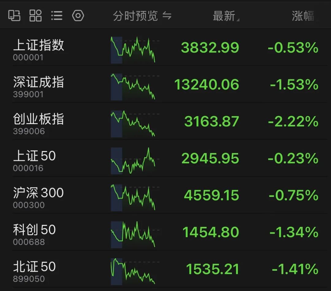 9月26日午后,A股出现调整之势,创业板指跌幅扩大至2.22%。截至发稿,市场超3000只个股下跌。