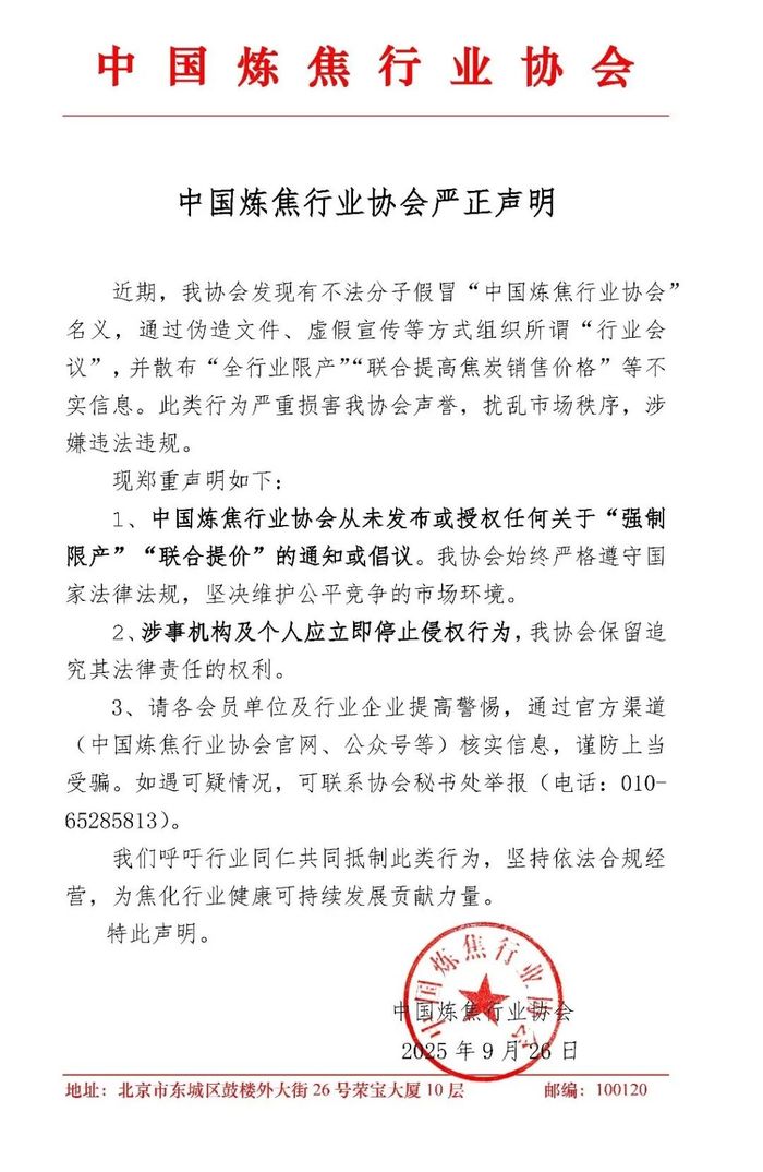 9月26日,中国炼焦行业协会发布严正声明:中国炼焦行业协会从未发布或授权任何关于“强制限产”“联合提价”的通知或倡议。协会始终严格遵守国家法律法规,坚决维护公平竞争的市场环境。涉事机构及个人应立即停止侵权行为,协会保留追究其法律责任的权利。
