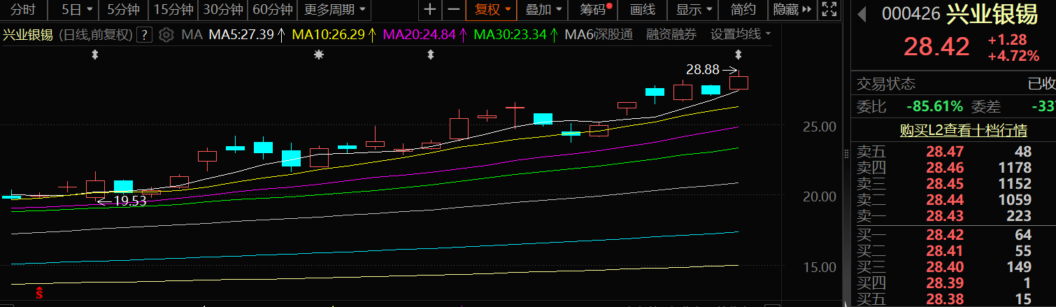9月26日,兴业银锡股价出现逆势上涨,截至26日收盘,兴业银锡涨4.72%,报28.42元/股。 有投资者在投资者互动平台提问:布敦乌拉银矿项目是什么时候形成利润的,什么时候会转给兴业银锡?兴业银锡9月25日在投资者互动平台表示,2024年12月,控股股东兴业集团已将其子公司布敦银根矿业委托公司进行经营、管理。截至目前,未有注入上市公司的时间计划。 兴业银锡在其2025年半年报中介绍公司行业地位情况时提及:公司主营业务为有色金属及贵金属采选与冶炼,拥有三十多年的行业经验和得天独厚的地域条件,储备了雄厚的矿产资源,生产能力及采选技术科技含量在同规模矿山企业中均处于领先地位。资产的优化,管理的规范,使得公司在同行业领域的竞争能力不断提高。公司 9 家骨干子公司现保有资源量超5 亿吨,其中:银金属量 3.06 万吨、锡金属量 39.9 万吨。根据世界白银协会统计截至2023年底的数据,公司在白银公司中排名位列亚洲第一位,全球第八位。公司子公司银漫矿业以铅锌银矿和铜锡银锌矿蕴藏为主,含银量较高、矿产品位较高,剩余服务年限较长,为国内最大的白银生产矿山之一,同时也是我国生产锡精矿骨干企业。根据中国有色金属工业协会锡业分会数据,银漫矿业2024年锡金属产量 8902 吨,为国内排名第二大锡精矿生产商。公司子公司宇邦矿业资源储量丰富,拥有双尖子山银铅矿采矿权,采矿面积10.9456 平方公里;根据世界白银协会统计截至 2023 年底的数据,宇邦矿业单体银矿排名位列亚洲第一位,全球第五位。 对于主要业绩驱动因素。兴业银锡在其半年报中介绍:公司主要业绩来源于有色金属采选,报告期有色金属采选业务收入占2025年 1-6 月营业收入的 99.28%,而影响采选板块业绩的主要因素包括主要产品的产销量、市场价格以及有色金属及贵金属采选业务的成本。 回顾兴业银锡2025年半年度报告可以看到,2025 年上半年,公司持续聚焦银锡主业精准发力,稳步推进海内外战略资源并购,进一步拓展优质矿产资源储备,同时积极从成本管控、资源开发、探矿增储等方面入手,扎实落实生产经营目标及各项工作任务。2025 年 1-6 月,公司实现营业收入 247,309.92 万元,较上年同期增加 12.50%;归属于上市公司股东净利润 79,567.51 万元,较上年同期减少9.93%。截至 2025 年 6 月 30 日,公司资产总额 1,534,154.56 万元,归属于上市公司股东的净资产 857,952.71 万元。此外,对于营业收入增加的原因,兴业银锡在其半年报中表示:报告期公司收购宇邦矿业85%股权并纳入合并报表范围,矿产银产销量同比增长;同时受益于银、锡等主营矿产品市场价格同比上涨所致。 2025 年上半年,归属于上市公司股东净利润较上年同期减少的主要原因: 1、子公司银漫矿业发生“3.9”事故,采区于 3 月9 日停产,4 月16 日复产,停产期间选矿厂加工地表存储原矿,此部分原矿正常生产期间是用来配矿的,因采区停产,无法进行均衡配矿致使锡、银入选品位下降,造成主产品锡、银产量同比下降。 2、子公司宇邦矿业本期业绩亏损,主要原因一是春季复工时间较晚,复工后积极推进采矿工程二期重大设计变更安全设施竣工验收工作,井下产能受限,在此期间,选矿厂加工地表存储原矿,入选品位偏低;二是加快实施采准、切割等为回采做准备的工程施工进度,为后续产能及高品位原矿产量提升做准备,高品位原矿产量偏低;上半年产能未充分释放及加工原矿品位偏低是造成本期亏损的主要原因。 3、子公司融冠矿业本期净利润同比减少,系报告期内开采的矿房不可剔除夹石增加,为确保入选品位,采取的地表抛废的工艺,致使入选同等的矿量较上年需增加采矿量,同时铁精粉产品平均售价同比下降 10.69%。4、子公司乾金达矿业报告期内,选矿厂破碎设备返厂家维修,影响了一个月的生产;同时,为生产接续施工了采矿三期准备工程、加大井下坑道探矿工程、实施通风系统优化工程等,致使掘进量同比大幅增加,生产成本上升。净利润同比减少。 矿产品产量:2025 年 1-6 月,公司生产矿产锡 3,589.82 吨,较上年同比减少 20.64%;矿产银 131.32 吨,较上年同比增长 4.57%;矿产锌29,986.14 吨,较上年同比增长 6.42%;矿产铅 9,246.55 吨,较上年同比减少1.09%;矿产铜960.74 吨,较上年同比减少 44.22%;矿产锑 968.69 吨,较上年同比增长4.72%;矿产铁 14.30 万吨,较上年同比减少 14.34%。矿产铋 82.02 吨,较上年同比增长100.64%,矿产金 0.028 吨,较上年同比增长 55.56%。 营业收入构成:2025 年 1-6 月,公司主营各类矿产品营业收入占公司整体营业收入比重情况如下:矿产锡 76,196.53 万元,占比 30.81%;矿产银86,070.44万元,占比 34.80%;矿产锌 47,769.48 万元,占比 19.32%;矿产铅12,651.26万元,占比 5.12%;矿产铁 8,266.29 万元,占比 3.34%;矿产锑7,184.11 万元,占比 2.90%;矿产铜 4,981.05 万元,占比 2.01%;矿产金1,627.82 万元,占比0.66%。其中,矿产锡、矿产银营业收入合计占比达 65.61%。 兴业银锡在半年报中表示:公司拥有的矿业权矿种多为多金属矿,主要产品为银、锡、铅、锌、铁、铜、锑、金等有色金属、贵金属及黑色金属,目前主要以精粉或混合精粉等产品销售为主。截至目前,公司已经形成了有色金属资源勘查、储备、开发、冶炼以及有色金属贸易等一系列较为完整的产业链条,使公司的抗风险能力和发展潜力进一步得到加强。 华鑫矿业点评兴业银锡的研报显示:营收同比增长,受益于矿产银量价齐升;