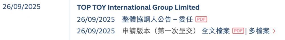 南方财经9月26日电,据港交所9月26日披露,TOP TOY International Group Limited(简称:TOP TOY)向港交所主板递交上市申请,摩根大通、瑞银、中信证券为其联席保荐人。TOP TOY是名创优品集团旗下潮玩品牌,此举意味着集团将旗下潮玩业务独立拆分上市。(21世纪经济报道)
