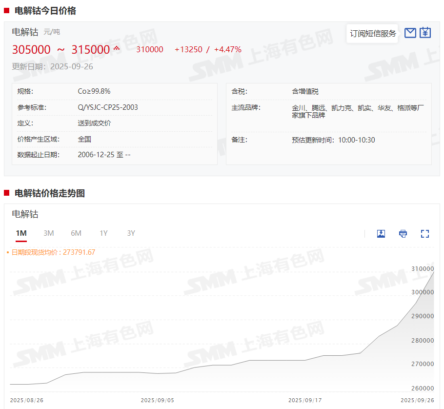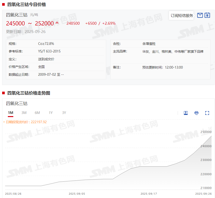SMM 9月26日讯:上周六晚间,刚果(金)宣布将9月21日到期的钴出口禁令继续延期到10月15日,并宣布10月16日起采取配额政策。最终政策虽然弱于上周五的市场预期,但随着市场逐步回归理性,钴系产品现货报价接连上探,不少钴产业链相关企业也纷纷回应该政策对自身的影响……SMM整理了本周钴系产品价格变动情况,具体如下: 电解钴方面: 据SMM现货报价显示,在刚果(金)钴出口禁令再度延期之后,本周电解钴现货报价接连跳涨,截至9月26日,电解钴现货报价涨至30.5~31.5万元/吨,均价报31万元/吨,较9月19日的27.5万元/吨上涨3.5万元/吨,涨幅高达12.73%。 》查看SMM钴锂现货报价 据SMM了解,上周日刚果金政策正式落地,该政策略弱于上周五市场预期,因此本周周初盘面有所回落。但依据该政策,未来中国钴市场依旧处于偏紧状态,市场在消化预期差后,重新回归理性,电解钴价格持续上行。但由于电解钴价格上涨过快,下游难以向下传导成本,因此市场实际成交有限。当前电解钴反融钴盐的窗口即将打开,预计未来电钴反融将加快其库存消耗速度。 钴盐方面(硫酸钴及氯化钴): 硫酸钴: 据SMM现货报价显示,本周硫酸钴现货价格也呈现持续上涨的态势,截至9月26日,硫酸钴现货报价涨至6.3~6.55万元/吨,均价报6.425万元/吨,较9月19日上涨5500元/吨,涨幅达9.36%。 》查看SMM钴锂现货报价 对于硫酸钴价格上涨的原因,主要是成本端价格支撑叠加下游备货的双重推动。供给方面,冶炼厂依旧看涨未来钴价,暂缓报价并上调意向出货价格,中间品冶炼企业意向价上调到6.8万元/吨附近,MHP和回收企业意向价上调到6.4~6.5万元/吨;需求方面,部分下游三元和四钴企业担忧后续供应缺口,近期采购意愿有所增强,三元企业在6.3万元/吨、四钴企业在6.5万元/吨成交。整体上看,原料价格上行和下游备货的双重推动下,SMM预计硫酸钴将继续维持偏强态势。 原料端钴中间品方面,据SMM现货报价显示,本周钴中间品(CIF中国)现货报价持续上涨,截至9月26日,其现货报价上涨至15.5~16美元/磅,均价报15.75美元/磅,较9月19日上涨1.3美元/磅,涨幅达9%左右。 据SMM了解,供应端,刚果金政策公布,主流矿企和贸易商预期未来中国钴原料将持续偏紧,继续暂停报价;需求端,钴盐和电解钴价格上行后,外购中间品的生产利润小幅修复,部分冶炼厂在16.0美元/磅附近有询盘,但由于上游挺价不出,最终未实现成交。在刚果金接近1个月的延期+50%的出口配额政策下,预计中国未来钴原料将长期处于偏紧状态,中间品价格仍将缓慢上行。 氯化钴方面: 据SMM现货报价显示,本周氯化钴现货报价涨至7.65~8.1万元/吨,均价报7.83万元/吨,较9月19日上涨9000元/吨,涨幅达12.99%。 据SMM了解,本周氯化钴市场呈现强势上行的态势,多数生产企业暂停报价,少数企业报价已推高至7.7–8.0万元/吨,实际成交稀疏但价格支撑强劲。本轮上涨主要受三方面因素驱动:首先,刚果(金)于9月21日正式签署钴出口新政,明确10月16日解除出口禁令并公布至2027年的年度配额细则,推动市场逻辑由政策预期转向实际供需基本面;其次,原料供应持续偏紧,冶炼厂中间品库存逐步消耗,支撑生产企业挺价心态;此外,部分下游企业库存水平偏低,担忧后续供应缺口,近期采购意愿有所增强。尽管当前市场整体较为清淡,上下游多以观望为主,但零星成交对价格仍形成显著拉动。SMM预计节前氯化钴价格有望突破8.0万元/吨。 四氧化三钴方面: 据SMM现货报价显示,本周四氧化三钴现货报价一同上涨,截至9月26日,四氧化三钴现货报价涨至24.5~25.2万元/吨,均价报24.85万元/吨,较9月19日上涨2.2万元/吨,涨幅达9.71%。 据SMM了解,四氧化三钴企业本周普遍跟随原料端暂停报价,价格走势高度依赖氯化钴等上游产品价格变动。随着氯化钴成交达到7.7-8.0万元/吨,四氧化三钴成本推涨动力显著增强,但上下游企业操作趋于谨慎,市场观望情绪加剧。在刚果(金)政策落地的背景下,成本面支撑持续强化,然而实际成交仍显清淡。预计节前四氧化三钴价格有望突破25.5万元/吨,但成交放量仍需下游接受度的配合。 消息面上,本周钴相关产品进出口数据出炉,未锻轧钴方面,2025年8月中国未锻轧钴进口量约为431金属吨,环比下降25%,同比上升144%。进口均价方面,2025年8月中国未锻轧钴进口均价为30978美元/金属吨,环比下降1.54%。2025年1-8月累计进口4544金属吨,累计同比增加179%。 出口方面,2025年8月中国未锻轧钴出口量约为411金属吨,环比下降58%,同比下降43%,分国别看,8月出口量大幅下降主要由于往荷兰方向大幅下降,8月中国出口荷兰量44金属吨,环比下降93%。出口均价方面,2025年8月中国未锻轧钴出口均价为32082美元/金属吨,环比上升3.49%。2025年1-8月累计出口量12703金属吨,累计同比上涨132%。 钴湿法冶炼中间品进出口方面,据海关数据显示,2025年8月中国钴湿法冶炼中间品进口量约为5241实物吨,环比下降40%,同比下降90%,其中从刚果金进口量约为4806实物吨,环比下降64%,同比下降91%。2025年8月中国钴湿法冶炼中间品进口均价为8500美元/实物吨,环比下降3.61%。2025年1-8月中国累计进口286,329实物吨,累计同比下降28.93%。 值得一提的是,刚果(金)政策上周六晚间宣布将9月21日到期的出口禁令继续延期到10月15日,并宣布10月16日起采取配额政策。该消息一出,不少机构纷纷预计,未来钴价有望强势上涨。中信证券预计刚果(金)出口配额政策将导致2025—2027年全球钴供应量