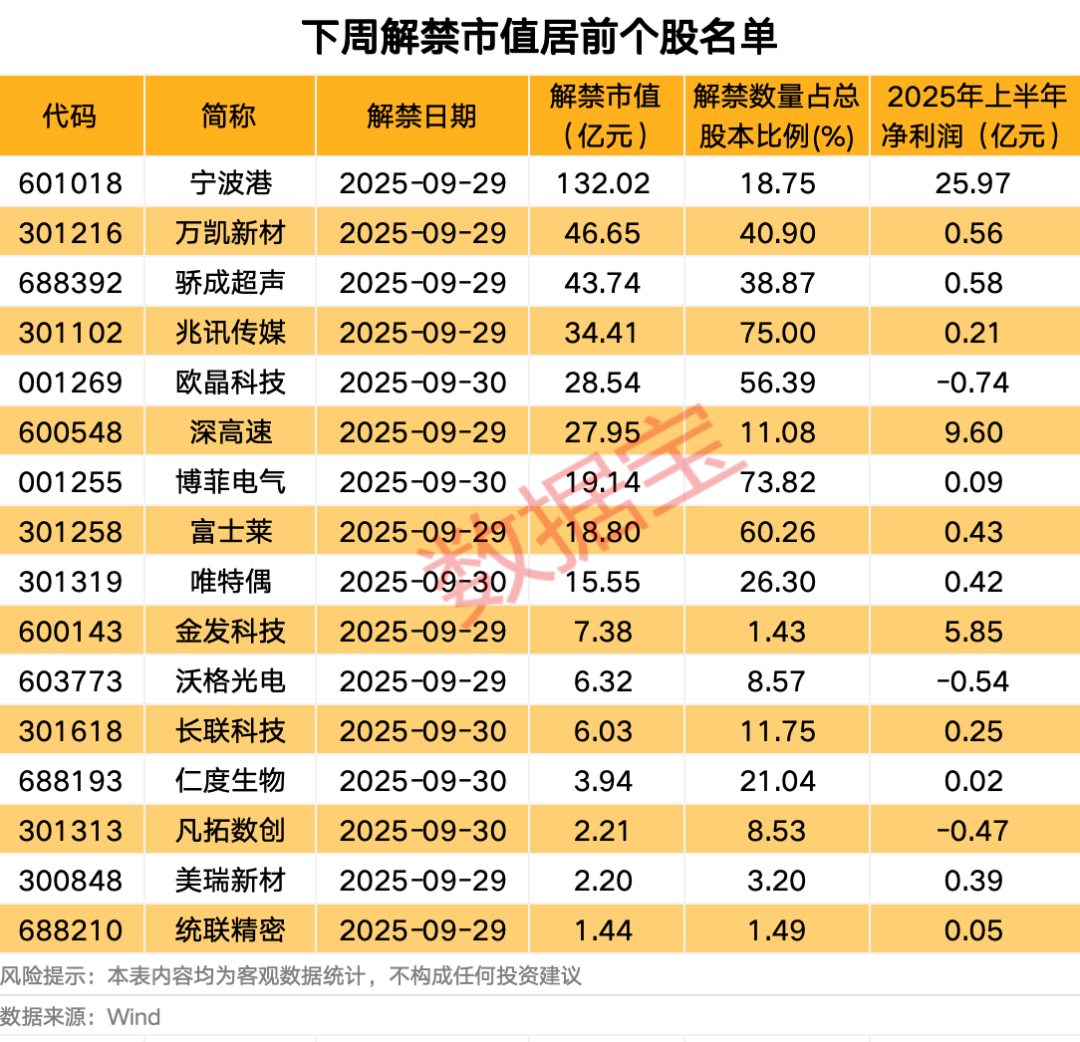 下周解禁市值400.81亿元。 下周36股面临解禁 下周2个交易日将有36只股解禁,按照最新收盘价计算,合计解禁市值400.81亿元。 宁波港下周将有36.47亿股上市流通,主要为定向增发机构配售股份,解禁市值达132.02亿元。 万凯新材的解禁规模次之,下周将有2.3亿股上市流通,解禁股主要为首发原股东限售股份,解禁市值达46.65亿元。 相比之下,长虹能源、兰州银行、彩虹集团、益方生物-U等8股的解禁压力较小,解禁市值均不足千万元。 从解禁比例来看,兆讯传媒、博菲电气、富士莱、欧晶科技的解禁比例居前,均超50%。 7只解禁股上半年业绩亏损 下周将要解禁的这36只股票,9月以来股价平均上涨0.64%。唯特偶、统联精密的股价涨幅居前,月内分别上涨59.4%、41.67%。唯特偶下周将有0.63亿股面临解禁,解禁市值15.55亿元。统联精密下周将有0.02亿股面临解禁,解禁市值1.44亿元。 股价下跌的个股中,广咨国际、爱科赛博、仁度生物、益方生物-U的股价跌幅居前,其中益方生物-U的跌幅最大,9月以来累计下跌18.31%,公司下周将有2.06万股面临解禁,解禁规模64.93万元。 下周解禁股中,8股月内获得机构调研,希荻微下周将有1261.14万元市值规模面临解禁,公司月内收获51家机构调研,公司已构建“电源管理+端口保护+视觉感知+触控传感”等多元化的产品矩阵,产品应用以消费电子为主,并逐步向汽车、计算、存储和工业等前沿领域延伸。 骄成超声月内获得36家机构调研,公司表示,在功率半导体领域,公司有超声波端子焊接机、超声波PIN针焊接机、超声波键合机、超声波扫描显微镜等全工序超声波解决方案,并均已实现批量出货。在该领域,公司与上汽英飞凌、中车时代、振华科技、宏微科技、士兰微、芯联集成等知名企业保持良好合作。 一般而言,解禁的利空影响对于业绩亏损或下滑的个股要显著大于绩优股。下周面临解禁的个股中有7股上半年业绩亏损,其中沃格光电、安达智能、欧晶科技、益方生物-U的亏损规模居前,均超5000万元。 声明:数据宝所有资讯内容不构成投资建议,股市有风险,投资需谨慎。 校对:杨舒欣 |