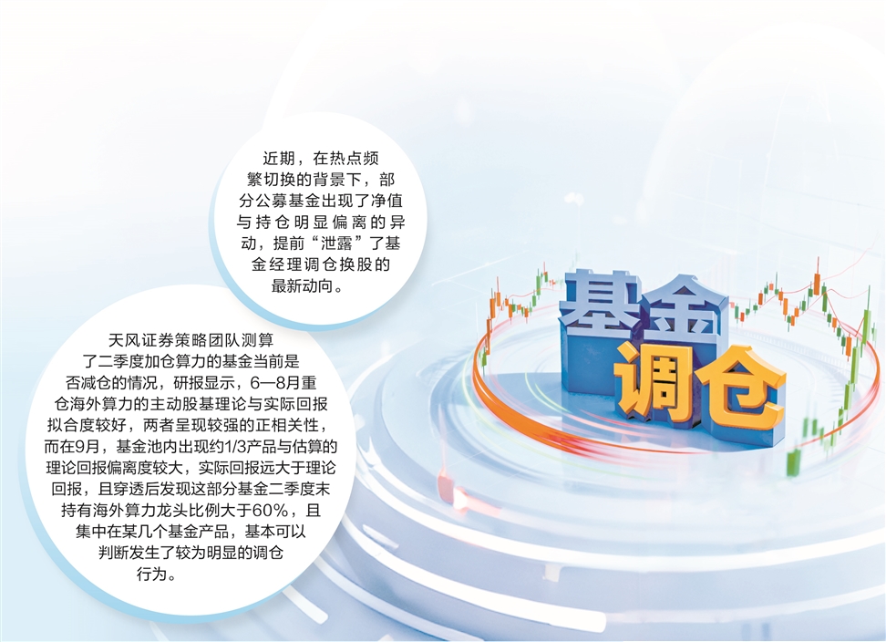 证券时报记者 裴利瑞 9月以来,A股市场风云变幻,此前由AI算力一枝独秀的格局被打破,固态电池、机器人、有色金属、游戏等板块轮番登场,市场轮动明显加速。 在热点频繁切换的背景下,部分公募基金出现了净值与持仓“跑偏”现象,提前泄露了基金经理调仓换股的最新动向。 重仓算力的基金筹码松动 今年以来,AI算力无疑是市场最耀眼的明星。然而,随着相关概念股股价的持续上涨,市场多空分歧也日益加剧,一些此前重仓算力的基金出现了明显的调仓迹象。 以信澳优势产业混合基金为例,截至今年二季度末,该基金重仓了胜宏科技、新易盛、生益电子等光模块、PCB龙头。但在9月15日,生益电子下跌超3%,新易盛、胜宏科技均下跌超2%,在此情况下,Wind估算信澳优势产业混合基金的当天涨跌幅约-1.42%,而实际情况却是该基金的净值在9月15日上涨了1.91%。 再比如,永赢科技智选混合基金凭借重仓新易盛、中际旭创、天孚通信、胜宏科技、沪电股份等海外算力龙头,以189.58%的收益率暂列今年业绩第一,却也在近期频频走出和重仓股不一样的走势。9月15日,海外算力概念股集体大跌,Wind估算永赢科技智选混合基金的当天跌幅约2.45%的情况下,该基金净值在9月15日实际仅下跌了0.94%;相反,9月11日,海外算力股集体大涨,新易盛、中际旭创、天孚通信、胜宏科技等重仓股涨幅均超过13%,Wind估算该基金的当天涨幅约11.5%,但该基金当日净值上涨6.15%,再次与估算净值涨幅产生较大偏差。 财通价值动量也在近期显现出一定的调仓迹象。截至今年二季度末,该基金重仓持有新易盛、生益电子、天孚通信、中际旭创、工业富联等算力概念股,9月22日,新易盛、天孚通信、中际旭创均下跌,Wind估算基金涨幅约0.25%,但该基金当天净值却上涨2.1%。 天风证券策略团队测算了二季度加仓算力的基金当前是否减仓的情况,研报显示,6—8月重仓海外算力的主动股基理论与实际回报拟合度较好,两者呈现较强的正相关性,而在9月,基金池内出现约1/3产品与估算的理论回报偏离度较大,实际回报远大于理论回报,且穿透后发现这部分基金二季度末持有海外算力龙头比例大于60%,且集中在某几个基金产品,基本可以判断发生了较为明显的调仓行为。 部分消费基金“割肉”换仓 除了备受瞩目的AI算力板块,前期持续低迷的消费赛道也出现了“割肉”换仓的迹象。 比如,南华瑞盈是一只重仓消费股的基金,截至二季度末的前五大重仓股分别为若羽臣、小商品城、万辰集团、盐津铺子、中宠股份。 9月26日,在上述五大重仓股均上涨,Wind估算基金涨幅约0.3%的情况下,南华瑞盈却大跌3.47%;如果再拉长时间来看,该基金前十大重仓股在过去20个交易日均为下跌趋势,但基金净值却涨了12.05%,基金持仓或许早已换血。 值得一提的是,南华瑞盈的基金经理徐超在近期公开表达了对人形机器人、固态电池的看好,认为人形机器人在四季度或将催化云集、节奏连贯,成熟程度以及量产能力或被市场低估,而锂电池及固态电池龙头标的三季报景气度较为确定,甚至存在超预期的可能。 再以信澳品质回报为例,截至二季度末,该基金重仓了燕京啤酒、新乳业、若羽臣等消费股,且前十大重仓股中有8只均在9月呈现下跌趋势,其中新乳业下跌近15%,但该基金自9月以来却上涨了约8%,大概率已经调仓。 该基金经理邹运曾表示,自己看好两大内需方向:一是中国品牌崛起,伴随着国货心智觉醒,一批国货公司开始通过新产品、新品牌、新场景焕发出新的生机;二是有产品力显著升级或者运营思路创新的泛消费类公司,分布在传媒、建材、零售、服务业等。该基金在今年二季度加仓了完美世界、影石创新,已经显现出泛消费的布局趋势。 基金经理寻找边际变化 基金净值的异动,反映了当前A股市场极致的结构性行情和板块间的快速轮动,面对结构性行情,是随波逐流还是继续坚守,成为摆在每位基金经理面前的难题。 有基金分析人士指出,当前指数强、主题轮动快的行情,对主动管理提出了风格上的挑战。部分坚持重仓消费或采用低换手策略的产品,容易在风格快速切换中短期落后,相比之下,一些新锐基金经理之所以能够脱颖而出,正是因为他们较早识别并押注了政策支持的科技创新方向,同时在调仓节奏上保持了进攻性,从而在指数普涨的基础上放大了回报弹性。 “今年的市场结构性特征非常明显,甚至有些极致,在这种环境下,投资需要更加关注景气度的变化,并做出一些动态调整。”上海一位权益基金经理表示,“虽然长期坚持自己的投资框架很重要,但组合的构建需要动态地去看待,不能过于僵化。如果市场的主流逻辑发生了变化,投资策略也需要相应地进行调整和优化,从前期低迷的板块中撤出,转向景气度更高的方向。” 不过,随着算力产业链已经积累了较多涨幅,也有基金经理开始寻找新的边际变化和投资方向。 景顺长城股票投资部基金经理孟棋表示,中期业绩期过后,随着市场估值的整体提升,预计个股分化拉大,景气方向仍然集中在AI算力相关方向,但是新的边际变化可能体现在端侧,例如AR眼镜以及苹果产业链等。 汇丰晋信科技先锋基金经理陈平表示,最看好的领域还是跟AI算力相关的资产,尤其是海外算力,PCB、液冷等都深度受益于全球AI产业链的需求爆发,但与此同时,在当前阶段,AI逐渐跟中国半导体关联加深,如AI端侧的需求,很多中