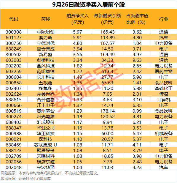 三季报披露将于10月15日开启 三季度即将收官,上交所及北交所公司三季度预约披露时间表出炉。 上交所率先披露三季报的是力合微、小商品城、我乐家居,将于10月15日公布三季报,北交所最先公布三季报的是民士达,将于10月16日披露三季报,其次是宁新新材,将于10月20日披露三季报。 统计显示,截至目前,近30家公司发布了前三季业绩预告,预计净利润增幅较高的有兄弟科技、长川科技、皖维高新、中泰股份、吉宏股份等。 新股提示:道生天合今日申购 道生天合今日(9月29日)开启申购,公司此次发行总数为13188.00万股,其中网上发行2769.45万股,申购代码780026,申购价格5.98元 ,发行市盈率为29.05倍。 公司致力于新材料的研发、生产和销售,产品围绕环氧树脂、聚氨酯、丙烯酸酯和有机硅等高性能热固性树脂材料,形成了风电叶片用材料、新型复合材料用树脂和新能源汽车及工业胶粘剂三大系列产品,主要为风电、新能源汽车、储能、氢能等新能源领域,以及航空、油气开采、电力、模具制造等领域的国内外客户提供系列化、差异化和精细化的新材料产品综合解决方案。 公司风电叶片用环氧树脂产品已经基本实现了对主流风机叶型的全覆盖,根据中国石油和化学工业联合会出具的说明函,2022—2024年公司“风电叶片用环氧树脂系列”销量位居全球首位,同时,公司“风电叶片用结构胶”销量位居国内第2、全球第3。 25股融资客加仓均超亿元 截至9月26日,市场融资余额合计2.41万亿元,较前一交易日减少193.55亿元。 具体到个股,9月26日获融资净买入千万元以上的有373只,其中25只融资净买入均超亿元。中际旭创融资净买入额居首,当日净买入5.97亿元,其次是赛力斯、宁德时代,融资净买入金额分别为5.91亿元、4.80亿元,融资净买入金额居前的还有晶合集成、新易盛、剑桥科技等。 分行业统计,获融资客净买入超亿元个股中,电子、电力设备、通信等行业最为集中,分别有8只、5只、3只个股上榜。 3家公司获超50家机构扎堆调研 近两个交易日(9月25日至9月26日)共有76家公司公告机构调研记录。其中,10家公司获不低于20家机构扎堆调研,德赛西威、汉钟精机、肇民科技均有超50家机构调研。 6股获重要股东大手笔增持 以股权变动日为基准进行统计,近5个交易日(9月22日~9月26日)共有22家公司股份获重要股东增持,累计增持数量达3.04亿股,增持金额合计29.30亿元。 从增持金额来看,近5日增持金额在亿元以上的有6家,增持金额最多的是南京银行,其间累计增持1.08亿股,增持金额合计12.17亿元;其次是华菱钢铁,增持量为6908.63万股,增持金额4.51亿元;中国宝安近5日获股东增持2.92亿元,增持金额位居第三。 声明:数据宝所有资讯内容不构成投资建议,股市有风险,投资需谨慎。 校对:王锦程 |