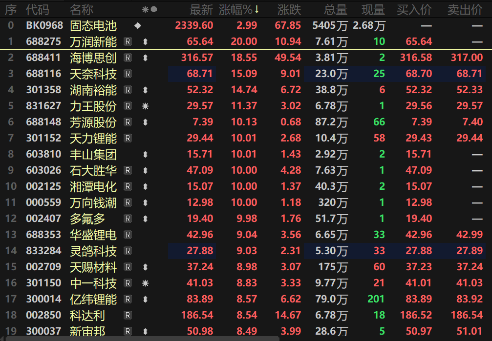SMM 9月29日讯:9月29日早间,电池指数盘中快速走高,指数盘中一度涨逾4%,个股方面,万润新能盘中20CM涨停,芳源股份、湖南渝能、力王股份等多股涨逾10%,天际股份盘中涨停,亿纬锂能、天力锂能等多股纷纷跟涨。 固态电池板块盘中也一同拉涨,指数一度涨逾2%。个股方面更是掀起了小规模涨停潮,丰山集团、石大胜华、湘潭电化、万向钱潮、多氟多等超5股涨停,天赐材料、华正新材等多股纷纷跟涨。 不仅如此,储能板块今日表现也十分活跃,易成新能盘中20CM涨停,另外,卧龙新能、佛燃能源、嘉泽新能等近9股盘中封死涨停板。 消息面上,据央视财经报道,目前国内储能电芯的需求十分强劲。头部电池企业均表示工厂已处于满产状态,一些订单已经排到明年年初。此外,根据《专项行动方案》提出的目标,到2027年,中国新型储能装机规模将达到1.8亿千瓦以上,这将拉动新增项目投资约2500亿元。 中信建投在其发布的研报中表示,继续看好储能、锂电板块景气度抬升。今年以来国内储能需求超预期,核心驱动在于新能源全面入市推动峰谷电价差拉大,加上容量电价政策出台,推动储能IRR提升。储能需求驱动力快速由新能源强制配储转向经济性驱动。海外市场,美国以外市场需求维持高速增长,“大而美”法案核心限制2026年后开工项目,预计装机端需求影响有限。锂电方面,储能需求超预期带来的产业链量利齐升逻辑持续兑现,当前核心矛盾为储能需求持续性是否能够带动26年需求预期在20%的增速上继续上修,关注四季度储能招标、11月底电池企业要货预期以及2026年电动车以旧换新政策及锂电排产情况。 而固态电池方面,近期也利好频传,日前,清华大学化工系教授张强领衔的团队在锂电池聚合物电解质研究领域取得重要进展,张强团队提出“富阴离子溶剂化结构”设计新策略,成功开发出一种新型含氟聚醚电解质。该电解质通过热引发原位聚合技术,有效增强了固态界面的物理接触与离子传导能力,显著提升了锂电池的耐高压性能和界面稳定性。 且值得一提的是,采用该电解质组装的富锂锰基聚合物电池表现出一系列优异的电化学性能,在满充状态下可顺利通过针刺与120摄氏度热箱(静置6小时)安全测试,未出现燃烧或爆炸现象,预计未来该研究成果有望为成熟的固态电池产品研发提供重要技术参考。 开源证券表示,当前固态电池正逐步从实验室阶段到量产验证阶段发展,预计2025年底小批量装车试验,2026-2027年普遍装车试验,此外,低空、机器人、AI等新兴应用场景打开固态电池市场空间,产业化落地有望提速。建议关注固态电池板块后续的行情表现。 此外,政策面上对固态电池也有助力,9月28日,工业和信息化部等八部门印发《有色金属行业稳增长工作方案(2025—2026年)》,其中提到,要提升稀有金属应用水平。围绕集成电路、工业母机、低空经济、人形机器人、人工智能等新兴产业,加快高纯镓、钨硬质合金、全固态电池材料等高端产品应用验证,推进超导材料、液态金属、高熵合金等前沿材料的创新应用。鼓励下游用户企业、科研机构等单位开放应用场景,打造应用场景典型案例,培育新兴市场。 此外,近期2025中国动力电池材料产业链大会暨第六届中国固态电池技术大会召开,不少业内人士就固态电池的相关发展情况作出分享。《科创板日报》表示,随着市场需求的持续增加和固态电池技术不断进步与突破,行业预计全球固态电池出货量在2025年和2030年将分别达到10GWh和614.1GWh,市场空间继续扩大。 与此同时,尽管其未来前景广阔,但全固态电池短期内仍面临短期难量产、高成本、产业链不完整、高界面阻抗等多重挑战。 而在SMM于9月26日组织的CLNB2025亚洲电池材料合作沙龙·韩国站-三元电池技术路线专题论坛上,SMM咨询研究项目经理王永杰表示,SMM预计,2025年全球固态电池的渗透率在0.1%左右,预计2030年全固态电池渗透率有望达到4%左右,2035年,SMM预计全球固态电池的渗透率或将逼近10%。分不同的消费领域来看,新能源汽车行业,预计到2030年,固态电池的渗透率有望达到5%左右;储能板块,预计到2030年,固态电池在储能领域的渗透率或在2%左右,主因储能市场对电芯成本敏感度较高,仅部分价格敏感度较低且极度注重安全性的场景使用固态电芯,短期内需求量有限;消费(e.g. 3C数码, eVOTL)板块,预计到2030年固态电池的渗透率有望达到12%左右。》点击查看详情 财通证券表示,2025年以来,固态电池技术持续获突破,多家车企计划于2027年左右开始搭载全固态电池,行业产业化进程加快。随着中试线的陆续落地以及锂电扩产周期的重启,设备企业基本面有望持续改善,继续看好产业周期与技术进步共振。 中信建投证券也表示,固态电池作为下一代高性能电池技术,凭借高能量密度、高安全性等显著优势,正加速从实验室走向产业化。随着政策红利释放、市场需求升级和技术持续迭代,全球固态电池产业已从实验室研发进展到商业化落地的关键阶段。中国在固态电池领域政策支持力度大,随着行业技术标准体系逐步完善,2027年前后有望实现全固态电池小批量生产。 此外,能源金属板块今日也一同攀升,指数盘中一度涨逾4%。个股方面,赣锋锂业、华友钴业、天花新能、腾远钴业等多股涨逾5%,中矿资源、寒锐钴业、格林美等纷纷跟涨。 消息面上,在9月28日工信部等八部门印发的《有色金属行业稳