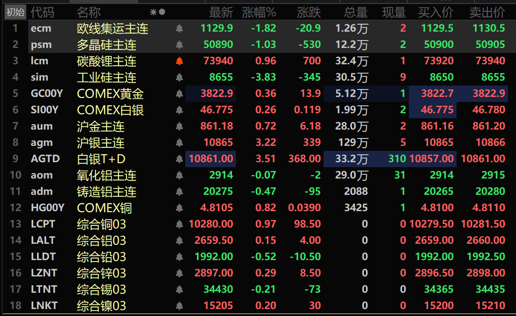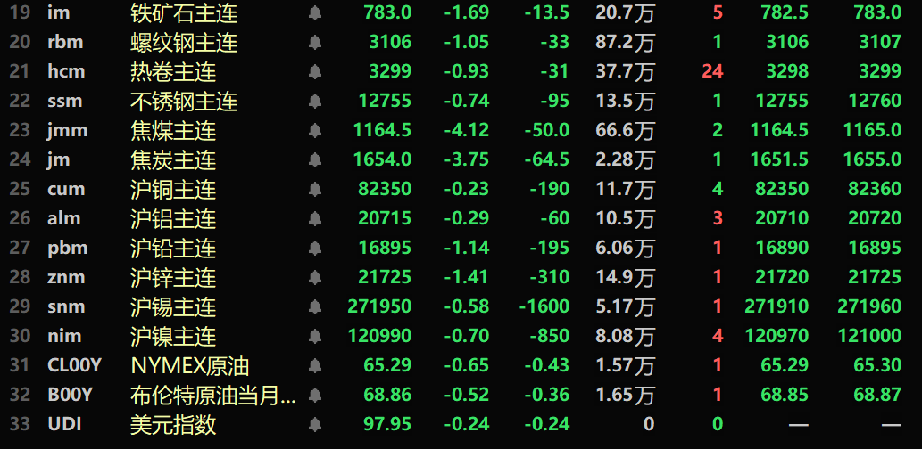 SMM9月29日讯: 金属市场方面: 截至午间收盘,内盘基本金属全线下跌,沪铜跌0.23%。沪铝跌0.29%,沪铅跌1.14%,沪锡跌0.58%,沪镍跌0.7%,沪锌跌1.41%。 此外,铸造铝主连期货跌0.47%,氧化铝主连跌0.07%。碳酸锂主连涨0.96%,工业硅主连跌3.83%。多晶硅主连跌1.03%。 黑色系均飘绿,铁矿跌1.69%,螺纹跌1.05%,热卷跌0.93%,不锈钢跌0.74%。双焦方面:焦煤主力合约跌4.12%,焦炭主力合约跌3.75%。 外盘金属方面,截至11:38分,LME金属多飘红,伦铜涨0.97%,伦铝涨0.15%,伦锌涨0.29%,伦铅跌0.52%,伦镍涨0.2%,伦锡跌0.21%。 贵金属方面,截至11:38分,COMEX黄金涨0.36%,盘中刷新历史新高至3828.5美元/盎司;COMEX白银涨0.26%,盘中刷新历史新高至47.045美元/盎司。内盘贵金属方面:沪金主连涨0.72%,盘中刷新历史新高至865.28元/克;沪银主连涨3.22%,盘中刷新历史新高至10988元/千克。 全球最大的黄金支持交易所交易基金SPDR Gold Trust称,其持仓量从周四的996.85吨增至周五的1,005.72吨,增幅为0.89%。 巴克莱银行策略师上周日在报告中表示,相对于美元和美国国债,黄金价格似乎没有被高估;考虑到美联储可能失去独立性的风险性质,黄金价格应该包含一定程度的美联储相关溢价。今年以来金价已飙升逾40%,受央行需求和美联储恢复降息刺激,金价迭创新高。金价势将连续三个季度录得上涨。包括高盛集团和德意志银行在内的银行预计涨势将会持续。 截至午间收盘,欧线集运主力合约跌1.82%,报1129.9点。 截至9月29日11:38分,部分期货午间行情: 》9月29日SMM金属现货价格 现货及基本面 铜:今日广东1#电解铜现货对当月合约40元/吨-升水100元/吨,均价升水70元/吨持平上一交易日;湿法铜报贴水40元/吨-贴水20元/吨,均价贴水30元/吨持平上一交易日。广东1#电解铜均价82190元/吨较上一交易日跌300元/吨,湿法铜均价为82090元/吨较上一交易日跌300元/吨。现货市场:周末归来广东库存继续下降,目前已经8连降,节前下游生产积极性较高是原因之一……》点击查看详情 宏观面 国内方面: 【工信部等八部门印发《有色金属行业稳增长工作方案(2025—2026年)】工业和信息化部等八部门印发《有色金属行业稳增长工作方案(2025—2026年)》,其中提到,2025—2026年,有色金属行业增加值年均增长5%左右,经济效益保持向好态势,十种有色金属产量年均增长1.5%左右,铜、铝、锂等国内资源开发取得积极进展,再生金属产量突破2000万吨,高端产品供给能力不断增强,绿色低碳、数字化发展水平持续提升。方案提到,统筹利用超长期特别国债等现有资金渠道,支持有色金属资源开发、高端材料攻关、节能减污降碳、数字化改造等。用好新材料首批次保险补偿等政策,支持初期市场培育。发挥人民银行信贷市场服务平台、国家产融合作平台作用,引导银行等金融机构按照市场化法治化原则,精准有效支持符合行业规范、自律公约等条件的项目建设和升级改造。用足用好现有减税降费政策。适时丰富重要有色金属期货交易品种和金融衍生品种。做好重要品种国家储备。加强相关国有企业考核引导,更多鼓励资源开发、技术创新和成果转化。实施制造业人才支持计划,建好用好国家卓越工程师实践基地,培育一批高水平技术、技能、管理人才。》点击查看详情 【住建部:保质保量完成城市危旧房改造年度计划】住房城乡建设部近日召开全系统安全生产视频调度会议。会议强调,按照安全生产治本攻坚三年行动工作要求,对各项工作进行再落实、再部署,加快推进全国城市燃气管道安全专项治理行动、城镇燃气安全专项整治,保质保量完成城市危旧房改造年度计划,做好房屋市政工程施工安全管控,加强建设工程消防设计审查验收管理,全力以赴保障城市运行安全,确保按时完成年度目标任务。要切实做好中秋国庆假期安全防范工作,紧盯重点领域、主要场所、关键部位,严密防控安全风险。 【中国家用电器协会倡议:杜绝无序低价竞争 坚决不搞低于成本价倾销】中国家用电器协会发布关于加强家电行业自律与公平竞争的倡议:1.坚持公平竞争、相互尊重、协同共享、高质量发展的原则,共同营造公平竞争的市场环境,促进家电行业健康发展;2.构建卓越的科技创新能力,尊重知识产权,以科技创新引领行业发展;3.以用户需求为导向,严控产品质量标准,实现优质产品供给;4.全面加强售前咨询、售中安装、售后维修服务水平,向广大消费者提供优质服务;5.严格落实《保障中小企业款项支付条例》,构建“分工协作、互利共赢”的产业生态。同时,坚决反对各类不正当竞争行为。 【中汽协:8月汽车商品进出口总额为258.1亿美元 环比增长3.3%】据中国汽车工业协会整理的海关总署数据显示,2025年8月,汽车商品进出口总额为258.1亿美元,环比增长3.3%,同比下降0.3%。其中进口金额41.7亿美元,环比下降7.4%,同比下降38.4%;出口金额216.4亿美元,环比增长5.6%,同比增长13.2%。2025年1-8月,全国汽车商品累计进出口总额为1820.1亿美元,同比下降1.2%。其中进口金额305.0亿美元,同比下降33.1%;出口金额1515.2亿美元,同比增长9.2%。 【央行公开市场今日净投放481亿元】央行今日开展2886亿元7天逆回购操作,操作利率为1.40%,与此前持平。因今日有2405亿元7天期逆回购到期,当日实现净投放481亿元。 ►9月29日银行间外汇市场人民币汇率中间价为1美元对人民币7.1089元 美元方面: 截至11:38分,美元指数跌0.24%,报97.95。 美国商务