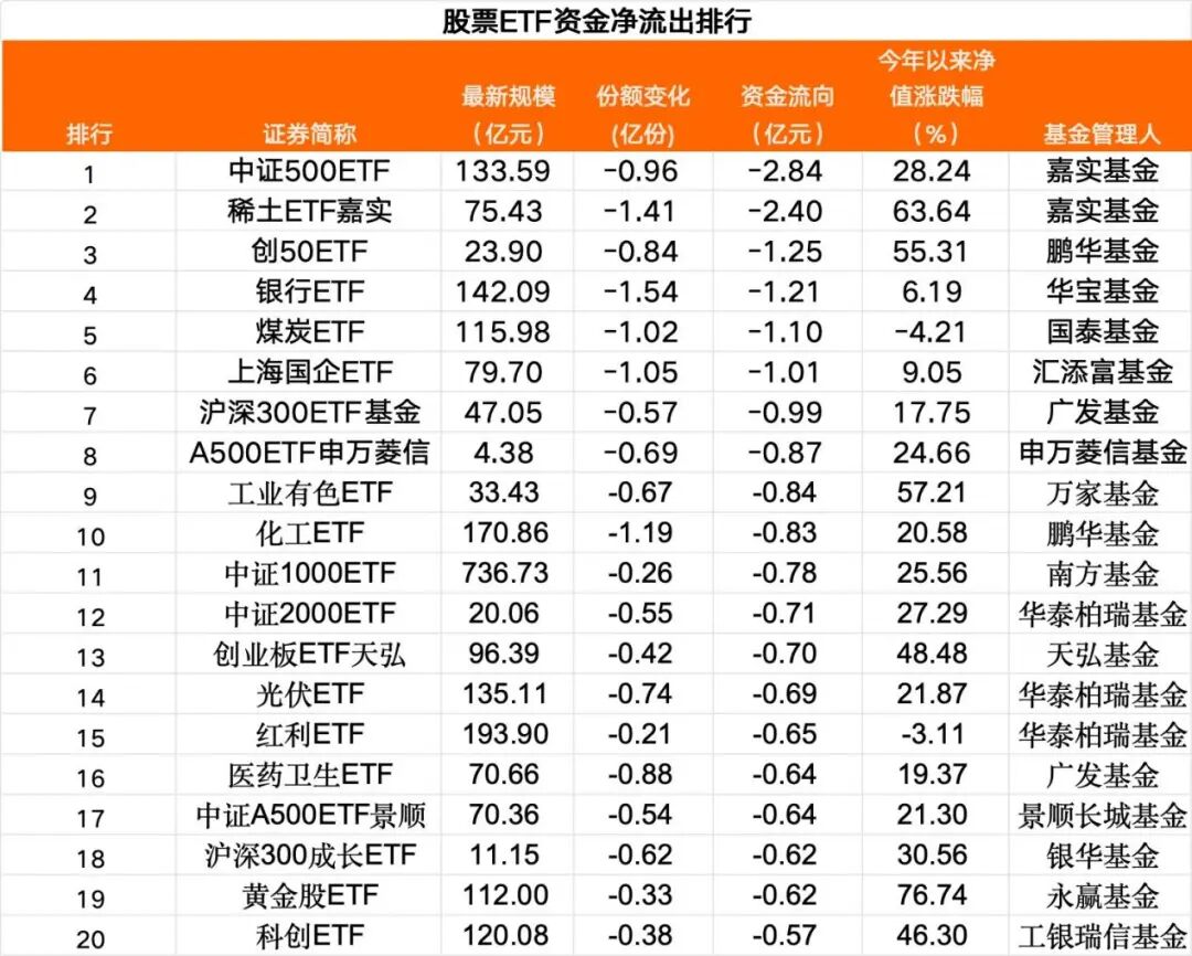 9月26日(上周五),A股三大指数集体下跌,创业板跌幅超过2.5%,两市成交额合计约2.15万亿元。 上周五股票ETF资金净流入超220亿元,跟踪中证A500、创业板指数等宽基的ETF,以及半导体、人工智能、机器人等行业主题ETF净流入居前。 过去一周,A股市场整体震荡上行,股票ETF资金净流入超300亿元,仅中证A500指数相关ETF净流入便超百亿元;9月以来更是“吸金”近1000亿元,证券、港股互联网、电池、机器人、黄金有色等行业ETF净流入较多,跟踪沪深300、科创板、创业板等宽基的ETF成“失血”主阵营。 上周五股票ETF净流入超220亿元 据Wind数据统计,截至9月26日,全市场1218只股票ETF(含跨境ETF)总规模为4.46万亿元。 据测算,当日股票ETF净流入超220亿元。 从资金净买入排行榜看,当日净流入1亿元以上的股票ETF有59只,部分宽基ETF净流入金额居前。其中,易方达创业板ETF、A500ETF华泰柏瑞、中证A500ETF富国位居前三,资金净流入均超12亿元。 来自易方达基金的数据显示,9月26日,以下方向资金净流入居前,分别为中证A500(净流入52.2亿元)、半导体(净流入37.0亿元)、创业板(净流入23.0亿元)、人工智能(净流入20.3亿元)、机器人(净流入17.6亿元)。 另据Wind统计,资金净流入前20大股票ETF中,中证A500ETF有7只,创业板、科创板相关ETF各有2只和1只,科创半导体芯片ETF、机器人ETF各有2只。从5日角度观测,近期资金流入中证A500指数相关ETF超104亿元,半导体材料设备相关ETF超42亿元。 头部基金公司中,9月26日,易方达基金旗下创业板ETF净流入13.9亿元,A500ETF易方达净流入6.6亿元,人工智能ETF净流入6.5亿元,半导体设备ETF易方达净流入2.4亿元,恒生科技ETF易方达净流入2.2亿元,科创板50ETF净流入0.8亿元。科创板50ETF最新规模超740亿元,位居同类产品第一。 华夏基金ETF中,9月26日,机器人ETF和游戏ETF单日净流入居前,分别净流入8.69亿元和6.63亿元,最新规模分别达220.15亿元和101.89亿元,对应跟踪指数近一月日均成交额分别为21.12亿元和8.07亿元。科创半导体ETF和A500ETF基金分别净流入6.24亿元和5.46亿元,科创50ETF、上证50ETF、科创人工智能ETF华夏净流入都超2亿元。 部分宽基ETF和行业ETF净流出居前 9月26日,股票ETF整体净流出资金不多。 从资金净流出情况来看,上周五当天,股票ETF中仅6只资金净流出金额超过1亿元,中证500、沪深300等宽基ETF,以及稀土、银行等行业主题ETF“失血”较多。 在净流出前20大股票ETF中,除了中证500和创50等宽基ETF,稀土、银行、煤炭、国企等行业主题ETF净流出金额较多。 过去一周,A股市场震荡上行,主要宽基指数普遍上涨。当周股票ETF资金净流入超300亿元,中证A500、创业板等宽基ETF,以及机器人、芯片、AI、证券净流入居前。9月以来,股票ETF“吸金”更是接近千亿元,证券、港股互联网、电池、机器人、黄金有色净流入较多,沪深300、科创板、创业板等宽基ETF成“失血”主阵营。 富国基金表示,短期来看,目前国内基本面预期未有明显变化,政策层面保持一定战略定力,叠加国庆假期临近的“节前效应”,节前若无明显催化,市场或以震荡波动为主。中长期视角下,随着人工智能等重要新质科创产业主线稳步推进,消费政策、“反内卷”政策及其配套的需求侧政策逐步落地,A股盈利修复基础有望得到巩固;同时在存款搬家、外资回流、融资资金等的共振下,A股不改震荡上行趋势。 银河基金认为,当前市场呈现分化格局,主要原因在于部分板块前期涨幅较大,同时面临技术性调整压力。往后看,或可关注公用事业板块及科技成长板块的发展。 |