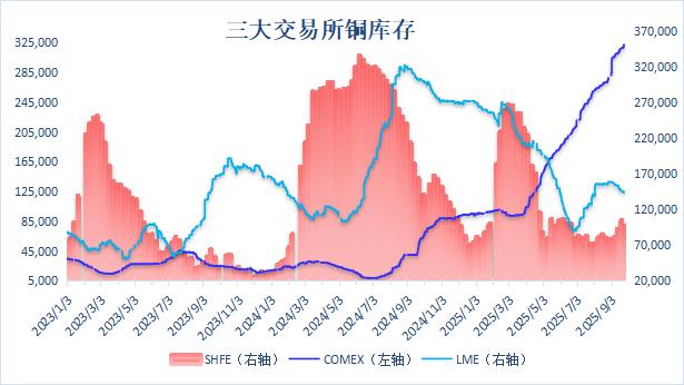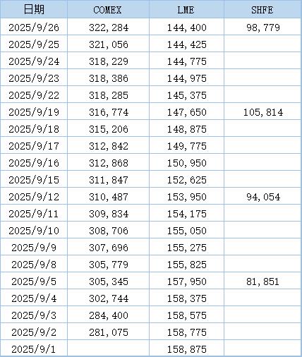伦敦金属交易所(LME)公布数据显示,上周伦铜库存延续下行趋势,最新库存水平为144,400吨,刷新近两个月新低。 上海期货交易所最新公布数据显示,9月26日当周,沪铜库存有所回落,周度库存金属6.65%至98,779吨,位于三个月相对高位。国际铜库存减少50吨至12,277吨。 上周,纽铜库存继续增加,最新库存水平为322,284吨,增至2003年6月下旬以来新高。 注:一般来说,国内外交易所库存不断下降将对期价形成支撑,反之,则对期价有所利空。 2023年以来三大交易所铜库存对比 (文华综合) 作为全球最大的铜消费国,中国产业链面临三大挑战:上游资源对外依存度攀升、中游加工环节产能过剩、下游需求受高铜价抑制。为助力行业应对变局,上海有色网携手铜产业链企业联合编制《2026中国铜产业链分布图》中英双语版,点击此链接即可免费领取铜产业链分布图:https://s.wcd.im/v/470opZ19l/。 SMM联合制作联系人 刘明康 156 5309 0867 liumingkang@smm.cn |