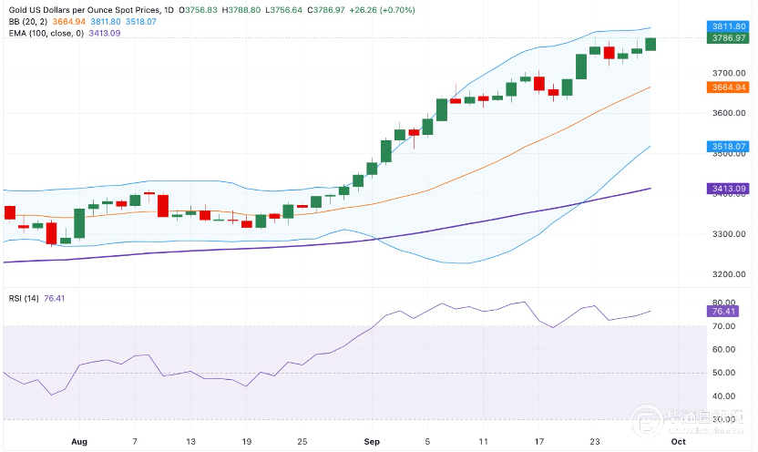 【华通白银网9月29日讯】•在周一的早期欧洲时段,金价升至历史新高。 •美国政府可能的停摆促进了避风港的流动,有利于金价。 •交易员们正在等待周一晚些时候的美联储演讲,以获得新的动力。 在周一的亚洲交易中,黄金价格的上行扩大到创纪录的高位,高于3,800美元的心理水平。随着美国政府面临停摆的风险,贵金属上涨。此外,美国通胀数据符合预期,加强了美国联邦储备委员会(Fed)今年晚些时候可能会继续降息的赌注。较低的利率可以降低持有黄金的机会成本,支持不屈服的贵金属。 交易员将在周一晚些时候密切关注Fedspeak。美联储行长Christopher Waller,克利夫兰美联储主席Beth Hammack,St.路易斯美联储主席阿尔贝托·穆萨勒姆、纽约美联储主席约翰·威廉姆斯和亚特兰大美联储主席拉斐尔·博斯蒂克将发表讲话。美联储官员的任何鹰派言论都可能抬高美元(USD)并破坏以美元计价的商品价格。 随着政府可能关闭的最后期限迫在眉睫,美国总统唐纳德·特朗普将于周一在白宫会见国会的四位最高领导人。如果没有资助立法,部分政府将在周三关闭,即美国政府2026财年的第一天。 美国经济分析局周五报告称,以美国个人消费支出(PCE)价格指数衡量的美国通胀率从7月份的2.6%上升到8月份的2.7%。这个数字符合市场的共识。 核心PCE价格指数不包括波动的食品和能源价格,8月份同比上涨了2.9%,与7月份的涨幅和分析师的估计持平。 按月计算,PCE和核心PCE分别增长了0.3%和0.2%。 “每月的PCE数据是一致的,尽管个人收入和支出比预期高出十分之一。独立金属交易员Tai Wong说:“这些数据不会阻止美联储在10月的会议上再次谨慎降息。” 根据CME FedWatch工具,市场现在定价为美联储10月降息的几率近88%,12月再次降息的可能性为65%。 黄金技术分析:黄金价格倾向上涨,但超买RSI需要谨慎对待多头 目前金价交易处于正值区域。从长远来看,贵金属的看涨基调保持不变,价格保持在日线图上关键的100天指数移动平均线(EMA)之上。尽管如此,14天相对强弱指数(RSI)高于中线,接近75.90,表明RSI超买状况。这表明,在定位任何近期黄金上涨之前,不能排除进一步的合并或临时抛售。 金价的关键阻力位在3,800美元-3,810美元区域,代表了布林带的心理水平和上限。高于这个水平的持续交易可能会使黄色金属达到3,850美元。 反之,黄金的初始支撑位为3722美元,是9月25日的低点。低于上述水平的红色烛台可能会暴露出9月19日的低点3632美元。 9月29日,上海华通铂银国标一号银结算价收报于10898元/千克。 白银网 |