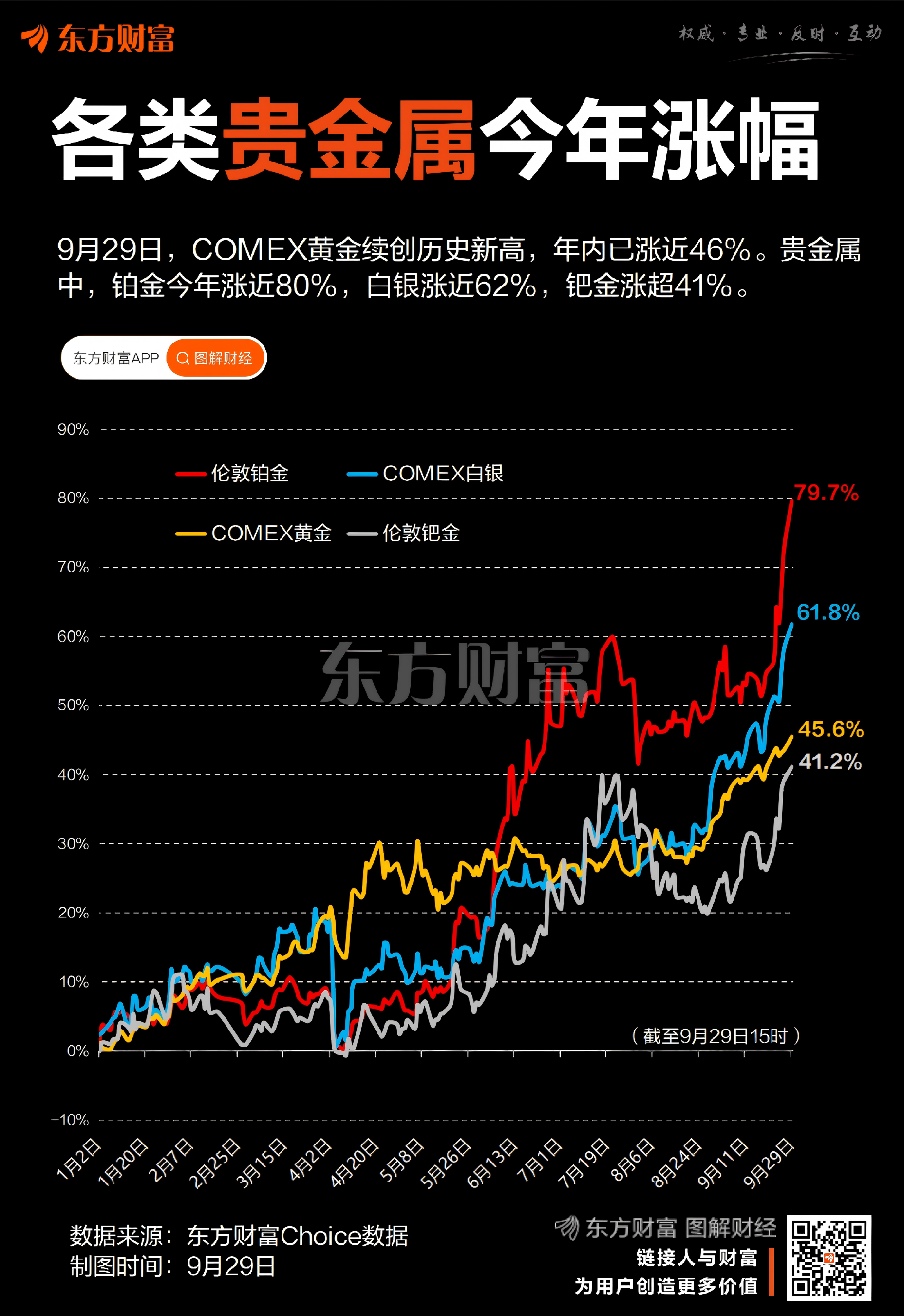 ![]() 在美联储降息、地缘风险加剧等背景下,贵金属市场迎来一轮前所未有的强劲行情。9月29日,COMEX黄金再创历史新高,盘中最高涨至3849美元/盎司。今年每盎司黄金已累计上涨超1200美元,累计涨幅近46%。 业内人士指出,今年黄金的上涨受到多方面因素支撑。首先是美联储9月开启年内首次降息后,市场普遍预计其在接下来三个月内将进一步降息;此外,国际地缘政治风险持续升温推升避险需求,全球黄金ETF持续受到热捧。 除了黄金以外,其他贵金属品种今年也备受投资者青睐。据东方财富Choice数据,今年铂金和白银的涨幅相对黄金更大,铂金最新价已突破1600美元/盎司,年内暴涨近80%,创近12年新高;白银最新价突破47美元/盎司,年内大涨近62%,创近14年新高。 铂金价格暴涨,除了美联储降息以及避险需求外,连续三年结构性短缺也是重要原因。中信期货认为,铂族金属矿山开采难度上升,南非、俄罗斯供应问题具有持续性,南非近几年矿山开采难度上升、成本增加,导致矿企生产意愿较为一般,矿山产量难有明显提升。整体来看,供需紧平衡格局延续。 白银价格的上涨主要是白银贵金属与工业金属双重属性的共同发力。国信期货首席金属分析师顾冯达表示,宏观方面,美联储降息预期持续升温,叠加中东等地缘局势紧张推升避险情绪,共同为白银提供上行动力。行业方面,光伏、新能源汽车及半导体等领域对白银的工业需求保持强劲,白银呈现供不应求格局。 (文章来源:东方财富研究中心) |