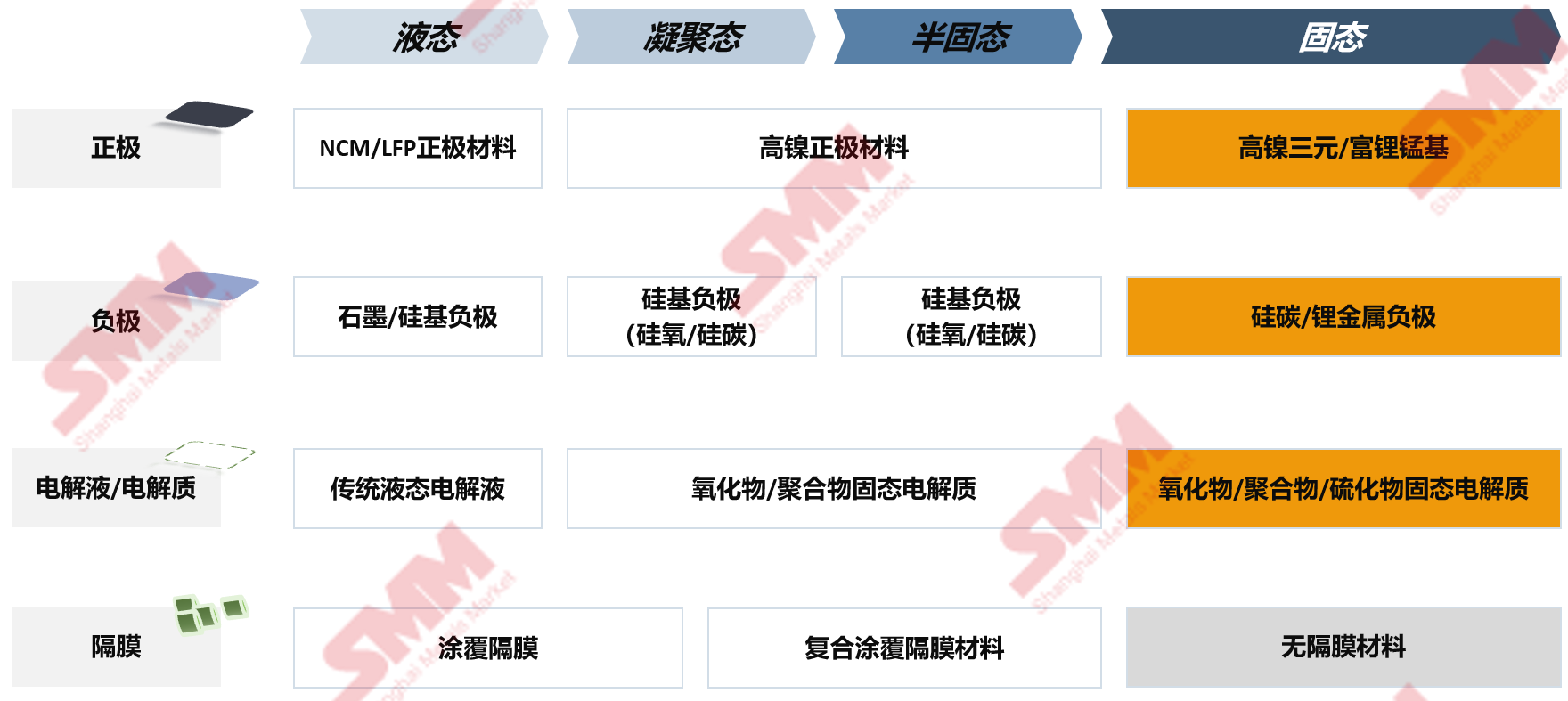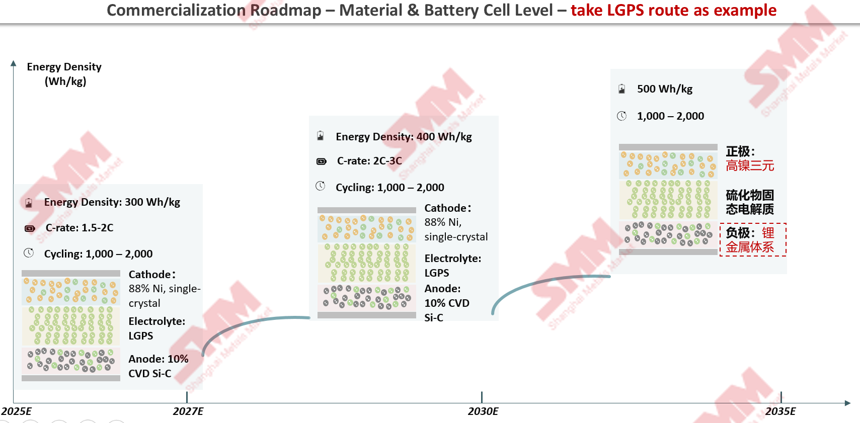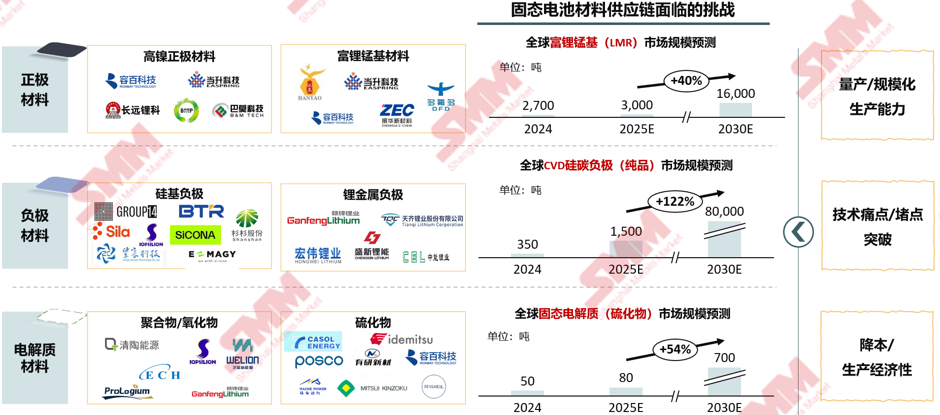 在由SMM组织的CLNB2025亚洲电池材料合作沙龙·韩国站-三元电池技术路线专题论坛上,SMM 咨询研究项目经理 王永杰围绕“液态到固态 下一代三元材料的技术突破与市场重塑”的话题展开分享。她表示,SMM预计,2025年全球固态电池的渗透率在0.1%左右,预计2030年全固态电池渗透率有望达到4%左右,2035年,SMM预计全球固态电池的渗透率或将逼近10%。分不同的消费领域来看,新能源汽车行业,预计到2030年,固态电池的渗透率有望达到5%左右;消费(e.g. 3C数码, eVOTL)板块,预计到2030年固态电池的渗透率有望达到12%左右。 锂电池技术变革趋势-从液态到固态 锂电池未来发展方向在哪里?- 从液态电池到固态电池,能量密度再升级 固态电池未来发展增速如何?(1/2)- 全球全固态2035年渗透率逼近10% 全球锂离子电池需求量方面,SMM预计,2024年到2030年电动车所需的锂离子电池需求量年均复合增长率在11%左右,储能所需锂离子电池需求量年均复合增长率在27%左右,消费电子所需的锂电池的需求量年均复合增长率在10%左右。 2025年全球固态电池的渗透率在0.1%左右,预计2030年全固态电池渗透率有望达到4%左右,2035年,SMM预计全球固态电池的渗透率或将逼近10%。 固态电池未来发展增速如何?(2/2)- 消费场景率先突破,EV潜力最大 分不同的消费领域来看,新能源汽车行业,预计到2030年,固态电池的渗透率有望达到5%左右。主要是因为高端电动汽车对于高安全性和高续航里程的需求,但长期渗透率进一步提升在于规模化及降本逻辑。 储能板块,预计到2030年,固态电池在储能领域的渗透率或在2%左右,主因储能市场对电芯成本敏感度较高,仅部分价格敏感度较低且极度注重安全性的场景使用固态电芯,短期内需求量有限。 消费(e.g. 3C数码, eVOTL)板块,预计到2030年固态电池的渗透率有望达到12%左右,主因3C数码消费电池由于体积限制,对于能量密度要求更高,叠加用户体验升级等因素,成为固态电池商业化落地的试验田,渗透率先突破10%。 …固态电池材料体系如何搭配 固态电池各材料体系如何搭配?- 正极以高镍三元及富锂锰基为主 正极 | 预计富锂锰基材料2030年开始放量,突破万吨级市场规模 市场预测:2025年,富锂锰基市场规模预计增长至3,000吨;2030年,市场规模将增长至16,000吨,增速达40% 2030年增量: •小动力应用:富锂锰基材料与锰酸锂掺混使用,弥补锰酸锂高温存储性能差和循环性能差的缺点 •EV-液态电池应用:预计2027年起,优先与三元材料掺混,降低三元材料成本,同时提高能量密度 •EV-固态电池应用:预计2030年起,富锂锰基材料可作为单一材料,用于全固态电池,成为富锂锰基材料市场主要增量。 负极 | 预计CVD硅碳2025年开始放量,突破千吨级市场规模 市场预测:2025年,CVD硅碳市场规模将大幅增长至1,500吨,增速超过300%;2030年,市场规模将增长至80,000吨 2025年增量: •3C应用:荣耀、华为、VIVO、OPPO等手机应用进一步商业化,渗透率扩大;电动工具逐渐配套 •EV应用:46系电池、固态电池研发持续推进,实验规模放大使得用量增长 •掺杂比例提升:目前整体CVD硅碳掺杂比例为5%-10%,预计2025年提升至15%。 负极 | CVD硅碳产业链进一步完善是关键因素,原料、工艺成熟度持续提升 原料:硅烷气持续降本,多孔碳一致性持续提升 硅烷主要应用于光伏组件、半导体行业,CVD硅碳为新兴增量应用; 硅烷大幅降价主要因为供应大量过剩,预计2025年将延续降价。 多孔碳: 多孔碳性能(孔径、孔容、孔隙率)直接决定硅碳产品性能,目前为非标准品,占CVD硅碳生产成本的 35-45% 考虑到一致性要求,多孔碳由生物质向树脂基转变。生物质多孔碳(如椰壳)的天然孔隙结构使其在形貌、孔结构、一致性方面表现较差,但树脂基多孔碳由于树脂成本更高,价格较高 设备:流化床规格持续增大 中级流化床: 工艺重点在于生产参数控制(温度、时间、气流速率);中试级20KG流化床设备基本成熟,目前约65万元/台,持续降价中 商业级流化床: 大装置(100KG、250KG)预计2025-2026年可逐步落地,目前可能导致硅烷沉积不均匀,且也存在安全性问题,良率、硅烷利用率、安全性等仍待解决。 负极 | 锂金属负极包括纯锂箔、锂铝复合箔、及复合集流体解决方案,厚度是关键 厚度为金属锂负极的关键指标 2种潜在方案:锂金属负极+锂金属及集流体复合解决方案; 技术领先锂金属负极企业产品厚度更薄; 二三梯队企业仅能生产复合型锂金属负极(如锂+铝复合箔),为减弱纯锂带的不稳定性困难点。 负极 | 锂金属厚度与挤压、轧制、覆合等工艺息息相关 固态电解质 | 硫化物综合表现最佳,但需突破成本问题 …固态电池发展仍面临重重挑战 固态电池目前面临哪些挑战?- 供应链 固态电池目前面临哪些挑战?- 材料及生产制备 材料及生产制备方面,固态电池面临固态电解质成膜问题、硫化物电解质反应(与硅基负极)问题、硫化物固态电解质高温分解H2S问题、固固界面接触问题、生产环境控制问题、压力设备控制问题、运行压力控制(装车运行压力控制)问题、锂金属:充电过程不均匀沉积导致枝晶的问题以及硅基负极:膨胀等问题。 因此,为什么我们说固态电池还没有那么快? 固态电池:从材料角度的颠覆式创新 So, where are we? – 全固态电池目前仍处于发展早期阶段 展望未来,固态电池的发展需要全产业链通力协作 展望未来,SMM认为,固态电池的发展需要上游原材料企业、电池材料企