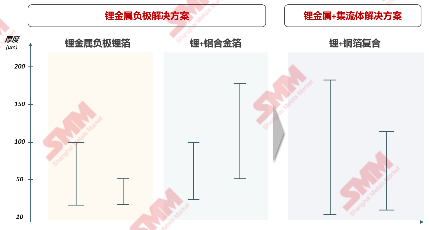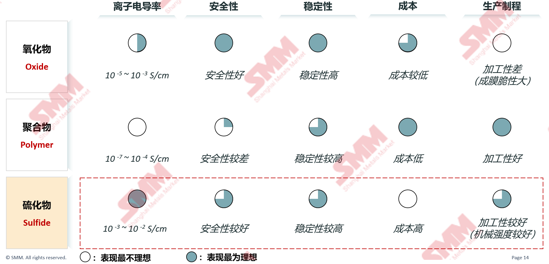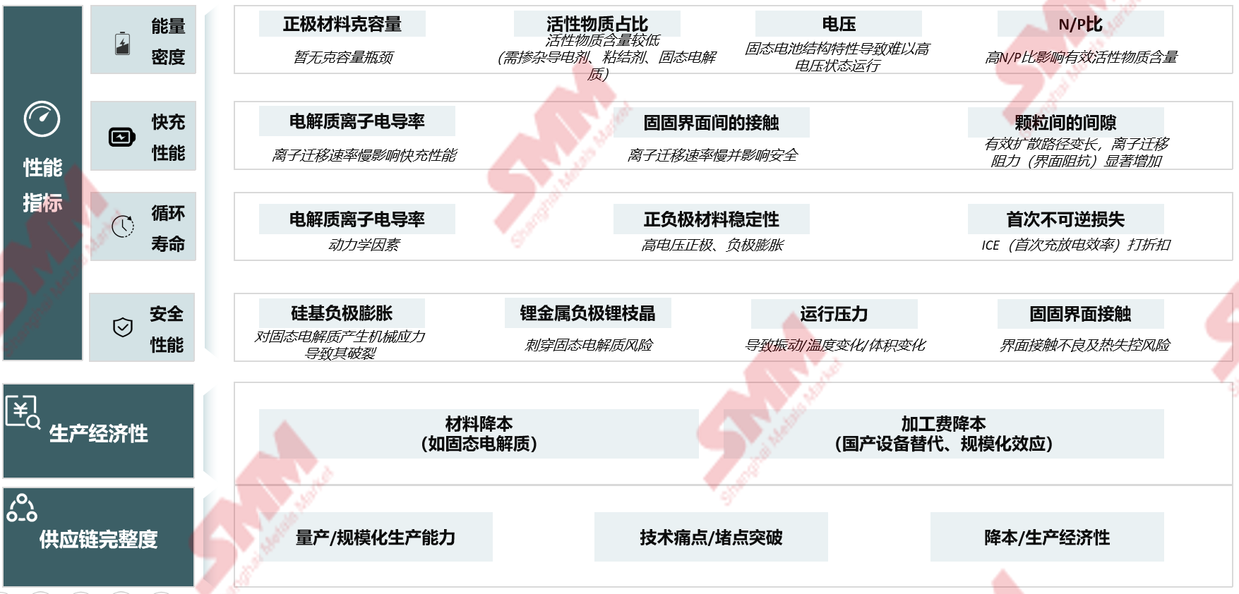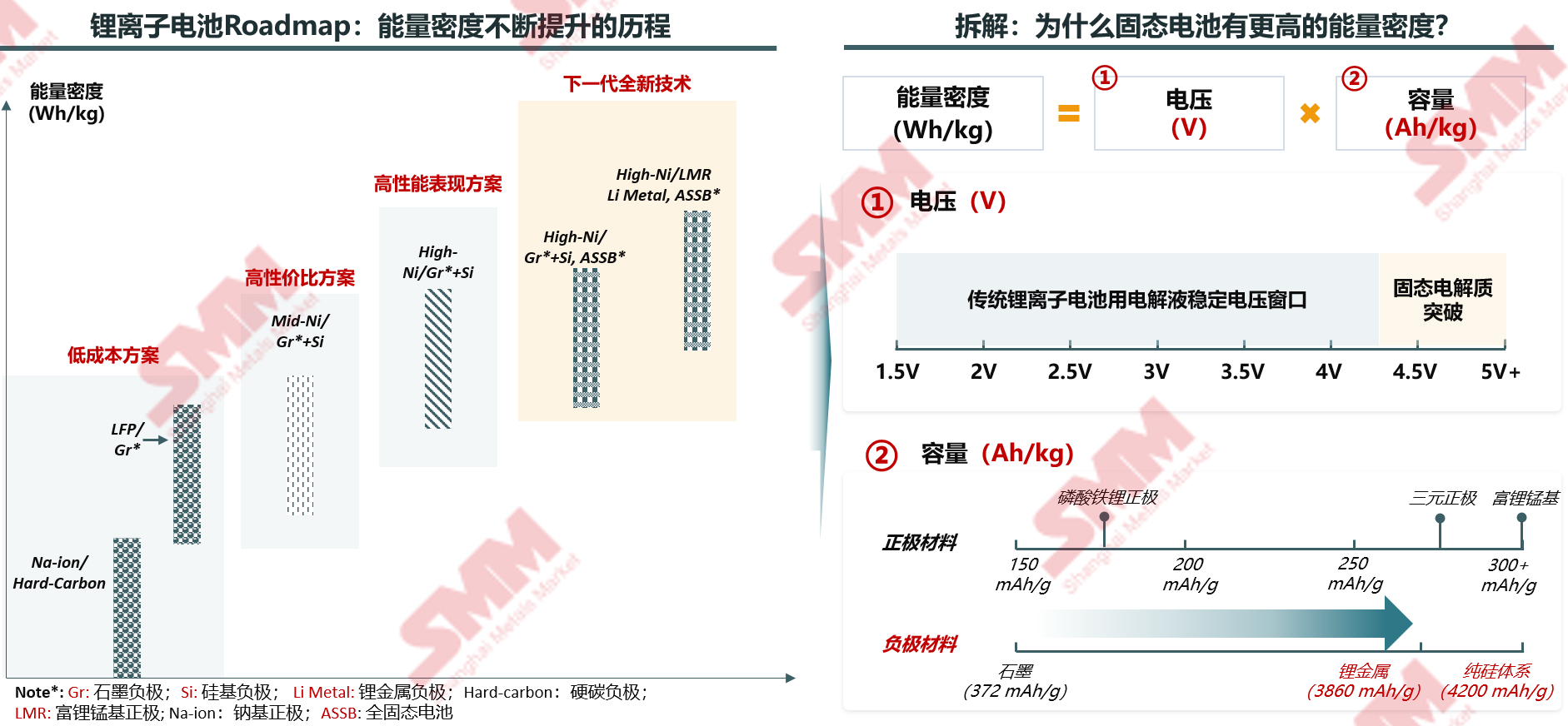 在由SMM组织的CLNB2025亚洲电池材料合作沙龙·韩国站-三元电池技术路线专题论坛上,SMM 咨询研究项目经理 王永杰围绕“液态到固态 下一代三元材料的技术突破与市场重塑”的话题展开分享。她表示,SMM预计,2025年全球固态电池的渗透率在0.1%左右,预计2030年全固态电池渗透率有望达到4%左右,2035年,SMM预计全球固态电池的渗透率或将逼近10%。分不同的消费领域来看,新能源汽车行业,预计到2030年,固态电池的渗透率有望达到5%左右;消费(e.g. 3C数码, eVOTL)板块,预计到2030年固态电池的渗透率有望达到12%左右。 锂电池技术变革趋势-从液态到固态 锂电池未来发展方向在哪里?- 从液态电池到固态电池,能量密度再升级 固态电池未来发展增速如何?(1/2)- 全球全固态2035年渗透率逼近10% 全球锂离子电池需求量方面,SMM预计,2024年到2030年电动车所需的锂离子电池需求量年均复合增长率在11%左右,储能所需锂离子电池需求量年均复合增长率在27%左右,消费电子所需的锂电池的需求量年均复合增长率在10%左右。 2025年全球固态电池的渗透率在0.1%左右,预计2030年全固态电池渗透率有望达到4%左右,2035年,SMM预计全球固态电池的渗透率或将逼近10%。 固态电池未来发展增速如何?(2/2)- 消费场景率先突破,EV潜力最大 分不同的消费领域来看,新能源汽车行业,预计到2030年,固态电池的渗透率有望达到5%左右。主要是因为高端电动汽车对于高安全性和高续航里程的需求,但长期渗透率进一步提升在于规模化及降本逻辑。 储能板块,预计到2030年,固态电池在储能领域的渗透率或在2%左右,主因储能市场对电芯成本敏感度较高,仅部分价格敏感度较低且极度注重安全性的场景使用固态电芯,短期内需求量有限。 消费(e.g. 3C数码, eVOTL)板块,预计到2030年固态电池的渗透率有望达到12%左右,主因3C数码消费电池由于体积限制,对于能量密度要求更高,叠加用户体验升级等因素,成为固态电池商业化落地的试验田,渗透率先突破10%。 …固态电池材料体系如何搭配 固态电池各材料体系如何搭配?- 正极以高镍三元及富锂锰基为主 正极 | 预计富锂锰基材料2030年开始放量,突破万吨级市场规模 市场预测:2025年,富锂锰基市场规模预计增长至3,000吨;2030年,市场规模将增长至16,000吨,增速达40% 2030年增量: •小动力应用:富锂锰基材料与锰酸锂掺混使用,弥补锰酸锂高温存储性能差和循环性能差的缺点 •EV-液态电池应用:预计2027年起,优先与三元材料掺混,降低三元材料成本,同时提高能量密度 •EV-固态电池应用:预计2030年起,富锂锰基材料可作为单一材料,用于全固态电池,成为富锂锰基材料市场主要增量。 负极 | 预计CVD硅碳2025年开始放量,突破千吨级市场规模 市场预测:2025年,CVD硅碳市场规模将大幅增长至1,500吨,增速超过300%;2030年,市场规模将增长至80,000吨 2025年增量: •3C应用:荣耀、华为、VIVO、OPPO等手机应用进一步商业化,渗透率扩大;电动工具逐渐配套 •EV应用:46系电池、固态电池研发持续推进,实验规模放大使得用量增长 •掺杂比例提升:目前整体CVD硅碳掺杂比例为5%-10%,预计2025年提升至15%。 负极 | CVD硅碳产业链进一步完善是关键因素,原料、工艺成熟度持续提升 原料:硅烷气持续降本,多孔碳一致性持续提升 硅烷主要应用于光伏组件、半导体行业,CVD硅碳为新兴增量应用; 硅烷大幅降价主要因为供应大量过剩,预计2025年将延续降价。 多孔碳: 多孔碳性能(孔径、孔容、孔隙率)直接决定硅碳产品性能,目前为非标准品,占CVD硅碳生产成本的 35-45% 考虑到一致性要求,多孔碳由生物质向树脂基转变。生物质多孔碳(如椰壳)的天然孔隙结构使其在形貌、孔结构、一致性方面表现较差,但树脂基多孔碳由于树脂成本更高,价格较高 设备:流化床规格持续增大 中级流化床: 工艺重点在于生产参数控制(温度、时间、气流速率);中试级20KG流化床设备基本成熟,目前约65万元/台,持续降价中 商业级流化床: 大装置(100KG、250KG)预计2025-2026年可逐步落地,目前可能导致硅烷沉积不均匀,且也存在安全性问题,良率、硅烷利用率、安全性等仍待解决。 负极 | 锂金属负极包括纯锂箔、锂铝复合箔、及复合集流体解决方案,厚度是关键 厚度为金属锂负极的关键指标 2种潜在方案:锂金属负极+锂金属及集流体复合解决方案; 技术领先锂金属负极企业产品厚度更薄; 二三梯队企业仅能生产复合型锂金属负极(如锂+铝复合箔),为减弱纯锂带的不稳定性困难点。 负极 | 锂金属厚度与挤压、轧制、覆合等工艺息息相关 固态电解质 | 硫化物综合表现最佳,但需突破成本问题 …固态电池发展仍面临重重挑战 固态电池目前面临哪些挑战?- 供应链 固态电池目前面临哪些挑战?- 材料及生产制备 材料及生产制备方面,固态电池面临固态电解质成膜问题、硫化物电解质反应(与硅基负极)问题、硫化物固态电解质高温分解H2S问题、固固界面接触问题、生产环境控制问题、压力设备控制问题、运行压力控制(装车运行压力控制)问题、锂金属:充电过程不均匀沉积导致枝晶的问题以及硅基负极:膨胀等问题。 因此,为什么我们说固态电池还没有那么快? 固态电池:从材料角度的颠覆式创新 So, where are we? – 全固态电池目前仍处于发展早期阶段 展望未来,固态电池的发展需要全产业链通力协作 展望未来,SMM认为,固态电池的发展需要上游原材料企业、电池材料企