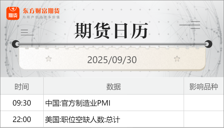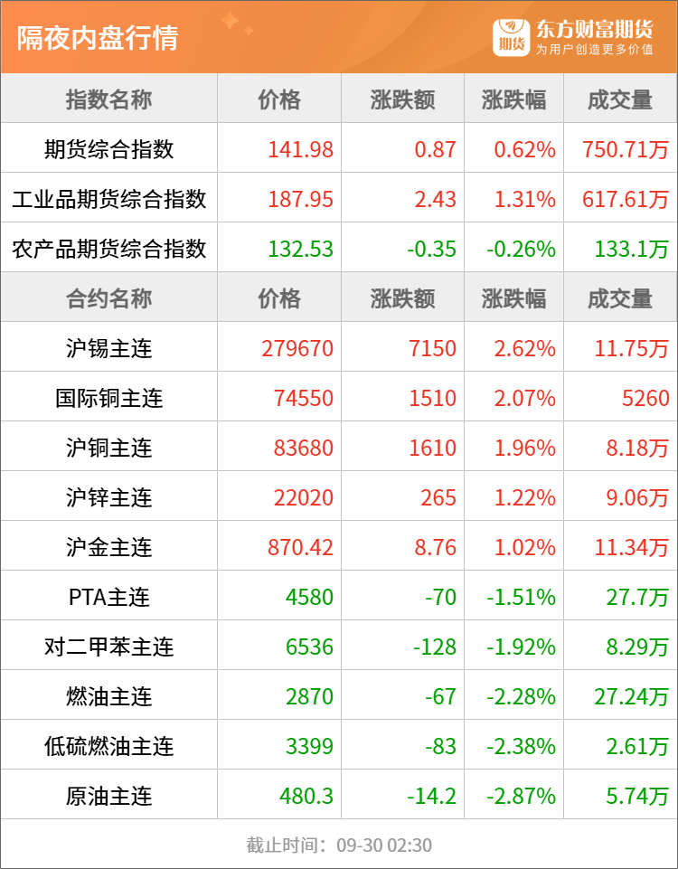 隔夜行情![]() ![]() 每日精选黄金站上3800美元!年内37次创新高 多家珠宝店节前涨价 7座锂矿命运明天(9月30日)敲定!全球10%产能何处去 欧佩克+会议在即 该组织或于11月再次上调原油产量 宏观产经新华社:中共中央政治局9月29日召开会议,研究制定国民经济和社会发展第十五个五年规划重大问题。中共中央总书记习近平主持会议。会议决定,中国共产党第二十届中央委员会第四次全体会议于10月20日至23日在北京召开。中共中央政治局听取了《中共中央关于制定国民经济和社会发展第十五个五年规划的建议》稿在党内外一定范围征求意见的情况报告,决定根据这次会议讨论的意见进行修改后将文件稿提请二十届四中全会审议。 财联社:国家发改委政策研究室副主任、新闻发言人李超在新闻发布会上表示,外部环境严峻且内需回升基础不牢,宏观政策将持续发力并“适时加力”以巩固向好势头。政策发力点高度聚焦科技与AI产业,将制定智能终端和智能体发展指引、开放行业场景、发放算力补贴,并特别支持民营企业深度参与“人工智能+”行动。此外提到新型政策性金融工具规模共5000亿元,全部用于补充项目的资本金。国家发展改革委正在会同有关方面,抓紧把新型政策性金融工具资金投入到具体项目上。 界面新闻:工业和信息化部等六部门发布关于印发《机械行业稳增长工作方案(2025—2026年)》的通知,2025—2026年,机械行业运行保持平稳向好态势,重点产业链供应链韧性和安全水平持续提升,发展质量效益迈上新台阶,力争营业收入年均增速达到3.5%左右,营业收入突破10万亿元。重点细分行业规模稳中有升,新质生产力加快培育,企业竞争力进一步增强,优质装备供给能力显著提高,培育一批具有竞争力的中小企业特色产业集群和具有国际竞争力的产业集群。 品种资讯黑色系期货 铁矿石:据Mysteel,2025年9月22日至28日,全球铁矿石发运总量3475.4万吨,环比增加150.6万吨。澳洲巴西铁矿发运总量2864.0万吨,环比增加91.2万吨。其中澳洲发往中国的量1771.4万吨,环比增加200.2万吨。 2025年9月22日—9月28日中国47港铁矿石到港总量2603.7万吨,环比减少146.7万吨;中国45港铁矿石到港总量2360.5万吨,环比减少314.5万吨;北方六港铁矿石到港总量1001.4万吨,环比减少288.6万吨。(我的钢铁网) 钢材:据市场反馈,即日起至10月底,唐山调坯型钢厂实施生产调控。唐山型钢主流价格稳中趋强,其中工字钢3280元/吨,角钢3250元/吨,槽钢3240-3250元/吨。(我的钢铁网) 焦煤:据调研,临汾乡宁三座煤矿计划于10月1日开始停产3-7天,合计产能1170万吨,主产低硫瘦煤。其中两座煤矿停产3天,10月4日复产;另一座煤矿停产7天,10月8日复产。期间三座煤矿原煤总影响量约20.6万吨。(我的钢铁网) 农产品期货 生猪:华储网发布通知,10月10日将进行中央储备冻猪肉轮换收储竞价交易,本次收储挂牌竞价交易挂牌15000吨。(财联社) 据对全国500个县集贸市场和采集点的监测,9月第4周全国仔猪平均价格29.07元/公斤,比前一周下跌3.2%,同比下跌26.2%,降至19个半月低点。全国29个监测省份仔猪价格全部下跌。华南地区价格较高,为31.61元/公斤;华北地区价格较低,为27.93元/公斤。(农业农村部) 棕榈油:据Mysteel,截至2025年9月26日(第39周),全国重点地区棕榈油商业库存55.22万吨,环比上周减少3.29万吨,减幅5.62%;同比去年50.59万吨增加4.63万吨,增幅9.16%。(我的钢铁网) 大豆:巴西农业咨询机构AgRural表示,截至上周四(9月25日),巴西2025/26年度大豆种植进度已达3.2%。巴西中南部地区2025/26年度一茬玉米种植进度已达32%。(新华财经) 有色/贵金属期货 沪金:伦敦现货黄金价格又摸到3830美元/盎司的历史新高,日内涨幅接近70美元。黄金的节节攀升也带来了一个纸面上的新纪录——美国财政部的黄金储备价值正式突破1万亿美元。 日本黄金巨头田中贵金属工业公司(东京)29日将黄金的门店销售价格设定为每克20018日元(约合人民币957元),首次突破2万日元大关,创下历史新高。(财联社) 沪铜:据Mysteel统计,9月29日国内市场电解铜现货库存15.67万吨,较25日增1.11万吨。上海库存11.15万吨,较25日增1.29万吨;广东库存1.36万吨,较25日降0.18万吨;江苏库存2.59万吨,较25日降0.06万吨。(我的钢铁网) 美国银行将2026年和2027年铜价预测分别从每吨10188美元上调至每吨11313美元,从每吨12000美元上调至每吨13500美元。(财联社) 沪锡:印度尼西亚总统普拉博沃·苏比延多29日表示,已经下令关闭苏门答腊岛邦加-勿里洞省的1000座非法锡矿,并全面封堵走私通道。邦加-勿里洞省是全球重要的锡矿开采中心,在国际锡供应链中占据关键地位。该项行动预计到2026年可为国家挽回45万亿印尼盾(约合27亿美元)的损失。(新华财经) 能化期货 尿素:9月29日山东地区尿素行情僵持运行,小颗粒主流出厂成交1550-1620元/吨,临沂市场一手贸易商出货参考价格1600元/吨附近,菏泽市场参考价格1600元/吨附近。省内企业基本正常。近两日省内企业依旧以国庆收单为主,但基于周边价格的维持,企业也暂时稳价,但实际市场支撑不足,下游采购积极性不高,所以厂家新单成交仍面临压力,短时行情弱势运行,不排除假期间价格会有小幅松动。(隆众资讯) 纯苯:据隆众资讯,截至2025年9月29日,江苏纯苯港口样本商业库存总量10.6万吨,较上期库存10.7万吨去库0.1万吨,环比下降0.93%;较去年同期库存7.8万吨上升2.8万吨,同比上升35.9