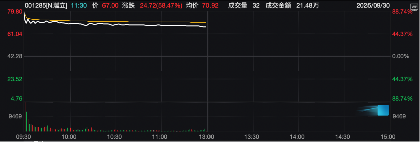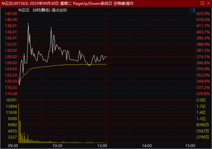 又见“肉签”! A股市场今天(9月30日)上午整体上行,科创50指数走势强劲,盘中再创年内新高。 此外,今日A股、港股市场均有新股上市,首日表现均较亮眼。其中,A股市场今天有两只新股上市,新股云汉芯城(301563)盘中涨幅一度超过400%,若按照盘中最高价计算,中一签新股最多可赚约5.75万元,这一单签盈利居于年内A股市场前列。港股市场今日有3只新股上市,其中西普尼盘中一度涨近340%。 科创50指数走强 再创年内新高 A股市场今天上午整体上行,主要指数不同程度上涨,其中科创50指数走势强劲,盘中涨幅一度超过2%,再创年内新高。 主要行业和赛道板块中,若按照申万一级行业划分,有色金属板块大涨,板块盘中涨幅超过2%。铂科新材盘中涨幅一度超过18%,博迁新材、精艺股份、锡业股份等涨停,中金黄金、湖南黄金等也不同程度上涨。 消息面上,金价和银价继续上涨。国内黄金期货主力合约盘中再创历史新高,已经突破870元/克。 国防军工、电力设备、房地产、计算机等板块涨幅居前;通信、综合、非银金融等板块上午盘中走弱。 概念板块方面,存储芯片、锂矿等概念明显走强。 新股表现亮眼 A股市场今天有两只新股上市,悉数大幅上涨。 新股云汉芯城盘中涨幅一度超过400%,若按照盘中最高价计算,中一签新股最多可赚约5.75万元,这一单签盈利居于年内前列。 招股资料显示,公司是一家电子元器件分销与产业互联网融合发展的创新型高新技术企业,重点聚焦电子制造产业中小批量电子元器件研发、生产、采购需求。公司通过有效运用数字技术和互联网技术,基于自建自营的云汉芯城B2B线上商城,主要为电子制造产业提供高效、专业的电子元器件供应链一站式服务,并延伸至产品技术方案设计、PCBA生产制造服务、电子工程师技术支持等在内的多个领域,发行人下属子公司深圳汉云拥有CNAS认证的电子元器件检测实验室。 招股资料称,目前公司线上商城可支持每天上百万级的搜索量,搜索匹配率维持在90%左右,月处理订单数(峰值)和BOM单数(峰值)分别为6.8万笔和3.4万单左右,报关商品归类自动匹配率超95%。截至2024年12月31日,公司注册用户数超过69.65万,累计下单企业客户超过15.89万家。 另一只新股瑞立科密盘中涨幅一度接近90%。 招股资料显示,瑞立科密是专业从事机动车主动安全系统相关核心部件研发、生产和销售的国家高新技术企业,主营业务为机动车主动安全系统和铝合金精密压铸件的研发、生产和销售以及技术服务。公司是国内少数具备汽车制动防抱死系统(ABS)、电子稳定控制系统(ESC)、电子制动控制系统(EBS)、电子驻车制动系统(EPB)、电控空气悬架系统(ECAS)等主动安全系统正向开发能力的企业,核心产品已涵盖气压制动/液压制动、电控制动/线控制动等主流技术路线,广泛应用于商用车、乘用车及摩托车的制动安全等领域。公司经过长期不懈的自主创新,不断突破技术壁垒和市场瓶颈,以高性价比的产品和服务为整车厂商提供一揽子主动安全系统解决方案,已成长为国内商用车主动安全系统龙头企业。 港股市场今日也有3只新股上市,分别为紫金黄金国际、西普尼和博泰车联。其中,西普尼盘中一度涨近340%,截至目前仍有约250%涨幅,股价超过100港元/股。 公开资料显示,西普尼是中国领先的黄金表壳手表设计制造商,旗下品牌HIPINE在2024年成为中国最大的足金贵金属手表品牌。2022年至2024年,公司营业收入从3.24亿元增长至4.57亿元。 紫金黄金国际涨超60%。公司是紫金矿业旗下除中国以外所有黄金矿山的整合主体,已成为全球领先的黄金开采企业之一。2022至2024年度,紫金黄金国际收入由18.18亿美元增长至29.90亿美元,复合年增长率28.2%;母公司拥有人应占溢利从1.84亿美元增至4.81亿美元,复合年增长率达61.9%。 博泰车联盘中涨近50%。公开资料显示,公司是智能座舱解决方案供应商,按照出货量计,博泰车联是中国乘用车智能座舱域控制器解决方案的第三大供应商,市场份额7.3%。 港股整体低位震荡 港股市场今天上午整体低位震荡,恒生指数盘初一度涨势明显,后收窄涨幅,盘中多次转跌。 恒生指数成份股中,药明康德、中芯国际、舜宇光学科技、比亚迪电子等盘中领涨,中国石油股份、金沙中国有限公司、中通快递-W盘中领跌。 恒生科技指数成份股中,华虹半导体盘中大涨,涨幅一度超过13%。公司昨晚发布关于发行股份及支付现金购买资产并募集配套资金暨关联交易事项的进展公告。公告称,公司拟通过发行股份及支付现金的方式购买上海华力微电子有限公司(简称“华力微”)股权并募集配套资金(简称“本次交易”)。本次交易完成后,华力微将成为公司的控股子公司。本次交易预计构成关联交易,但不构成重大资产重组及重组上市。公司公告表示,截至本公告披露日,公司及相关方正在积极推进本次交易的相关工作,本次交易所涉及的审计、评估等工作正在有序进行中。公司将根据本次交易的进展情况,按照相关法律法规的规定履行后续审议程序与信息披露义务。 另外,公司公告称,本次交易尚需履行多项审批程序方可实施,包括但不限于再次召开董事会审议本次交易方案、召开股东大会审议批准本次交易方案、香港证监会及联交所必要的审批程序、上海证券交易所审核通过及中国证券监督管理委员会同意注册等。本次交易能否通过上述审批及最终取得批准或同