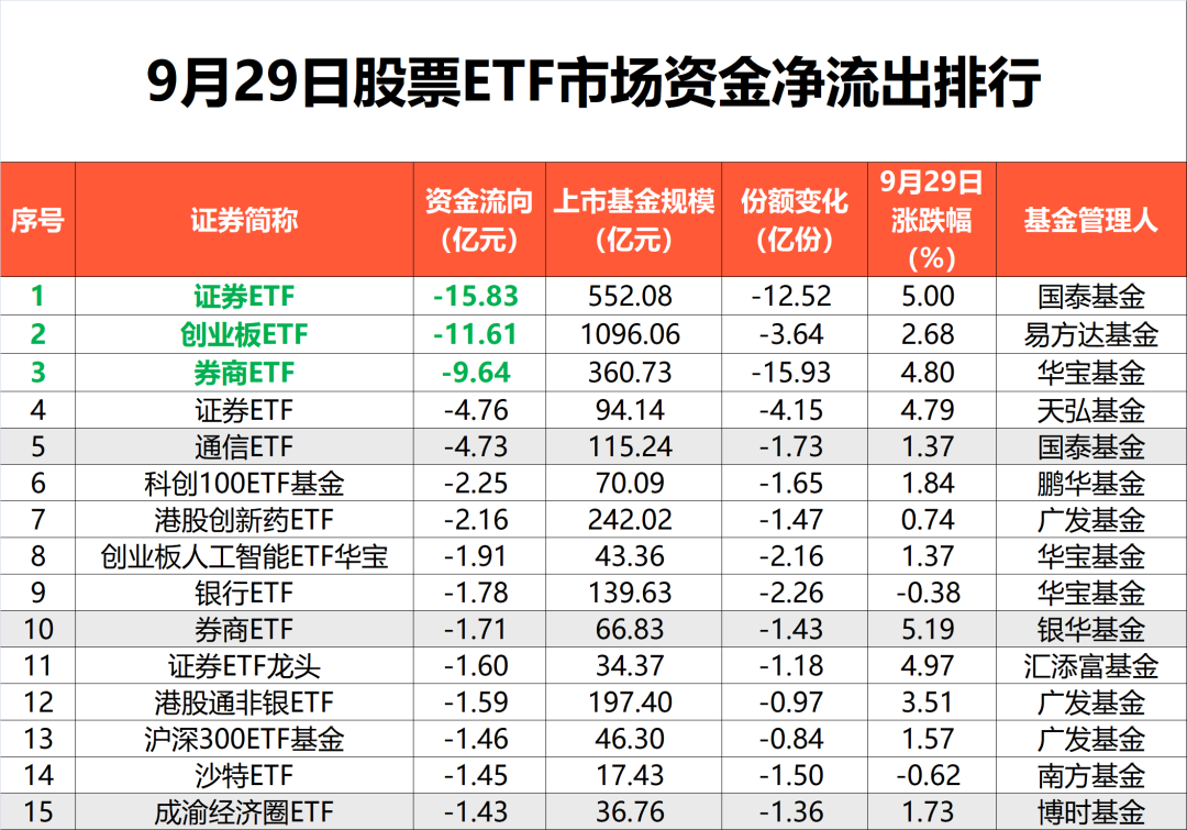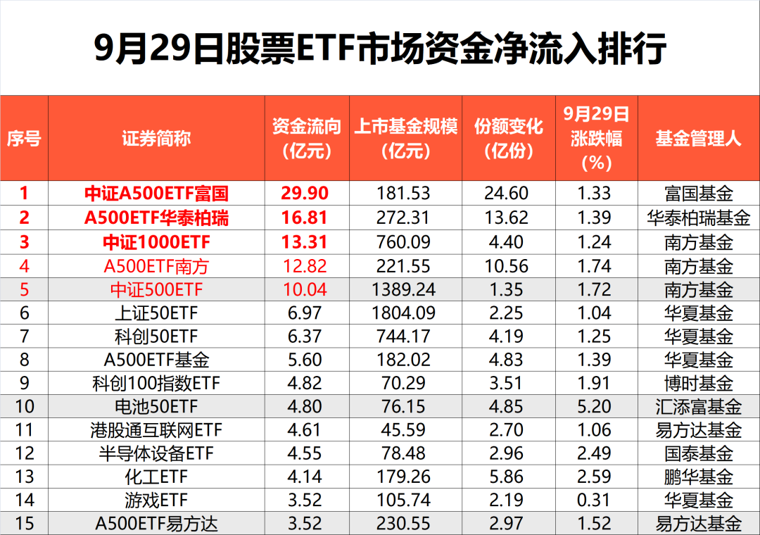 继上周五狂买220亿元后,本周一股市大涨,股票ETF市场又有百亿体量资金净流入。 9月29日,A股三大股指全线飘红,创业板指和深证成指均大涨逾2%。券商、贵金属板块领涨市场,固态电池概念股表现活跃,煤炭、银行、医药等板块出现回调。 在市场大涨行情中,资金再次借道股票ETF狂买超120亿元。其中,中证A500指数成为吸金主力,昨日净流入资金近75亿元,在总体流入资金中占比超六成;行业主题ETF净流出居前,证券公司指数昨日净流出近35亿元。 昨日股票ETF市场净流入资金超120亿元 Wind数据显示,截至9月29日,全市场1220只股票ETF(含跨境ETF)总规模达4.55万亿元。在昨日股市大涨行情中,股票ETF市场总份额增加73.05亿份,按照区间成交均价测算,净流入资金达123.3亿元。 从大类型来看,昨日宽基ETF与债券ETF净流入居前,分别达119.8亿元与27.53亿元;规模变化方面,宽基ETF规模上升505.18亿元。 具体到指数维度,昨日中证A500指数单日净流入居前,达74.6亿元。 从5日角度观测,近期资金流入中证A500指数超178亿元,流入半导体材料设备指数超48亿元。 从产品维度,中证A500ETF富国昨日净流入29.9亿元,位居全市场首位。华泰柏瑞、南方基金旗下跟踪中证A500指数的产品净流入也超10亿元,同样跻身市场前列。 市场大涨背景下,头部基金公司旗下ETF持续获得资金净流入。 易方达基金旗下ETF方面,易方达基金ETF最新规模8177.8亿元,昨日规模增加150.8亿元。其中,港股通互联网ETF净流入超4.6亿元;A500ETF易方达净流入超3.5亿元;人工智能ETF、沪深300ETF易方达、半导体设备ETF易方达等也有不同程度净流入。值得注意的是,科创板50ETF昨日净流入2.3亿元,最新规模超755亿元、位居同类产品第一。 华夏基金旗下ETF方面,上证50ETF和科创50ETF昨日净流入居前,分别净流入6.97亿元和6.37亿元,最新规模分别达1804.09亿元和744.17亿元,对应跟踪指数近一月日均成交额分别为25.5亿元和60.63亿元。A500ETF基金净流入5.6亿元,游戏ETF净流入3.52亿元。 证券公司指数单日净流出居前 资金流出方面,昨日行业主题ETF净流出居前,达0.67亿元。具体到指数维度,昨日大涨5%左右的券商板块遭遇资金净卖出,证券公司指数单日净流出居前,达34.68亿元。 其中,国泰基金旗下证券ETF、华宝基金旗下券商ETF分别净流出15.83亿元、9.64亿元,位居全市场前列。 在券商板块大涨、泛科技板块震荡背景下,市场机构依然看好顺周期、科技创新主线的投资机会。 易方达基金指数研究部总经理庞亚平表示,中期来看,A股整体走势或将延续上行格局。10月重要会议有望进一步明晰政策主线,或将驱动全A盈利回升,顺周期核心资产有望受益。 华安基金表示,建议聚焦科技创新主线及高景气领域,关注政策红利与产业升级共振方向,如景气上行且受益于“反内卷”政策的储能、电池等板块。 银河基金也认为,往后看,当前市场正处于风格调整阶段,产业升级与政策红利共振方向或可关注。 |