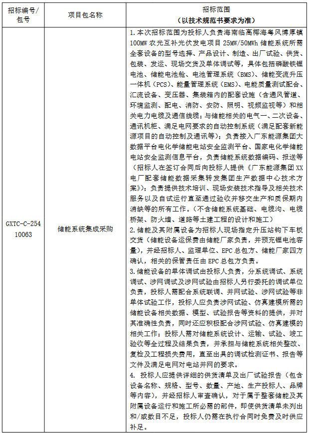 9月29日,广东省能源集团旗下临高县椰海粤风新能源有限公司发布椰海粤风临高博厚镇 100MWp 农光互补光伏项目25MW/50MWh 储能系统集成采购招标公告。项目位于海南省临高县,项目装机容量为100MWp。根据项目接入系统报告及其批复,本项目新建一座 110kV 升压站,以 110kV 电压等级接入系统,新建一回 110kV 线路接至 110kV 金马物流站,线路路径总长度为 22.7km,其中架空段线路全长 20.11km,电缆段路径长 2.7km。本项目配套建设 25MW/50MWh 储能装置,储能设施采用成套集装箱式,储能系统直流侧额定电压采用 1500V。 要求投标人在 2020 年 1 月 1 日至招标公告发布日(以合同签订时间为准)应具有电化学储能系统集成设备(含 EMS、PCS、BMS、电池等)成套合同业绩累计容量 100MWh 以上(含 100MWh),其中含 1 项已投运单体容量 50MWh 以上(含 50MWh)业绩。业绩合同签订方必须为投标人,不包括投标人上级集团公司或其子公司签订的业绩合同。 投标人应提供选用的 PCS、EMS、BMS 制造厂商在 2020 年 1 月 1 日至招标公告发布日(以合同签订时间为准)电化学储能系统应用的合同业绩证明,其中 PCS 的合同业绩不少于 300MW,EMS的合同业绩不少于 200MWh,BMS 的合同业绩不少于 200MWh。 椰海粤风临高博厚镇 100MWp 农光互补光伏项目25MW/50MWh 储能系统集成采购招标公告 项目名称:椰海粤风临高博厚镇 100MWp 农光互补光伏项目 25MW/50MWh 储能系统集成采购(以下简称“项目”) 招标编号:GXTC-C-25410063 日 期:2025 年 9 月 29 日 1、招标条件 本招标项目椰海粤风临高博厚镇 100MWp 农光互补光伏项目 25MW/50MWh 储能系统集成采购已由海南省发展和改革委员会核准的《海南省企业投资项目备案证明》批准建设,项目招标人为临高县椰海粤风新能源有限公司,建设资金来自招标人自筹,招标人为临高县椰海粤风新能源有限公司,项目已具备招标条件。国信招标集团股份有限公司受临高县椰海粤风新能源有限公司(以下简称“招标人”或“买方”)委托,就椰海粤风临高博厚镇 100MWp农光互补光伏项目 25MW/50MWh 储能系统集成采购进行公开招标。 2、项目概况和招标范围 2.1 项目概况: (1)工程名称:椰海粤风临高博厚镇 100MWp 农光互补光伏项目 25MW/50MWh 储能系统集成采购 (2)工程项目概况:临高县椰海粤风新能源有限公司临高博厚镇 100MW 农光互补光伏发电项目(以下简称“临高 100MW 光伏项目”)位于海南省临高县,项目装机容量为100MWp。根据项目接入系统报告及其批复,本项目新建一座 110kV 升压站,以 110kV 电压等级接入系统,新建一回 110kV 线路接至 110kV 金马物流站,线路路径总长度为 22.7km,其中架空段线路全长 20.11km,电缆段路径长 2.7km。本项目配套建设 25MW/50MWh 储能装置,储能设施采用成套集装箱式,储能系统直流侧额定电压采用 1500V。 (3)工期要求:本项目于合同签订后开始实施至储能系统全套设备供货到现场,完成储能系统单体调试及并网。储能系统全套设备供货时间以招标人供货通知为准,储能设备到货时间自签订合同之日起不超过 30 天(自供货通知书发出当天起算),合同签订后 5 个工作日内向项目设计院提资,储能单体调试完成时间不超过 10 天(自现场接线完成并提供辅助电源之日起算),储能动态调试(三充三放)完成时间不超过 15 天(自 35kV 送电之日起算)。 2.2 招标范围: 注:具体招标范围见招标文件第二册技术部分并以其为准。 3、投标人资格要求 3.1 基本要求 (1)投标人必须是中华人民共和国境内注册的具有独立承担民事责任能力的法人(提供工商行政管理部门颁发的营业执照或事业单位法人证书)或者其他组织。 (2)投标人应具有 EMS(能量管理系统)、PCS(储能变流器)、BMS(电池管理系统)、电芯产品之一的自主研发及生产能力,需提供对应产品(EMS、PCS、BMS、电芯产品之一)经国家批准第三方认证机构出具的 CNAS 及 CMA 型式试验报告。 (3)投标人需承诺: ①投标人具有良好的银行资信和商业信誉,没有处于被责令停业或破产状态,且资产未被重组、接管和冻结。 ②)投标人具有健全的财务会计制度;投标人应是在法律上和财务上独立,合法运作并独立于招标人的。 ③投标人没有直接或间接地与招标人雇用或曾经雇用过的,为本次招标编制技术规范和其他文件或提供咨询服务的公司包括其附属机构有关联。 ④投标人没有与招标人存在利害关系可能影响招标公正性的法人、其他组织或者个人的情况; ⑤投标人不存在“单位负责人为同一人或者存在控股、管理关系的不同单位,不得参加同一标段投标或者未划分标段的同一招标项目投标。”的情形。 ⑥若中标后,在进场实施前向招标人提供实施人员的名单及工作分配情况。遵守招标人单位的劳动纪律和规定,服从工作安排,完成招标人交办的各项工作任务。必须满足招标文件商务条款要求,满足国家相关法律法规要求和招标人制度要求。 ⑦投标人没有在广东省能源集团有限公司、广东省风力发电有限公司、广东省风力发电有限公司内蒙古分公司供应商黑名单或灰名单内。 (4)投标人不得存在下列情形之一: a 在国家企业信用信息公示系统(.cn/)中被列入严重违法失信企业名单; b 在“信用中国”网站(.cn/)或中国执行信息公开网(http://zxgk.court.gov.cn/shixin/)中被列入失信被执行人名单;; C 2022 年 1 月 1 日至招标公告发布日在中国裁判文书网(http://wenshu.court.gov.cn/)中投标人或其法定代表人、