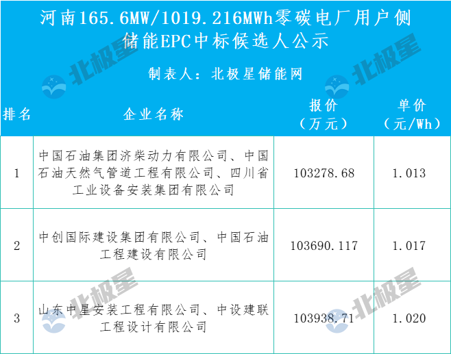北极星储能网获悉,9月29日,河南省漯河市金大地公司综合智慧零碳电厂储能项目EPC总承包中标候选人公示。项目建设规模165.6MW/1019.216MWh,储能电池采用铅碳电池。 第一中标候选人:中国石油集团济柴动力有限公司(联合体牵头人)、中国石油天然气管道工程有限公司、(联合体成员1)、四川省工业设备安装集团有限公司(联合体成员2) 投标报价: 总价:1032786800.00元,折合单价1.013元/Wh 其中: 设计费:6750000.00元 建安费:77814900.00 元 设备及工器具购置费:948221900 .00元 工期:270日历天,其中设计周期90日历天。 质量标准:(1)设计质量要求:达到现行国家、行业及地方相应规范、标准要求,并通过相关部门审查。 (2)采购质量要求:合国家有关规范、标准,性能良好,满足招标人要求。 (3)施工质量要求:满足国家现行颁布的相关施工质量验收规范要求,达到合格验收标准,并保证各专项工程验收通过。 项目经理:赵志龙 注册编号:川1512023202401445 设计负责人:白海军 注册编号:DG20101300060 施工技术负责人:陈辉 注册编号:00582143 第二中标候选人:中创国际建设集团有限公司(联合体牵头人)、中国石油工程建设有限公司(联合体成员) 投标报价: 总价:1036901170.00元,折合单价1.017元/Wh 其中: 设计费:6920000.00元 建安费:78804500.00 元 设备及工器具购置费:951176670.00元 工期:270日历天,其中设计周期90日历天。 质量标准:(1)设计质量要求:达到现行国家、行业及地方相应规范、标准要求,并通过相关部门审查。 (2)采购质量要求:合国家有关规范、标准,性能良好,满足招标人要求。 (3)施工质量要求:满足国家现行颁布的相关施工质量验收规范要求,达到合格验收标准,并保证各专项工程验收通过。 项目经理:张渝阳 注册编号:川1512016201624909 设计负责人:李宝云 注册编号:DG171102025 施工技术负责人:李正山 注册编号:川1512017201833220 第三中标候选人:山东中星安装工程有限公司(联合体牵头人)、中设建联工程设计有限公司、(联合体成员 ) 投标报价: 总价:1039387100.00元,折合单价1.02元/Wh 其中: 设计费:6800000.00元 建安费:78526600.00 元 设备及工器具购置费:954060500.00元 工期:270日历天,其中设计周期90日历天。 质量标准:(1)设计质量要求:达到现行国家、行业及地方相应规范、标准要求,并通过相关部门审查。 (2)采购质量要求:合国家有关规范、标准,性能良好,满足招标人要求。 (3)施工质量要求:满足国家现行颁布的相关施工质量验收规范要求,达到合格验收标准,并保证各专项工程验收通过。 项目经理:田立峰 注册编号:鲁1372016201718492 设计负责人:刘立新 注册编号:DG20142200162 施工技术负责人:王丽 注册编号:鲁1372016201823919 招标人为舞阳县能耀新能源有限公司,是河南能耀科技有限公司的全资子公司。 项目位于河南省漯河市舞阳县,建设以用户侧储能为主体的综合智慧零碳电厂单元。储能电池采用铅碳电池,采用户内布置方案。项目为用户侧储能,储能电池单元接入河南金大地化工有限责任公司内220kV允能变,采用峰时放电,谷时充电的方式,为用户节约电费开支,降低用电成本。 项目计划工期为270日历天,其中设计周期为90日历天。 |