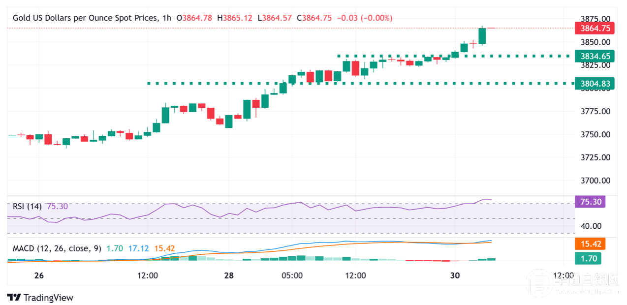【华通白银网9月30日讯】•黄金延长了创纪录的运行,并继续从综合因素中得到支持。 •地缘政治风险、对美国政府停摆的担忧以及美联储降息的赌注支撑着金条。 •美联储的预期使美元保持低迷,并进一步有利于无息商品。 黄金连续第四天获得正牵引力,并在周二的亚洲交易日继续创下新高。贵金属在过去一小时内攀升至3,870美元,似乎准备在支持性的基本背景下延长其既定的上升趋势。在地缘政治紧张局势升级的背景下,美国政府可能关闭的风险支撑着对避风港金条的需求。此外,美国联邦储备委员会(Fed)对进一步降息的赌注进一步推动了向不屈服的黄金的流动。 与此同时,美元(USD)在美联储的预期中努力吸引任何有意义的买家,结果是另一个为黄金提供额外提升的因素。强劲的上涨似乎没有受到短期图表上超买条件的影响,这表明金价对阻力最小的路径仍然是向上的。交易员现在期待本周的美国宏观数据,包括周五的非农业工资单(NFP)报告,以获得新的动力。尽管如此,基本背景证实了积极的前景,并支持了额外的短期收益。 美国总统唐納德·特朗普与共和党和民主党国会高层主管人主持的最后一次喘息会议沒有带来预算突破。副总统JD Vance表示,政府必然会停摆,因为资金流动仍然陷入僵局。 俄罗斯周一表示,其军方正在分析美国是否会向乌克兰提供战斧巡航导弹,用于深入俄罗斯的打击。俄罗斯官员补充说,此举可能会引发急剧升级,保持地缘政治风险,并使黄金受益。 与此同时,特朗普表示,在发布20点计划后,美国非常接近在加沙战争中实现和平。特朗普还向巴勒斯坦组织哈马斯发出警告,如果以色列拒绝和平协议,它将得到美国的全力支持来摧毁这个激进组织。 特朗普签署了一项公告,调整木材、木材和衍生产品进入美国的进口。除此之外,从上周宣布的10月1日起,对品牌或专利药品的进口征收100%的关税,对所有重型卡车的进口征收25%的税。 根据CME集团的FedWatch工具,交易员定价为美联储在10月将借款成本降低25个基点的可能性为90%,12月再次降息的可能性为近70%。这使美元保持低迷,并支撑了贵金属。 周二的美国经济记录突出了JOLTS职位空缺数据和会议委员会的消费者信心指数。这,加上有影响力的联邦公开市场委员会成员的演讲,将在北美会议后期推动美元需求,并推动金价上涨。 截止昨天9约30日,全球最大黄金ETF—SPDR GOLD TRUST的黄金持仓量为1011.73吨,较前一交易日增加6.01吨。 黄金技术分析:在技术买入超过3800美元的情况下,黄金RSI指标处于超买区间 首次突破并收于3,800美元的数字,被视为金价多头的新触发因素。随后超过3,850美元水平的实力支持了进一步升值的举动。然而,每日相对强弱指数(RSI)徘徊在80.00左右,表明处于极度超买状态。反过来,这使得谨慎地等待一些短期合并或适度回调,然后再确定过去一个月左右看到的最近既定上升趋势的任何扩展。 另一方面,任何低于3,850美元阻力断点的修正回调都可以被视为在3,835-3,834水平区附近的买入机会。一些后续抛售可能会为下滑到3822美元区域铺平道路,尽管下行更有可能在3800美元的圆形数字附近保持缓冲。后者现在可能作为一个关键的关键点,如果果断地打破它,应该为更低的价格铺平道路。 白银网 |