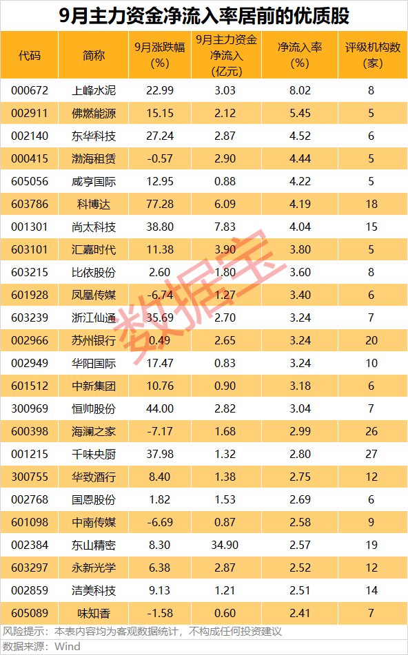 9月赚钱效应如何? 9月A股市场在波动中上扬,上证指数月度累计上涨0.64%,创业板指大涨超12%,科创50指数大涨超11%。板块方面,电力设备飙升超21%,有色金属、电子等板块指数均涨超11%。 展望节后,华龙证券认为市场具备向上动能。首先,政策持续发力稳定基本面向好预期,上市公司盈利总体处于改善通道中。其次,政策稳定市场预期明确。最后,市场总体估值合理,且在盈利预期上行的情况下,有望支撑市场估值扩张。尽管近期市场有所波动,但风险偏好仍较高,当前内外资对市场仍保持积极。 9月最熊股暴跌超86% 从个股表现来看,9月有3300多只个股下跌。其中,最熊股票是紫天退(300280),9月累计暴跌超86%,股价频频创出历史新低。 9月5日晚间,公司发布公告称,公司于2025年9月5日收到深圳证券交易所(以下简称“深交所”)下发的《关于福建紫天传媒科技股份有限公司股票终止上市的决定》(深证上〔2025〕968号),深交所决定终止公司股票上市交易。 股价重挫的还有ST东通和ST高鸿,9月累计跌幅均超63%。 其中,*ST东通9月12日晚间发布公告,公司因涉嫌定期报告等财务数据存在虚假记载,被中国证监会立案调查。公司于2025年9月12日收到中国证监会下发的《告知书》。根据《告知书》认定的事实,公司2022年向特定对象发行股票构成欺诈发行、2019年至2022年度报告存在虚假记载,可能触及《深圳证券交易所创业板股票上市规则》第10.5.1条第(一)项、第10.5.2条第一款第(六)项规定的重大违法强制退市的情形,可能被实施重大违法强制退市。 9股9月股价翻倍 A股市场中,9月有多达9只个股股价翻倍。其中,首开股份涨幅超过181%,居首;海博思创、品茗科技等均涨超130%。 海博思创股价大涨主要因为储能题材的爆发。资料显示,海博思创是国内领先的电化学储能系统解决方案与技术服务提供商,专注于电化学储能系统的研发、生产、销售,为传统发电、新能源发电、智能电网、终端电力用户等“源—网—荷”全链条行业客户提供全系列储能系统产品,提供储能系统一站式整体解决方案。 两只存储芯片概念股翻倍上涨,包括德明利、香农芯创等。消息面上,9月存储市场的第二轮涨价“信号枪”再度打响。其中闪迪宣布将面向所有渠道和消费者客户的产品价格上调10%以上。近日,美光科技向渠道商发出通知,宣布其存储产品价格将上涨20%—30%。从9月12日起,所有DDR4、DDR5、LPDDR4、LPDDR5等存储产品全部停止报价,协议客户价格全部取消,暂停报价一周。 主力资金大幅抢筹的优质股曝光 据证券时报·数据宝统计,从个股9月的主力资金流向来看,10股累计净流入均超10亿元,东山精密、天际股份、凯美特气等“吸金”均超19亿元,长盈精密、香农芯创、兆易创新等获净流入均超13亿元。 一批机构关注度较高且主力资金净流入率较高的个股值得关注。数据显示,5家及以上机构评级个股中,上峰水泥主力资金净流入率居首,超过8%,该股9月累计涨幅接近23%。 此外,还有佛燃能源、东华科技、渤海租赁等个股主力资金净流入率居前。 |