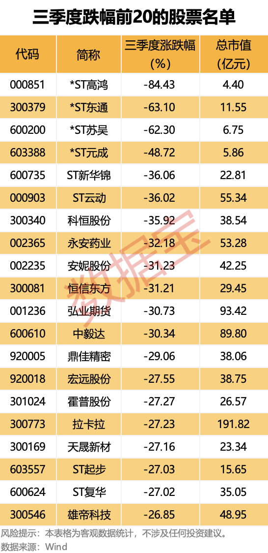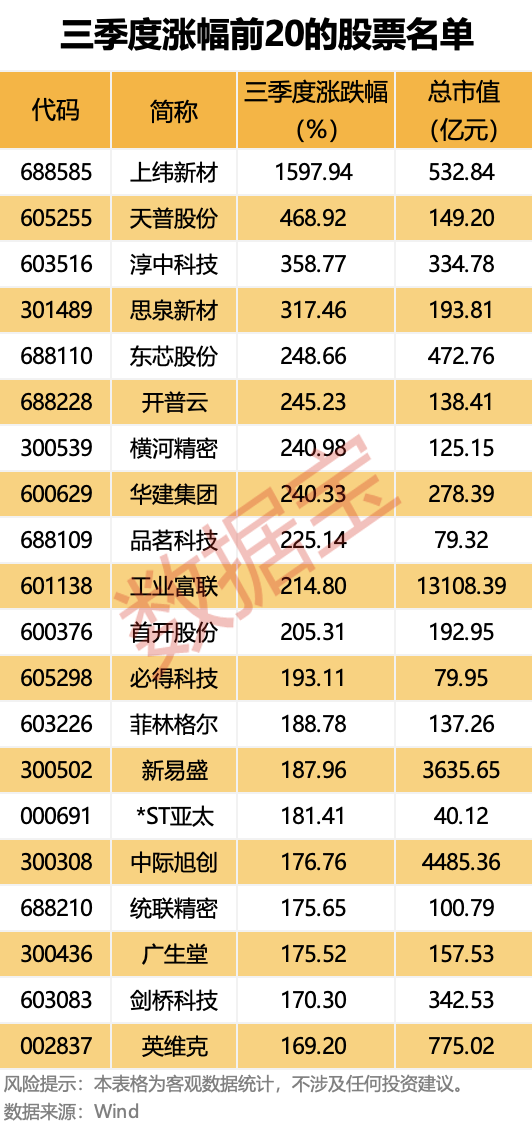 2025年第三季度,A股、港股市场整体表现强劲。 三季度以来(7月1日至9月30日),上证指数持续上攻,逼近3900点关口,其间累计上涨12.73%;深证成指三季度累计上涨29.25%,两指数双双创下自2019年4月以来的最高单季度涨幅。恒生指数亦累计上涨11.56%,实现连续三个季度收阳。 在全球市场主要股指中,深证成指三季度涨幅居首,上证指数、恒生指数涨幅分别位于第三、第四,整体表现领跑全球市场。 行情向好的原因是市场交易量的大幅活跃。三季度以来,A股市场成交额明显放大,8月13日至今连续35个交易日成交金额超过2万亿元。数据显示,第三季度单日平均成交金额为21085.88亿元,远高于上半年日均的13882.38亿元。 分板块来看,在科技行情带动下,创业板、科创板相关指数跑赢主板,其中创业板指、科创50三季度分别上涨50.4%、49.02%,彰显市场对科技主线的青睐。红利板块相对滞涨,上证红利指数下跌3.44%,中证红利指数微涨0.94%。 31个申万行业指数中,15个行业指数三季度涨幅超过10%,占比过半。TMT相关行业表现亮眼,通信、电子、电力设备、有色金属4个行业涨幅居前,均超过40%。 93股三季度股价翻倍 据证券时报·数据宝统计,剔除今年上市的次新股,共有93股三季度涨幅超过100%,上纬新材以1597.94%的涨幅居于榜首,天普股份、淳中科技、思泉新材紧随其后,分别上涨468.92%、358.77%、317.46%。 值得注意的是,三季度涨幅超过100%的个股中,有23股属于电子行业,占比接近四分之一,包括工业富联、寒武纪-U两大行业龙头。另外,光通信两大龙头中际旭创、新易盛亦上榜。上述4只龙头股均受益于AI算力热潮,股价均在三季度创下历史新高。 工业富联以214.8%的涨幅跻身三季度涨幅前十,也是翻倍股中唯一一只万亿元市值的个股。根据半年报,公司上半年末获得126只基金重仓,剔除被动型基金后仍有103只基金重仓,较去年年末的76只明显增加;上半年末,基金持股数量为2.8亿股,较去年年末的2.03亿股增长超38%。 中银证券研报认为,AI应用商业化拐点临近,重点关注国产算力与商业化进程较快的应用垂类赛道。随着AI应用商业化进程加速、Tokens消耗量的明显增长,下游对于算力的需求也在持续提升,这有望带动算力基础设施产业链的景气度,AI算力产业链景气趋势持续强化。 12股三季度下跌超三成 剔除进入退市整理期的个股后,A股市场共有12股三季度跌幅超过30%,其中6股属于“ST”板块个股。 跌幅最大的*ST高鸿因股票收盘价格已连续二十个交易日均低于1元,触及交易类强制退市情形。该股三季度下跌84.43%。此外,跌幅排在第三的ST苏吴9月30日收盘价为0.95元/股,亦发布风险提示公告。 三季度跌幅居前的个股业绩表现普遍不佳,上述12股中,8股上半年业绩出现亏损情况,其余4股也出现归母净利润大幅下滑。其中,*ST高鸿、*ST元成、ST云动上半年亏损金额均超过1亿元。 |