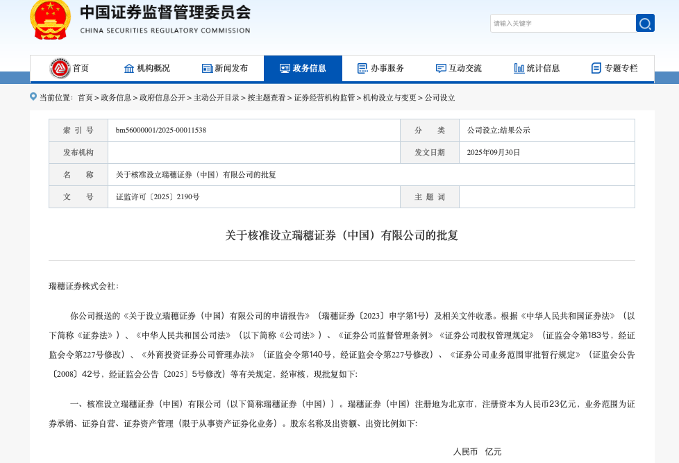 【导读】瑞穗证券(中国)获批设立,外资独资券商再增1家 9月30日,中国证监会正式发布批复,核准设立瑞穗证券(中国)有限公司(以下简称瑞穗证券(中国))。这是国内第6家外资独资证券公司,也是首家日资独资券商。 ![]() 证监会官网显示,目前申请设立审批并且已获证监会接收材料的外资券商还有花旗证券、青岛意才证券、日兴证券、城堡证券等。 首家日资独资券商来了 根据证监会批复文件,瑞穗证券(中国)注册地为北京市,注册资本为人民币23亿元,业务范围为证券承销、证券自营、证券资产管理(限于从事资产证券化业务),由瑞穗证券株式会社100%持股。 据悉,瑞穗证券(中国)高管团队已组建完成。其中,总经理一职由大和证券(中国)原总经理耿欣出任,并已于9月初正式履新。 从瑞穗证券的入华进程来看,2023年11月,瑞穗证券递交申请设立瑞穗证券(中国),2024年9月获得证监会反馈意见,2025年9月完成审批,成为年内首家获批设立的外资独资券商,也是首家日资独资券商。此前在华布局的日资证券机构如野村东方、大和证券等多为合资或控股模式。 据瑞穗证券官网,其成立于1917年7月,是日本最大的金融控股集团瑞穗金融集团旗下的子公司。2000年10月,由兴银证券与第一劝业证券、富士证券合并成立了瑞穗证券,2009年5月7日与新光证券合并成为瑞穗证券。公司拥有八千多名员工,并在欧美及亚洲多个地区开展了证券相关业务,在北京和上海设有代表处。 外资券商阵营不断扩容 近年来,随着中国金融市场双向开放不断深化,越来越多外资机构积极布局中国市场,外资券商阵营不断扩容。 2018年4月,《外商投资证券公司管理办法》正式公布并实施,将境外股东持有证券公司的股权比例放宽至51%。 2020年3月13日,证监会宣布,自2020年4月1日起取消证券公司外资股比限制,符合条件的境外投资者可根据法律法规、证监会有关规定和相关服务指南的要求,依法提交设立证券公司或变更公司实际控制人的申请。 2023年1月,渣打证券获准设立,成为首家新设的外商独资证券公司。目前,已有6家外资独资券商,除瑞穗证券(中国)和渣打证券外,还包括摩根大通证券(中国)、高盛(中国)证券、法巴证券以及瑞银证券。 业内人士认为,外资券商的进入将为中国资本市场带来国际化的经验和视角,有助于引入先进的风险管理技术、合规管理体系和国际化人才,提升中国资本市场的整体运作水平和国际竞争力。同时,外资券商的加入也将促进中国资本市场与国际市场的互联互通,为中国企业“走出去”和国际投资者“引进来”提供更多便利。 (文章来源:中国基金报) |