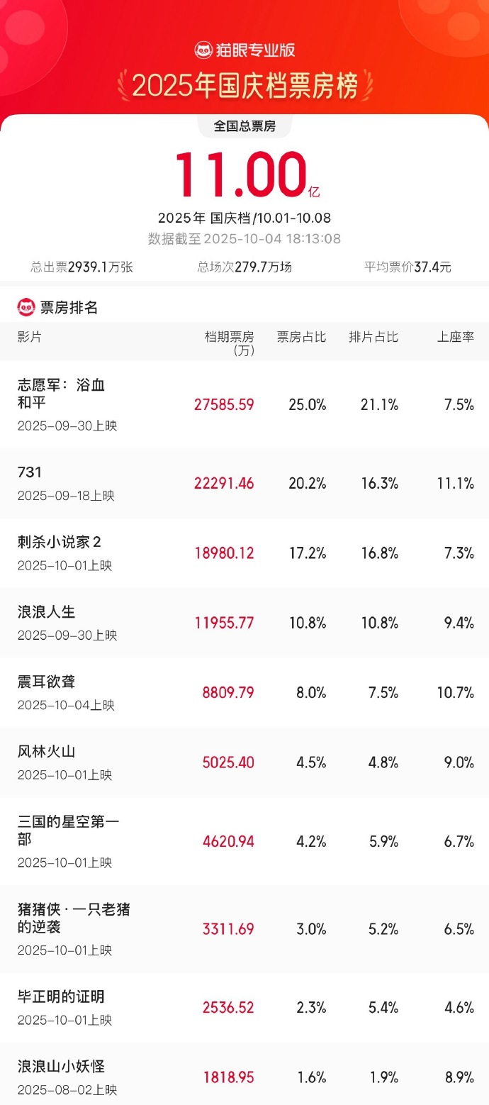 据猫眼专业版数据,截至10月4日18时13分,2025年国庆档档期票房破11亿,《志愿军