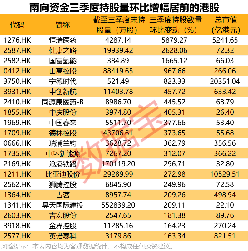 三季度38股获得南向资金持股量环比增长超100%。 南向资金年内净买入超1.1万亿港元 今年以来港股市场主要股指大幅上涨,恒生指数第三季度上涨11.56%,年内涨幅超过30%,恒生科技指数第三季度大涨21.93%,指数创2021年10月以来新高,恒生中国企业指数第三季度上涨10.11%。 据证券时报·数据宝统计,第三季度南向资金合计成交净流入4363.22亿港元,年内已累计净买入11675.15亿港元,超过2023年与2024年净买入金额之和。 多家机构研报认为,港股后续行情值得期待。方正证券研报认为,港股对全球流动性改善、美元走弱及风险偏好修复具备较好响应。从历史统计来看,恒生指数在美联储降息前后普遍出现阶段性反弹。相较标普500指数能够展现出稳定超额收益和较高胜率。另外,跨市场布局港股,均衡配置两地优质资产,有利于降低单一市场政策或情绪冲击影响。 中信建投证券认为,香港金管局6月以来已七度承接港元沽盘,累计承接港元相当于5月流入热钱的70%。预计随美联储降息,港美利差明显缩小下,短期再次触及弱方保证概率不高,流动性紧张有所缓解。同时外资不断上调港股市场及中国资产,外资有望持续流入。 南向资金加仓大型科技股 从上榜每日前十大活跃个股名单来看,三季度共有88只个股上榜,阿里巴巴-W三季度港股通成交总额最高,达到5738.58亿港元,中芯国际、腾讯控股、小米集团-W等5股港股通买卖总额均超过1000亿港元。 阿里巴巴-W三季度持续获得南向资金大手笔加仓,港股通成交总额、成交净买入金额均居于首位,港股通持股量已连续12周上升,续创港股通开通以来新高。三季度阿里巴巴-W持续上涨,累计上涨61.2%,最新总市值已达到3.53万亿港元,成为港股互联网巨头中本轮行情中表现最好的个股。 阿里巴巴日前发布公告,截至2025年9月30日的三季度,阿里巴巴以2.41亿美元回购了1700万股普通股(相当于约200万份美国存托股),这些回购在纽约证券交易所进行。相比于2025年6月30日,公司流通股净减少300万股普通股(约40万份美国存托股),净减少比例为0.02%(已计入股权激励计划下的股份发行)。 从成交净买入金额来看,多只大型科技股三季度获南向资金加仓,其中阿里巴巴-W三季度获南向资金净买入金额最高,达到877.08亿港元。另外美团-W获净买入211.22亿港元,腾讯控股获净买入143.58亿港元。上半年表现亮眼的泡泡玛特三季度遭到港股通抛售,净卖出金额40.74亿港元,居于首位。 行情上来看,前十大活跃个股中,11股三季度涨幅超过100%,药捷安康-B以368.33%的涨幅居首,汇量科技、鸿腾精密、东风集团股份紧随其后,分别为195.49%、171.49%、160.87%。 药捷安康-B三季度股价大幅度波动,该股今年6月23日上市,最低价为上市首日的20.2港元/股,最高价达到679.5港元/股,自最低价的最大涨幅达到3263.86%,9月16日创下最高点后,该股显著回撤,最新价较高点回撤幅度接近80%。 38股获南向资金持股量环比翻倍 从持股量变化来看,三季度38股获得南向资金持股量环比增长超100%,恒瑞医药居首,环比增长5879.27%;其他还有健康之路、国富氢能持股量环比增长1000%以上。 恒瑞医药三季度获得南向资金大手笔加仓,截至9月30日持股量为4287.14万股,7月以来连续三个月港股通持股量增长超过1000万股。恒瑞医药港股于今年5月23日上市,上市以来股价累计涨幅达到113.17%(包含上市首日涨幅),同期恒瑞医药A股涨幅为29.15%,港股表现显著强于A股。 从港股通持股占港股总股数比例来看,截至9月30日,三季度港股通环比增幅超过100%的个股中,长飞光纤光缆、昊天国际建投、一脉阳光持股比例居前,分别达到69.99%、59.78%、43.43%。 |