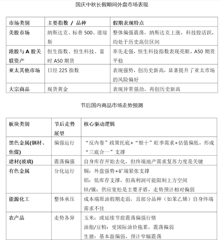 美股三大指数集体收跌 美股三大指数集体收跌,道指跌0.2%,纳指跌0.67%,标普500指数跌0.38%。热门科技股多数下跌,特斯拉跌超4%,谷歌跌超1%,AMD涨超3%,英特尔涨超1%。加密货币概念、半导体设备与材料跌幅居前,Strategy跌超8%,科休半导体跌超7%,科磊跌超4%,阿斯麦跌近4%,Coinbase跌超2%。煤炭、日用消费板块走高,雅诗兰黛涨超4%,宝洁、金佰利涨超1%。 纳斯达克中国金龙指数收跌2.24%,热门中概股普跌,世纪互联跌超6%,万国数据跌超5%,百度跌超4%,阿里巴巴、金山云跌超3%,哔哩哔哩跌近3%,京东、名创优品、理想汽车跌超2%。 COMEX黄金期货收涨0.79%,报4007.9美元/盎司;COMEX白银期货收跌1.64%,报47.655美元/盎司。 WTI原油期货收涨0.06%,报61.73美元/桶。布伦特原油期货收跌0.03%,报65.45美元/桶。 法国国债市场遭遇猛烈抛售 法国新一轮政治动荡正在搅动欧洲金融市场,投资者对该国财政稳定性的担忧急剧升温。10月6日,法国10年期国债收益率与德国国债的利差扩大至年内最高水平,超过89个基点。10月7日,法国国债市场再度遭遇猛烈抛售,法国10年期国债收益率一度升破3.6%,逼近2011年欧债危机期间的高位。 当地时间10月6日,刚被任命为法国国防部长的勒梅尔宣布退出政府。勒梅尔在社交媒体上发文解释其退出决定:“我注意到,我的决定引发了一些人难以理解且有失偏颇的反应。我希望这一决定能让围绕组建法国所需要的新政府的讨论得以重启。”勒梅尔此前曾担任了7年法国财政部长,是法国总统马克龙的亲密盟友,他在10月5日晚间刚被任命为国防部长,但仅一天后就宣布退出。他的退出决定是在法国总理勒科尔尼辞职后作出的。 据央视报道,勒科尔尼向马克龙递交辞呈,马克龙已接受辞呈。勒科尔尼上任不足30天,他在辞职讲话中坦言,由于不同政治派别的顽固立场,“执政的条件尚不具备”。马克龙与已辞职总理勒科尔尼再次举行会谈,要求后者在48小时内与各党派进行最终谈判。 勒科尔尼在社交媒体表示,将“与各方政治力量进行最终谈判,以维护国家稳定”,并于10月8日晚向总统汇报谈判结果。据悉,马克龙已就此表态,如果勒科尔尼在48小时内谈判失败,马克龙本人将“承担责任”。 未来48小时的谈判结果,将直接决定法国政局的走向以及市场的短期风险。 节后国内商品市场怎么走 国庆中秋长假期间,国内市场虽按下“暂停键”,但海外市场交易热度不减,整体表现强劲。这份“假期成绩单”不仅为节后 A 股开盘铺垫了积极氛围,更透露出全球市场的多重信号。 “不同于以往假期的波动,此次海外市场呈现出‘结构亮眼、情绪向好’的特征,三大看点尤为突出。” 国贸期货宏观首席分析师郑建鑫告诉期货日报记者,一是科技与半导体板块领涨,以港股为例,半导体板块成为上涨先锋,受高盛上调中芯国际、华虹半导体目标价等利好刺激,相关公司股价大幅上涨,反映出市场对AI驱动下半导体需求的乐观预期;二是黄金避险属性突出,现货黄金价格在假期期间强势突破历史关口,这背后既有地缘政治紧张带来的避险需求,也反映了市场对全球宏观经济的复杂情绪;三是市场情绪传导积极,与A股关联度极高的港股市场及富时A50期指表现坚挺,为A股节后开盘积累了积极的情绪动能。 在郑建鑫看来,长假期间外围市场的强劲表现并非突发行情,而是多重因素共振的结果,且多数已在市场预期之内。“美国国会两党对立持续激化,政府短期结束‘停摆’的概率下降,进一步刺激市场避险情绪。”郑建鑫表示。 近日,美国劳工统计局表示,政府“停摆”期间不发布或收集任何经济数据。在缺少官方就业报告的情况下,就业数据处理公司ADP发布的私营部门就业数据格外引人关注。数据显示,美国9月ADP就业人数减少3.2万人,远低于预期的增加5.1万人,前值为增加5.4万人。数据公布后,交易员显著提高了对年内美联储进一步降息2次的押注。在避险需求推动下,黄金价格创历史新高,比特币同步上涨,美国国债与美元则保持相对稳定。 此外,核心赛道利好集中兑现。“节前市场关注的半导体、黄金、AI芯片三大赛道,既是A股的高景气主线,也是假期利好的直接受益板块,直接推动相关板块上涨,完全符合市场节前的布局逻辑。”郑建鑫如是说。 尽管整体氛围向好,但海外市场并非“普涨”,而是呈现出明显的结构分化:股市方面,美股科技板块表现亮眼,欧洲三大股指(英国富时100、法国CAC40、德国DAX)10月6日却全线收跌,表现相对疲软。商品方面,贵金属是绝对的“主角”;农产品市场缺乏亮点,仅玉米期价微涨,小麦、大豆期价小幅下跌;能化板块承压,布伦特原油、WTI原油期价显著下跌,价格波动较为剧烈。 郑建鑫表示,贵金属价格强劲上涨是多种因素共同推动的结果。一方面,美国经济数据疲软强化美联储降息预期,叠加美国高额债务与政府“停摆”风险,进一步动摇美元信用,推动资金转向黄金;另一方面,地缘政治紧张局势及全球经济不确定性加剧,显著提振黄金作为传统避险资产的需求。此外,多国央行(特别是中国央行)持续增持黄金。调查显示,多数央行预计美元储备占比将下降,同时海外黄金ETF与期货资金持续流入,共同打开了金价新的上行空间。 对于金价的后续走势,目前市场观点整体偏乐观,多家主流金融机构给出积极预测。 不过,乐观之余也需保持警惕。郑建鑫认为,若市场对经济的风险偏好回升,或主要