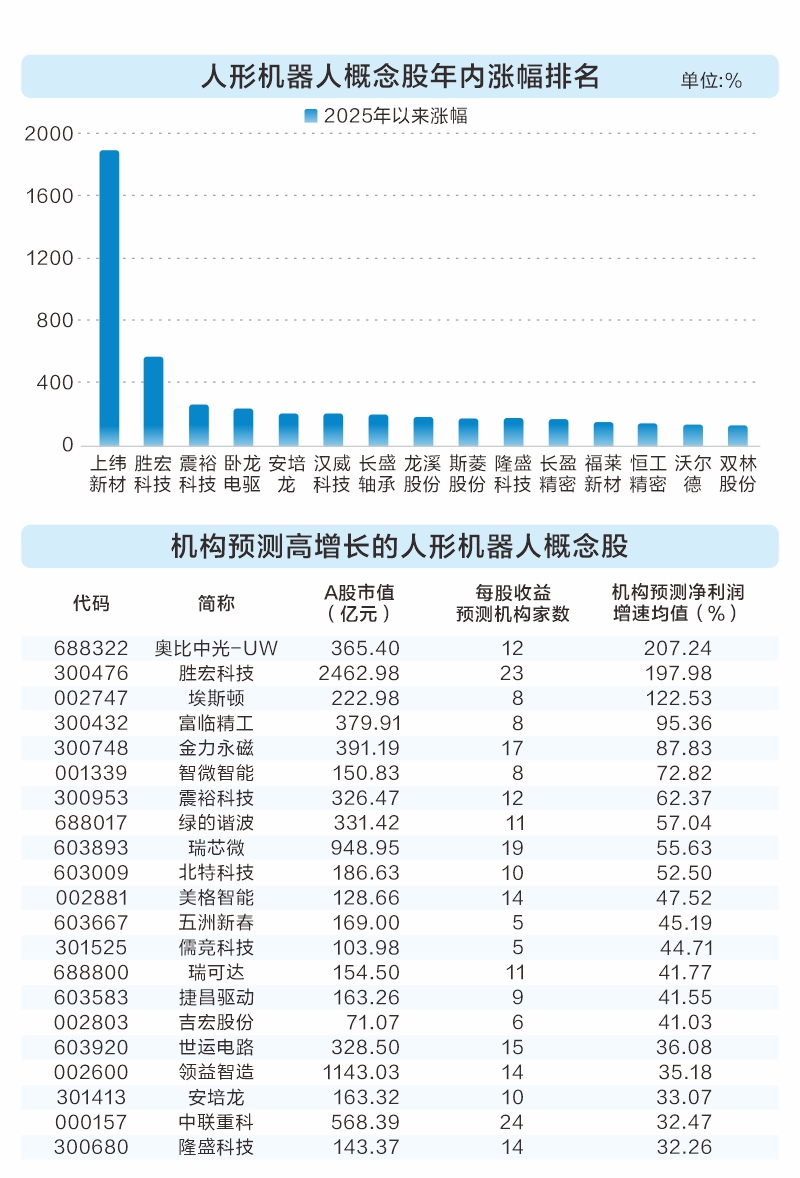 四季度资本市场的布局窗口已然开启,市场焦点正从估值修复转向具备明确增长逻辑的产业赛道。从“实验室”走向“应用场”的人形机器人、在深远海实现技术突破的风电产业、价格触底反弹的光伏板块,三大赛道齐头并进,把握科技突破与能源转型中的结构性机遇,或将成为穿越市场波动的关键。 证券时报记者 梁谦刚 人形机器人从未像今天一样密集出现在聚光灯下。 人形机器人集成人工智能、高端制造、新材料等先进技术,有望成为继计算机、智能手机、新能源汽车后的颠覆性产品,将深刻变革人类生产生活方式,重塑全球产业发展格局。 人形机器人跑出“加速度” 从2025年蛇年春晚舞台的机器人扭秧歌,到北京亦庄的机器人马拉松,再到浙江杭州的机器人格斗赛……人形机器人正逐渐“破圈”,从“实验室”迈向各类“应用场”。这不仅是对技术的“压力测试”,更展现了人形机器人从炫技表演逐步向实用场景突破的关键跃迁。 近期,一批企业动作不断。国外方面,9月30日下午,特斯拉通过官微宣布,特斯拉正在努力扩大人形机器人的规模,计划2025年底推出第三代,并在2026年开始量产。特斯拉首席执行官埃隆·马斯克预计,2030年前将年产100万台。 国内方面,9月30日,逐际动力宣布其全尺寸人形机器人Oli已实现全自主完成网球识别、跟踪、捡球、放置,以及行走、弯腰、深蹲,Oli基于主动感知的全身移动操作,全程自主完成,零动捕数据、非遥操。 宇树科技创始人、CEO王兴兴在第四届全球数字贸易博览会上发言称,宇树科技机器人算法今年已经历几次迭代,预计下半年将发布身高1.8米的人形机器人。 此前,傅利叶携第三代人形机器人GR-3C在2025上海工博会上完成首秀;开普勒机器人正式发布K2大黄蜂量产启动视频,宣告全球首款商业可售的混动架构人形机器人开始交付商业订单。 人形机器人产业 未来发展空间广阔 在政策支持和市场推动的双重作用下,中国人形机器人产业未来发展空间广阔。中国信通院发布的《人形机器人产业发展研究报告(2024年)》预计,2045年后,我国在用人形机器人超过1亿台,进入各行业领域,整机市场规模可达约10万亿元级别。 东方证券研报显示,在国内外人形机器人龙头公司的共同推动下,行业有望在明年进入量产阶段。站在量产的未来看今天,具备优秀制造和管理能力的零部件企业更加受益。 人形机器人概念股 表现火爆 近几年,人形机器人赛道加速升温,资本市场对该行业的关注度显著提升。二级市场上,布局人形机器人产业的相关概念股表现惊艳。 据证券时报·数据宝统计,截至9月30日,今年以来人形机器人概念股平均上涨83.6%,跑赢同期上证指数。年内涨幅翻倍的概念股多达25只。上纬新材、胜宏科技、震裕科技、卧龙电驱、安培龙等涨幅排在前5位。因智元机器人入主而备受关注的上纬新材,年内累计上涨1891.6%,成为年内A股涨幅榜冠军。 从未来增长潜力来看,不少人形机器人概念股获得机构看好。据数据宝统计,根据5家及以上机构一致预测,今明两年净利润增速均有望超20%的个股有27只。4只千亿市值的龙头股入围,分别是胜宏科技、汇川技术、领益智造、华勤技术。 机构预测净利润增速均值最高的前5只是奥比中光-UW、胜宏科技、埃斯顿、富临精工、金力永磁。奥比中光-UW获机构预测净利润增速均值为207.24%,排在首位。 平安证券研报表示,奥比中光-UW是国内3D视觉领先企业,构建了包括结构光、iToF、dToF、双目、Lidar、工业三维测量在内的全栈技术体系,产品性能对标国际巨头。机器人、三维扫描有望成为继生物识别后公司3D视觉技术的重要落地场景,也是公司拓展的重点发展方向,未来有望成为公司重要的业绩增长点。 在上述27只业绩有望高增长的人形机器人概念股中,截至9月30日,滚动市盈率较低的有中联重科、华勤技术、吉宏股份、世运电路、怡合达。 中联重科滚动市盈率为17.33倍,排在最低位置。据中联重科2025年半年报,公司已全新开发了3款人形机器人,包括1款轮式人形机器人与2款双足人形机器人,已有数十台进入工厂作业,在机械加工、物流、装配、质检等环节开展试点,加速产业化落地。 (本版专题数据由证券时报中心数据库提供) |