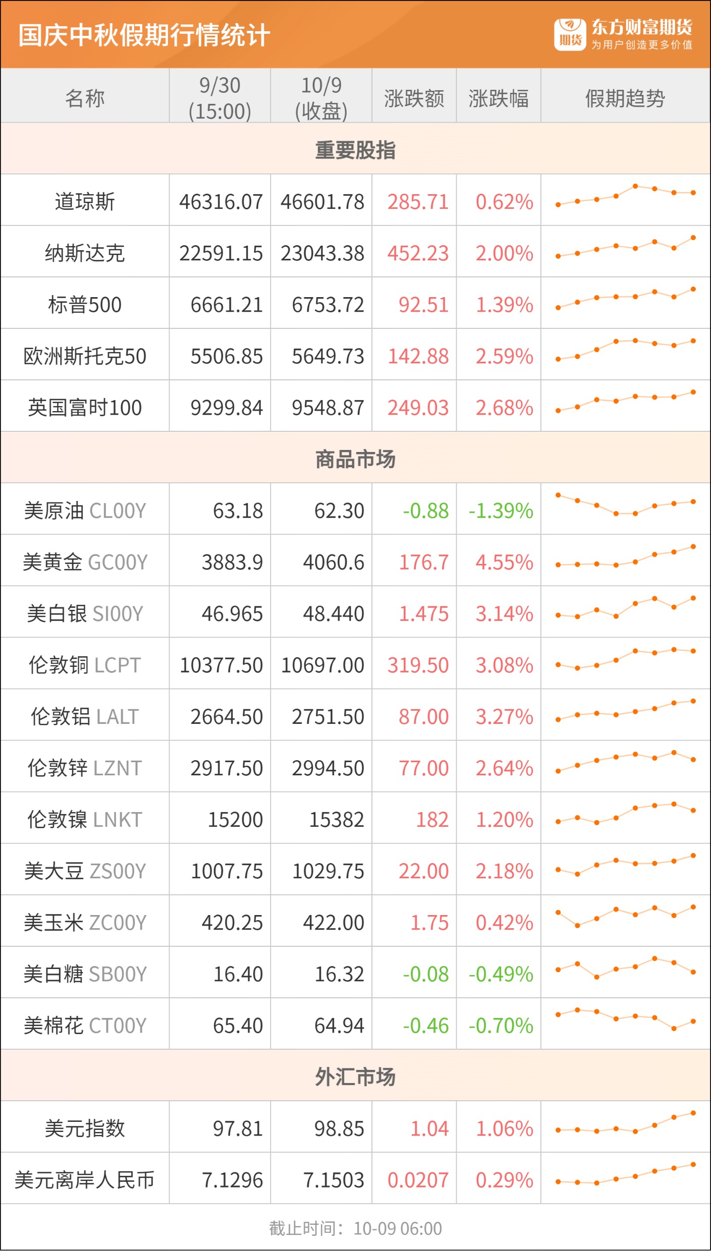 外盘行情![]() 每日精选金价又创历史新高!COMEX黄金期货升破4000美元/盎司 OPEC+继续小幅增产 市场份额战烽烟再起 储能市场迎来爆发期 碳酸锂是否有交易机会 宏观产经界面新闻:央行数据显示,中国9月末黄金储备报7406万盎司(约2303.523吨),环比增加4万盎司(约1.24吨),为连续第11个月增持黄金。截至9月末,我国外汇储备规模为33387亿美元,较8月末上升165亿美元,升幅为0.5%。 央视新闻:由于美国会参议院9月30日先后否决两党拨款法案,当地时间10月1日0时1分,美国联邦政府近7年以来再次关门,数十万联邦雇员不得不面临强制休假或被裁员,众多联邦部门的服务也“停摆”。当地时间30日晚,白宫管理和预算办公室(OMB)主任沃特发布备忘录,指示各政府机构开始执行其“有序停摆”的预案。 新华社:为保持银行体系流动性充裕,中国人民银行将于10月9日以固定数量、利率招标、多重价位中标方式开展11000亿元买断式逆回购操作,期限为3个月(91天)。记者了解到,10月份将有8000亿元3个月期买断式逆回购到期。由此,中国人民银行10月9日开展11000亿元买断式逆回购操作,意味着10月份3个月期买断式逆回购加量续作3000亿元。 品种资讯黑色系期货 钢材:欧盟7日公布钢铁进口限制措施,拟大幅削减可享受关税豁免的钢铁进口配额,将钢铁关税从25%上调至50%。根据欧盟委员会当日发布的公告,欧盟拟将年度钢铁进口配额设定为1830万吨,较2024年钢铁进口配额减少47%。对于配额外进口钢铁,欧盟拟加征50%关税,较当前25%关税增加一倍。(中国新闻网) 据中物联钢铁物流专业委员会最新发布报告,2025年9月国内钢铁行业PMI为47.7%,环比下降2.1个百分点,连续2个月环比下降,钢铁行业旺季特征并未显现。(澎湃新闻) 铁矿石:赢联盟西芒杜(WCS)在几内亚西芒杜大型铁矿石项目1号和2号区块。发生致命事故,造成三名外国工人死亡,该项目已暂停运营并启动全面安全审查。这是西芒杜矿区在不到两个月的时间的第二次因事故导致停产。(SMM) 焦炭:焦炭提涨于10月1日落地,焦企在利润改善之后,主动减产可能较小,在供应过剩和库存压力拖累下,焦炭价格或开始回调,来平衡供需与利润。10月焦炭市场预计呈现高位震荡格局,价格涨后或出现回调。(我的钢铁网) 农产品期货 棕榈油:据马来西亚棕榈油协会(MPOA)发布的数据,马来西亚9月1-30日棕榈油产量预估减少2.35%,其中马来半岛减少6.17%,沙巴增加2.35%,沙捞越增加6.62%,东马来西亚增加3.44%,预估9月马来西亚棕榈油总产量为181万吨。 印尼能源部长重申2026年实施B50生物柴油计划,以停止汽油进口。 交易商称,印度9月份棕榈油进口量环比下降15.9%,至83.3万吨,为四个月以来最低水平。(财联社) 大豆:巴西经济防卫行政委员会(Cade)近日裁定,自2026年1月1日起恢复执行“黄豆禁伐令”,而在此之前,该措施将暂时中止。“黄豆禁伐令”是由多家大型贸易公司和出口商自2008年起签署的自律协议,禁止收购在亚马孙法定保护区内2008年之后开垦的土地上生产的黄豆,即便这些开垦行为符合2012年《森林法典》的规定。(新华财经) 随着美国大豆进入收获季节,美国政府正努力安抚因大豆滞销而面临巨额损失的豆农。美国商务部长贝森特上周表示,特朗普政府最快将于周二(10月7日)宣布对农民,“特别是大豆农民”提供的实质性支持措施。(第一财经) 有色/贵金属期货 沪金:10月8日,现货黄金突破4000美元/盎司,续创历史新高,年内涨幅超52%。随着国际金价走高,10月8日,国内多个金饰品牌克价再创新高,多家站上1160元/克。老庙黄金金饰价格达到1176元/克,周生生足金饰品标价达到1165元/克;周大福为1162元/克;老凤祥价格达到1160元/克。(每日经济新闻) 沪铜:高盛发布研报称,基于资源限制及关键行业的结构性需求增长,料铜价将徘徊于每吨10000至11000美元水平。该行将2026年的铜价预测由每吨10000元上调至10500元,因考虑到印尼格拉斯伯格(Grasberg)矿场停产、美国减息以及美元进一步贬值,同时维持对2027年每吨10750元的预测,并料2025年余下时间铜价维持于10000元水平。(财联社) 沪铝:高盛预计LME铝价将从目前的每吨2700美元下跌至2026年第四季度的最低每吨2350美元,但这一预估低点高于此前预测的2026年3月的2100美元。(财联社) 碳酸锂:10月是锂电材料的传统旺季,今年10月碳酸锂需求量预计将达到12万吨,需求量再次创出历史新高,环比9月预计增长3.4%,而10月国内碳酸锂产量预计达到8.5万吨,进口量将实现2.4万吨,但仍将产生较大的月度缺口,预计10月仍保持去库的趋势,碳酸锂现货价格预计维持在7-7.5万元的区间波动。(我的钢铁网) 工业硅:部分硅片企业国庆节后才公布排产计划,激进预期下硅片企业10月减产幅度或很小,后续仍需观察原料价格以及下游传导情况。整体Q4根据协会配额,硅片企业基本确定减产。临近月末,部分外销电池厂为严控库存,主动加强对核心客户的出货力度,推动整体库存水平降至3-4GW。 (上海有色网) 能化期货 原油:美国至10月3日当周API原油库存增加278万桶,预期增加225万桶,前值减少367.4万桶。 阿联酋阿布扎比国家石油公司ADNOC将11月穆尔班原油官方售价定为每桶70.22美元。 EIA短期能源展望报告预计2025年布伦特价格为68.64美元/桶,此前预期为67.80美元/桶。预计2025年WTI原油价格为65.00美元/桶,此前预期为64.16美元/桶。EIA上调2025年美国石油产量预期至1353万桶/日(之前预计产出1344万桶/日