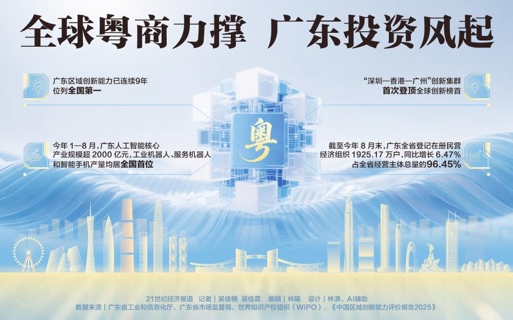 当“中国经济第一大省”广东正在激活投资动能的时候,粤商成为一股关键力量。 9月28日~30日,2025世界粤商大会在广州召开。这场每两年召开一次的大会,既是粤商崭露发展新形象的舞台,也是广东招商引资、聚合资源的一个重要契机。今年,来自全球60个国家和地区的近千名粤商代表参会,其中不乏世界500强、中国500强、广东省民营企业100强企业。 他们并非空手而来,也没有空手而归。仅现场签约的项目就有24个,总投资额达444.58亿元,涵盖人工智能、半导体、网络与通信等重点产业领域,聚焦科技创新、深耕实体经济、联动海内外资源的特性异常鲜明。 这是广东投资潜能的一个缩影,也是粤商在经济高质量发展中加码投资广东的新逻辑。 “广东确实是太特殊了,创业环境非常好,也很宜居,我永远不会离开这里。”具身智能行业企业帕西尼创始人许晋诚说。 广东省工商联主席、研祥高科技控股集团董事局主席陈志列表示,要“再造一个新广东”,还需要更多新鲜血液的加入,欢迎来自未来产业、战新产业和传统产业在内的任何领域的企业到广东投资、赚钱。 科技突围 “我是一名在广东扎根近二十年的创业者,自2007年创业起,我们始终扎根于广东这片创业热土,亲历并推动着广东制造业从传统制造向智能制造的转型升级。”全国人大代表、全国工商联执委、广东拓斯达科技股份有限公司董事长吴丰礼表示,企业成为首家登陆创业板的机器人骨干企业,再到如今积极拥抱人工智能技术,每一步都离不开广东制造业发展的大环境。 众所周知,广东是民营经济大省。截至8月末,广东全省登记在册民营经济组织1925.17万户,同比增长6.47%,占全省经营主体总量的96.45%。其中,私营企业834.53万户,同比增长10.6%;个体工商户1090.64万户,同比增长3.52%。这就是粤商的多元生态。有与会嘉宾打趣地说,广东的特产是“老板”。 但是,“老板们”也正处于全球经济周期新旧交替、市场竞争日益激烈的环境下,粤商又该如何拓展全球市场份额? 科技创新是必选题。 TCL创始人、董事长李东生表示,大湾区作为全国创新高地,集聚7.6万家国家级高新技术企业,研发经费投入强度位居全国首位,期待与更多企业共建联合实验室和技术创新联盟,特别是在AI大模型工业应用、半导体显示等关键领域协同攻关。 最新数据显示,广东区域创新能力已连续9年位列全国第一,同时“深圳—香港—广州”创新集群首次登顶全球创新榜首。 一组数据勾勒出广东产业变革的壮阔图景:已形成9个万亿级产业集群,8个先进制造业集群入选国家队。今年1—8月,广东人工智能核心产业规模超2000亿元,工业机器人、服务机器人和智能手机产量均居全国首位。 大会现场授予的100位“广东省非公有制经济人士优秀中国特色社会主义事业建设者”称号获奖者,以及获得“广东省光彩事业贡献奖”的38家企业中,既有在人工智能、新能源、高端制造、新材料等前沿科技与新兴产业表现突出的企业家和创业者,还有来自建材家居、消费品等传统行业的企业代表,这都指向了广东的坚实根基——制造业与实体经济。以制造根基为积淀,粤商更有信心推动形成有强大竞争力、抗风险能力强的产业生态。 “工厂门口就是市场。”吴丰礼表示,广东有非常多得天独厚的优势,强大的产业集群为机器人企业提供了非常广阔的验证场景,对于广大科技型公司来说更是有着很大的支持力度。 如今,粤商在多个前沿领域并行发力,推动着广东新兴产业滚滚向前:腾讯混元模型登顶开源热榜;华为的三折叠屏手机宣告高端芯片突破重围;帕西尼、众擎、逐际动力获得投资者融资青睐;小马智行、文远知行驰骋在城市智能驾驶的试验场;小鹏汇天、亿航智能勾勒出未来城市的低空交通图景…… 在营商环境方面,广东也动作频频,《广东省优化营商环境条例》等政策文件密集出台,从市场准入、融资支持、营商环境等方面为民营经济注入强劲动力,密集地向民营企业释放积极信号,让粤商以新技术、新模式、新业态为突破口,构建面向未来的核心竞争力。 广东省工商联主席、研祥高科技控股集团董事局主席陈志列告诉南方财经记者,如今广东民营经济体量巨大,粤商遍布全球。要“再造一个新广东”,还需要更多新鲜血液的加入。广东欢迎来自未来产业、战新产业和传统产业在内,任何领域的企业到广东投资、赚钱。 “只有在广东这个地方可以用最少的资金,用最快的时间去进行大量的验证,做出最好的产品。”作为“新鲜血液”的代表之一,许晋诚回国创业前考察了美国、日本等多个地方后,最终选择在广东进行具身智能领域创业,他表示,“广东是全世界范围内极少数拥有成熟供应链和丰富产业集群的地方,营商环境让创业者很舒服。” 布局全球 改革开放至今,粤商的“出海经”已经写了四十多年:广州希音构建的时尚产业互联网成为连接中国制造与全球市场的桥梁;深圳比亚迪斩获全球新能源汽车销冠;惠州亿纬锂能把工厂搬到马来西亚用锂电接通全球;拓斯达上半年海外销售同比增长48%,实现全球布局的东莞智造…… “企业不出海就出局,只有出海才能开新局。”全国政协常委、粤港澳大湾区企业家联盟主席、香港中华总商会会长蔡冠深在2025世界粤商大会上的发言让人深思。蔡冠深的发言与本届世界粤商大会主题“粤联四海 商创未来”不