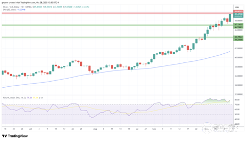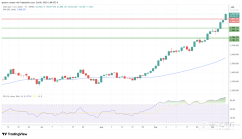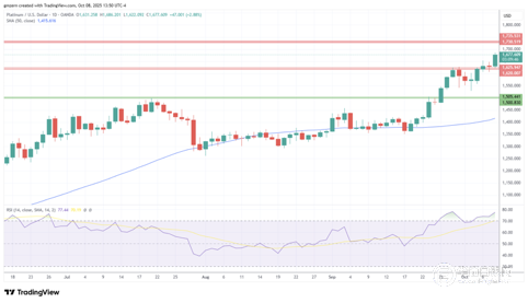 【华通白银网10月9日讯】•金价继续上涨,创下新高。 •白银攀升至49.60-49.80美元阻力位。 •铂金触及多年高点。 黄金 金价攀升至重要心理关口4000美元上方,继续强劲反弹。 从技术面来看,黄金处于极度超买的区域。FOMO交易推高了价格,因此交易者将继续关注动量。 白银 随着金银比跌破82.00,白银测试了新高。目前,白银距离测试历史高点只有一步之遥。 如果成功测试49.60-49.80美元阻力位,那么白银将获得额外上行动力机会。 铂金 在贵金属市场普遍上扬之际,铂金攀升至1620-1625美元阻力位上方。 突破1675美元将推动铂金向下一个阻力位1730-1735美元挺进。 截止北京时间09:40,华通现货白银定盘价报11206元。 白银网 |