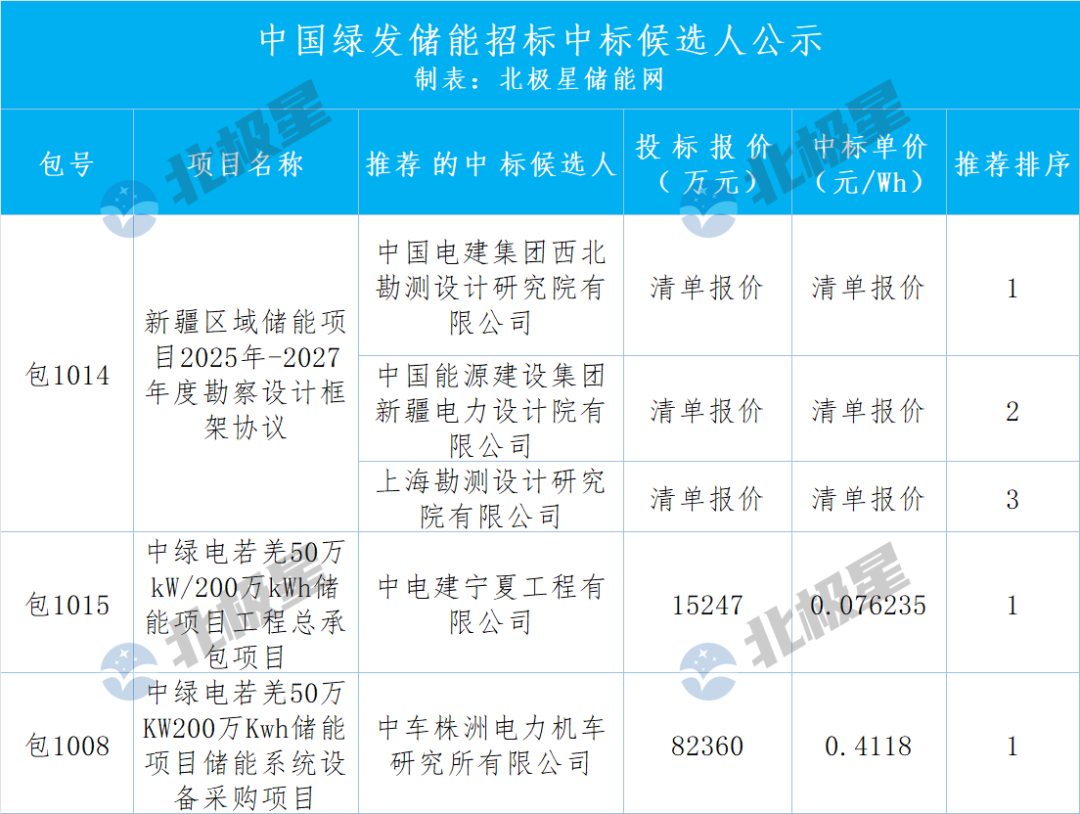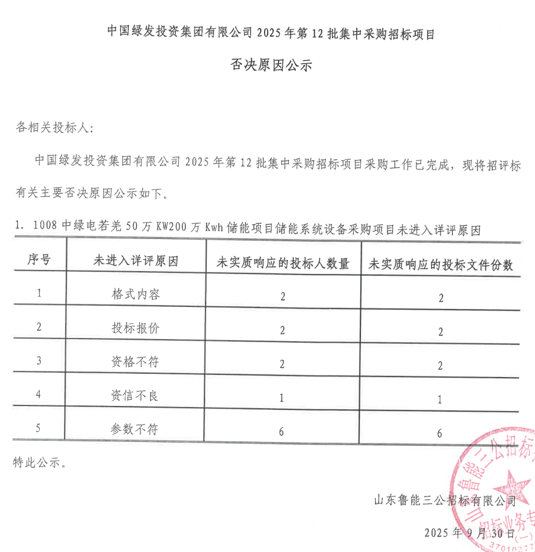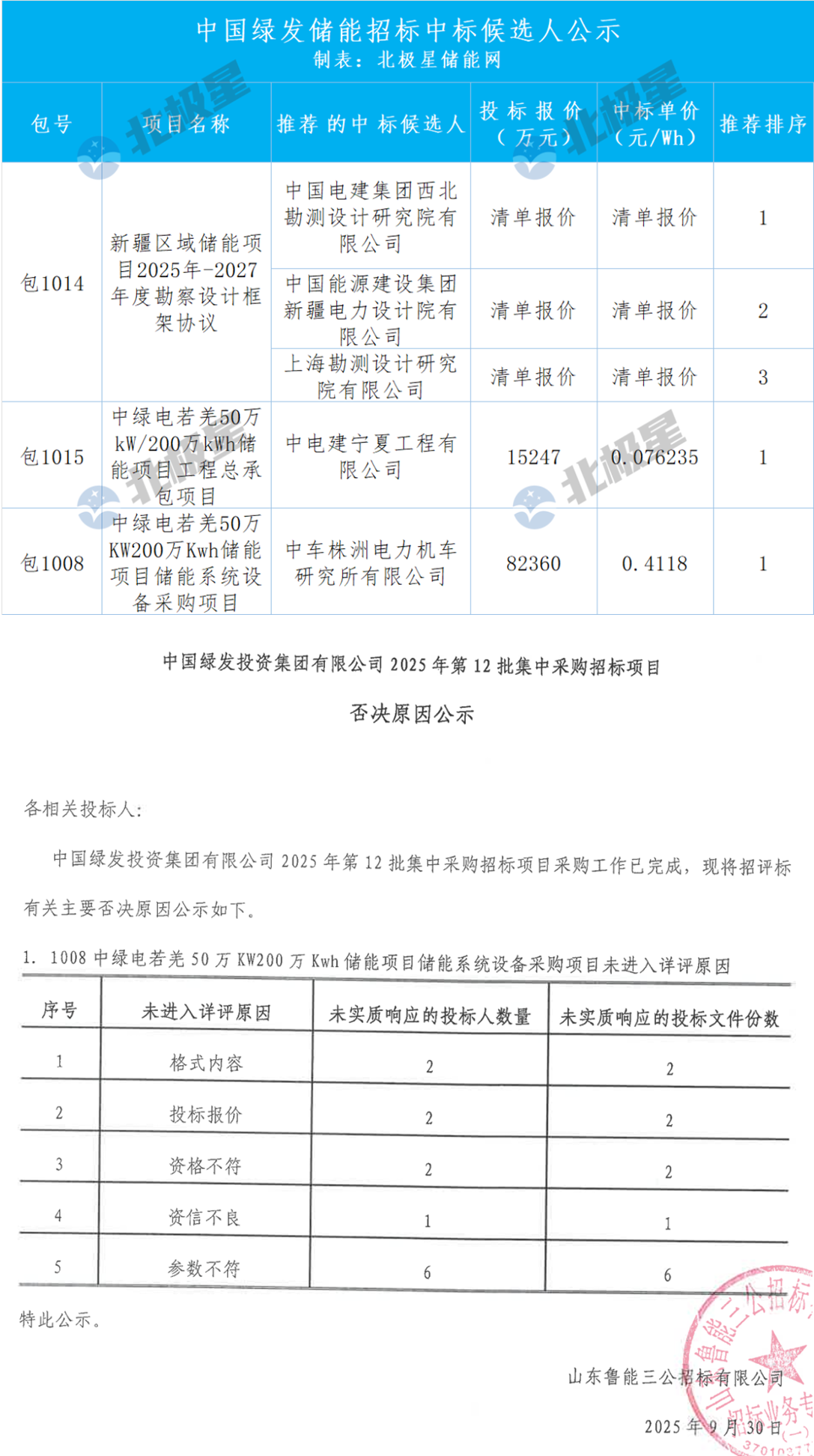 中国绿发新疆若羌500MW/2GWh储能项目EPC及储能系统采购中,中电建西北院中标项目EPC,中车株洲所以0.412元/Wh中标储能设备采购。值得注意的是,储能设备投标企业中,有13家企业被否决,具体详情如下。