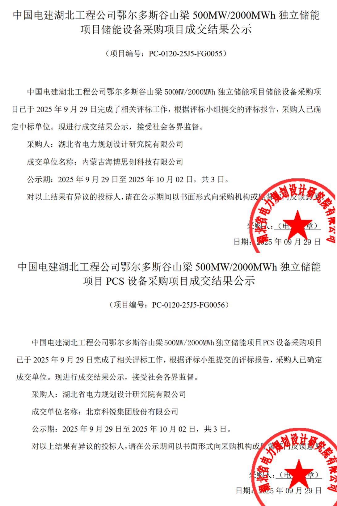 另外,中国电建湖北工程公司的内蒙古鄂尔多斯谷山梁500MW/2000MWh独立储能项目储能设备采购中,海博思创获得中标;与此同时北京科锐中标该项目的储能PCS采购。