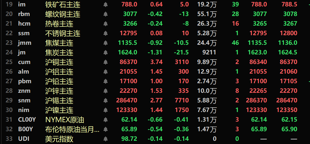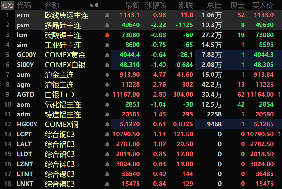 SMM10月9日讯: 金属市场方面: 截至午间收盘,内盘基本金属全线上涨,沪铜涨3.74%。沪铝涨1.45,沪铅涨1%,沪锡涨2.77%,沪镍涨1.44%,沪锌涨1.53%。 此外,铸造铝主连期货涨1.45%,氧化铝主连跌1.04%。碳酸锂主连跌0.08%,工业硅主连跌0.75%。多晶硅主连跌2.22%。 黑色系多飘绿,铁矿涨0.64%,螺纹跌0.42%,热卷跌0.24%,不锈钢微涨。双焦方面:焦煤主力合约跌0.92%,焦炭主力合约跌1.31%。 外盘金属方面,截至11:41分,LME金属均上扬,伦铜涨1.14%,伦铝涨1.07%,伦锌涨0.63%,伦铅涨0.85%,伦镍涨0.84%,伦锡涨0.4%。 贵金属方面,截至11:41分,COMEX黄金跌0.64%,COMEX白银跌1.4%。内盘贵金属方面:沪金主连涨4.77%,盘中刷新历史新高至918.88元/克;沪银主连涨2.76%,盘中刷新历史新高至11299元/千克。 截至午间收盘,欧线集运主力合约涨0.98%,报1133.1点。 截至10月9日11:41分,部分期货午间行情: 》10月9日SMM金属现货价格 现货及基本面 银:受国庆中秋节假日海外市场银价大幅上涨提振,国内市场白银TD高开高走,TD-沪银主力2512合约基差扩大至60-65元/千克。上海地区大厂银锭对TD升水8-10元/千克或对沪期银2512合约贴水……》点击查看详情 宏观面 国内方面: 【商务部:对稀土相关技术和境外相关稀土物项实施出口管制】商务部公告,对稀土相关技术和境外相关稀土物项实施出口管制。公告规定,境外特定出口经营者在向中国以外的地区出口稀土物项前,必须获得中国商务部颁发的两用物项出口许可证件;公告还对向境外军事用户的出口申请、用于或可能用于军事用途的出口申请等情况进行了规定。》点击查看详情 【国庆中秋假期日均出入境204.3万人次 同比增长11.5%】记者9日从国家移民管理局获悉,今年国庆、中秋假期全国边检机关共计保障1634.3万人次中外人员出入境,日均204.3万人次,较去年同期增长11.5%,单日出入境通关最高峰出现在10月4日,达235.3万人次。其中,内地居民出入境916.5万人次,较去年同期增长9.6%;港澳台居民574.4万人次,较去年同期增长12.2%;外国人143.4万人次,较去年同期增长21.6%;入境外国人75.1万人次,适用免签政策入境53.5万人次,较去年同期分别增长19.8%、46.8%。共计查验出入境交通运输工具74.4万架(艘、列、辆)次,较去年同期增长11%。 (新华社) 【国庆中秋假期全国消费相关行业日均销售收入同比增长4.5%】国家税务总局最新增值税发票数据显示,国庆中秋假期全国消费相关行业日均销售收入同比增长4.5%。其中,商品消费和服务消费同比分别增长3.9%和7.6%,数码产品、汽车消费增长较快,旅游、文化艺术体育服务需求强劲,食品及保健品消费平稳增长。 (新华社) 【两部门:到2027年 新制定云计算国家标准和行业标准30项以上】工业和信息化部、国家标准化管理委员会9日联合发布《云计算综合标准化体系建设指南(2025版)》。其中提出,到2027年,新制定云计算国家标准和行业标准30项以上,不断健全云计算产业标准体系。开展标准宣贯和实施推广的企业超过1000家,以标准赋能企业数字化转型升级的成效更加凸显。加快云计算领域国际标准供给,促进产业全球化发展。 中国人民银行10月9日以固定利率、数量招标方式开展了6120亿元7天期逆回购操作。 ►10月9日银行间外汇市场人民币汇率中间价为1美元对人民币7.1102元 美元方面: 截至11:41分,美元指数跌0.14%,报98.12。市场面临美国政府的继续停摆,当地时间周三,美国参议院第六次否决了两党相互较劲的政府拨款法案。参议院多数派领袖图恩计划最早于周四推动参议院就共和党的权宜支出法案和民主党的替代方案进行第七次投票。 美联储周三公布的9月16-17日会议记录显示,决策者在最近的政策会议上一致认为,美国就业市场的风险已经增加到足以支持降息的程度,但在围绕借贷成本对经济造成多大压力的辩论中,他们仍对高通胀保持警惕。根据芝商所FedWatch工具,市场预期10月和12月各降息25个基点的可能性分别为95%和83%。(文华综合) 其他货币方面: 东京市场的投资者开始怀疑日本央行是否会在10月甚至12月加息。日本第三季度经济依然疲软,央行总裁植田和男最近强调了日本央行所面临的不确定前景。这表明数据可能还不支持加息,而日本新政府如若改变政策,只会增加近期的不确定性。东短研究/ICAP 对日本央行 10 月底加息几率的预估已降至 27%。12月加息几率仍有44%,但随着新政府上台,预期势必会发生变化。日本央行副行长内田真一与央行行长同为中间派,上周他对经济的看法似乎更加乐观 ,但最新日本央行分行经理会议报告强调了经济前景的不确定性,尤其是与工资有关的不确定性,同时总体保持乐观。一些前日本央行专家最近也表达了他们对日本央行政策的看法。前副总裁若田部昌澄认为今年加息的理由很难成立,赞同央行谨慎推进政策正常化。前日本央行调查统计局长龟田制作强调工资前景是日本央行政策的关键,他显然同意植田和男的观点,认为需要谨慎行事,尤其是考虑到美国关税影响的不确定性依然存在。前日本央行理事、现任职瑞穗信息综研的门间一夫表示,近期日元下跌可能催促日本央行在本月加息,但他认为央行会等到 12 月。(汇通财经) 数据方面: 今日将公布德国8月季调后出口月率、美国9月非农就业人口变动季调后(10/9-10/10)、美国9月平均每小时工资年率(10/9-10/10)、美国9月私营企业非农就业人数变动(10/9-10/10)、美国9月劳动参与率(10/9-10/10)