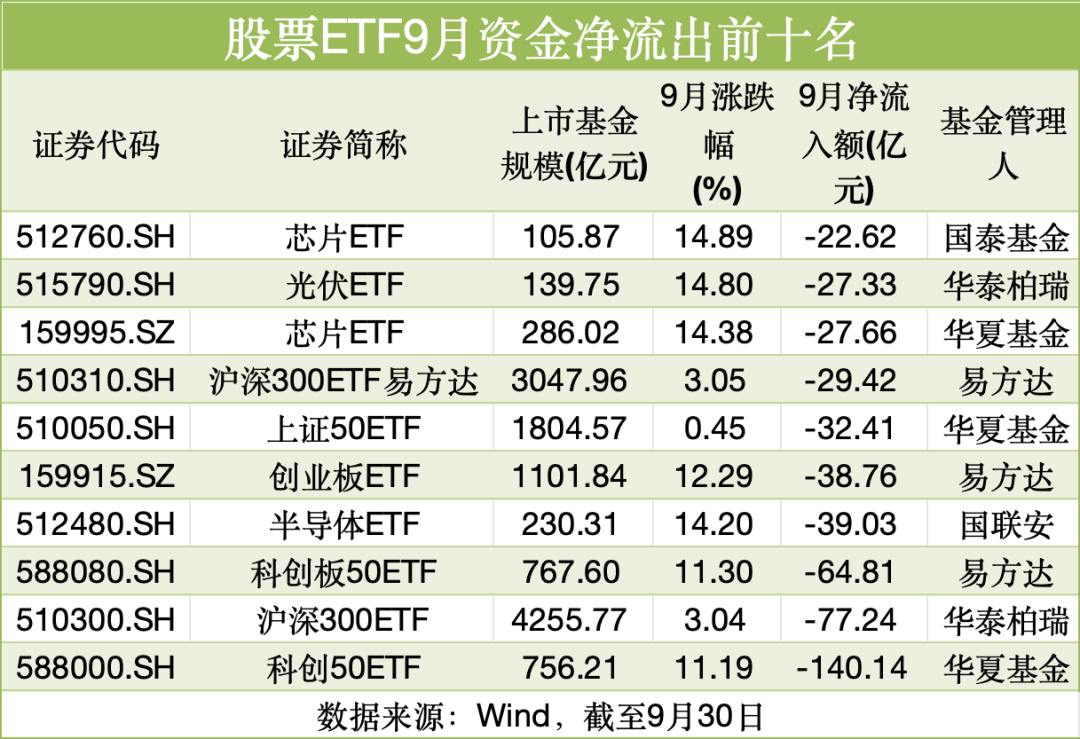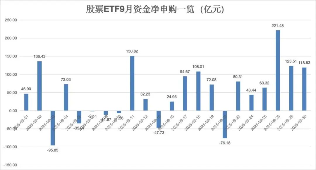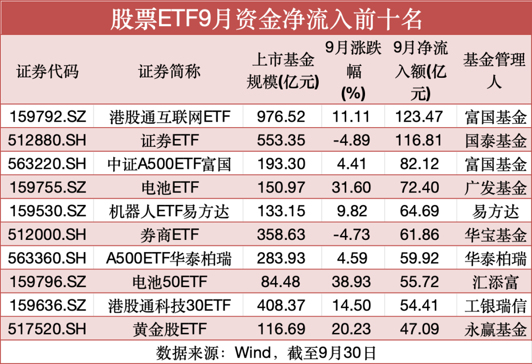 国庆中秋长假后第一个交易日,上证指数时隔十年再次突破3900点关口。而在9月份,股票ETF市场迎来超千亿元资金进场布局。 据银河证券基金研究中心数据统计,股票ETF市场9月份合计“吸金”超1100亿元,这也是今年继4月之后,股票ETF市场月度资金净流入再次突破千亿元。 从资金流向上看,跟踪港股通互联网指数、证券指数的ETF月度资金净流入超过百亿元,跟踪中证A500指数、电池指数、黄金股指数的相关ETF也有较大的资金净流入。 股票ETF9月“吸金”超千亿元 9月最后一个交易日,股票ETF市场再现百亿元资金净流入,推动当月股票ETF资金净流入突破千亿元大关。 据银河证券基金研究中心数据统计,股票ETF市场9月份合计“吸金”1113.64亿元。其中,9月29日、9月30日,也就是9月最后两个交易日,连续出现百亿元级的资金净流入,分别为123.51亿元、118.83亿元。 仅从9月30日看,债券与行业主题ETF净流入居前,分别达68.11亿元和67.48亿元。具体到指数维度,跟踪中证短融指数的ETF资金净流入居前,达50.58亿元;跟踪上证50指数的ETF净流出居前,达10.55亿元。从最近5个交易日角度观测,资金流入跟踪中证A500指数的ETF超211亿元,流入跟踪半导体材料设备指数的ETF超55亿元。 大型基金公司旗下部分ETF继续保持资金净流入。易方达基金旗下ETF最新规模达到8254.0亿元,9月30日增加76.2亿元。 其中,创业板ETF资金净流入5.8亿元,最新规模超1100亿元。此外,恒生科技ETF易方达资金净流入2.9亿元,港股通互联网ETF净流入2.8亿元,证券保险ETF净流入2.4亿元,科创创业ETF净流入2.0亿元。 华夏基金旗下ETF中,9月30日,科创半导体ETF和游戏ETF资金净流入居前,分别为1.83亿元和1.8亿元;最新规模分别达27.9亿元和106.97亿元,对应跟踪指数近一月的日均成交额分别为2.89亿元和8.02亿元。 部分股票ETF资金净流入超百亿元 9月份超千亿元资金涌入股票ETF市场,单只产品也出现较为可观的资金净流入,部分股票ETF资金净流入超过百亿元。 据Wind数据统计,富国港股通互联网ETF、国泰证券ETF资金净流入均超百亿元,分别达到123.47 亿元、116.81亿元;富国中证A500ETF、广发电池ETF、易方达机器人ETF紧随其后,净流入金额分别为82.12 亿元、72.40亿元、64.69亿元。 此外,华宝券商ETF、华泰柏瑞A500ETF、汇添富电池50ETF、工银瑞信港股通科技30ETF也均有50亿元以上的资金净流入。 资金净流出方面,跟踪科创50指数、沪深300指数、创业板指数、半导体及芯片指数的相关ETF遭到不同程度的获利了结。 |