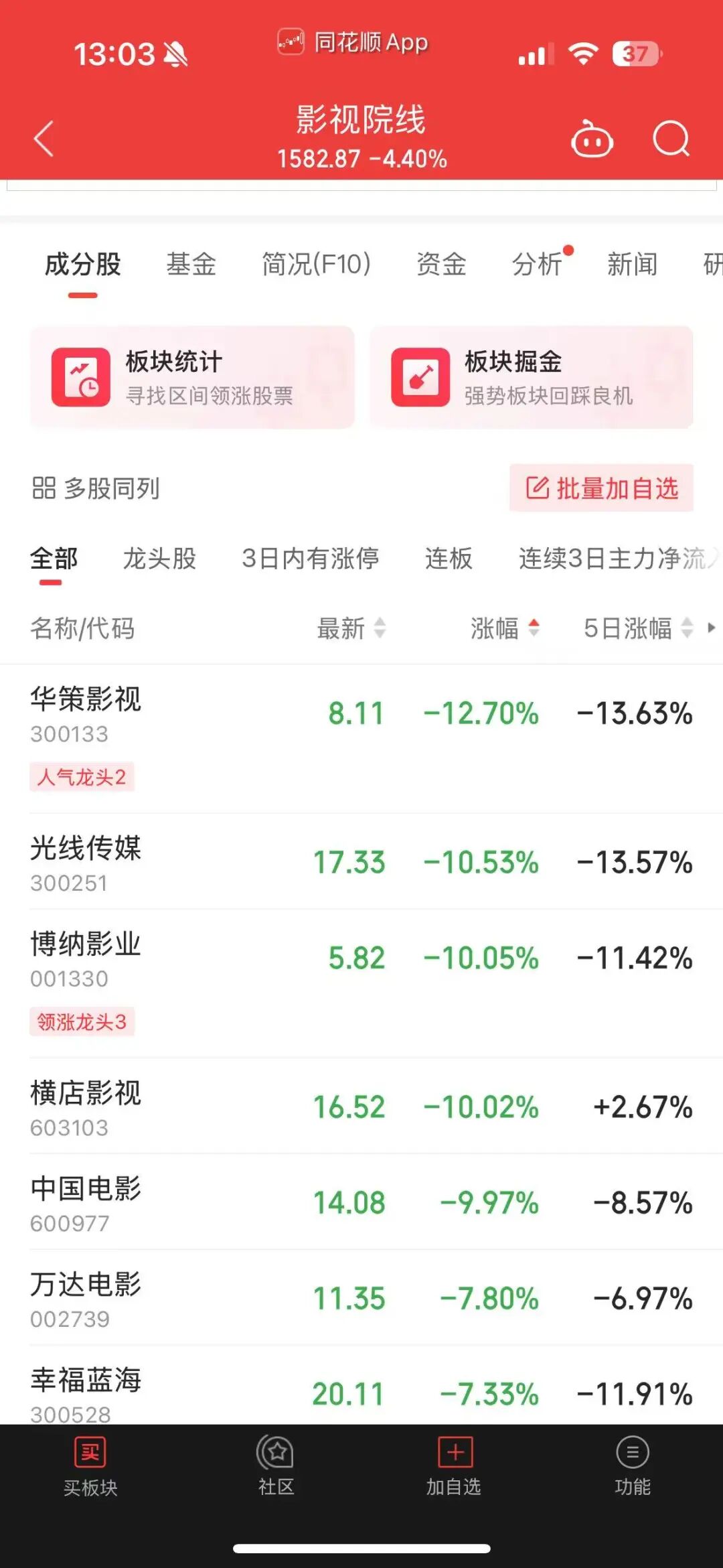 10月9日,国庆长假后开盘第一天,影视院线板块整体下滑。 同花顺APP显示,截至13时许,影视院线板块跌幅为4.42%。多家影视公司股价同步大跌,华策影视(300133.SZ)大跌12.70%、光线传媒(300251.SZ)跌10.48%,博纳影业(001330.SZ)跌10.05%、横店影视(603103.SH)、中国电影(600977.SH)跌停,万达电影(002739.SZ)、幸福蓝海(300528.SZ)跌超7%。 刚刚落下帷幕的国庆档表现不温不火,这或许在一定程度上影响了今日股票的走势。 根据国家电影局统计,2025年国庆档电影总票房为18.35亿元,不及去年和前年。综合灯塔和猫眼专业版数据,今年国庆档平均票价降至36.6元;而且今年国庆档的观影人次较2024年国庆档的5209万也减少约202万人次。 一位文娱行业分析师告诉第一财经记者,国庆节后影视板块的下跌是正常的调整,此前暑期档和春节档期间,影视板块曾有过较快的增长。 猫眼娱乐市场分析师赖力表示,今年国庆档新片供给丰富、类型多元,但由于缺乏爆款头部影片的带动,吸引力稍显不足,市场表现相对黯淡。档期内无单片单日票房破亿,无影片票房破5亿,两部IP续作成今年国庆档新片票房主力。 |