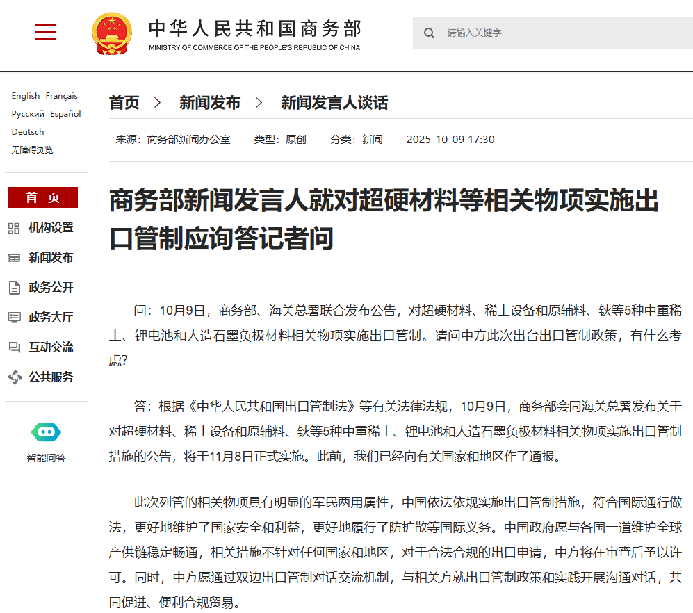 问:10月9日,商务部、海关总署联合发布公告,对超硬材料、稀土设备和原辅料、钬等5种中重稀土、锂电池和人造石墨负极材料相关物项实施出口管制。请问中方此次出台出口管制政策,有什么考虑? 答:根据《中华人民共和国出口管制法》等有关法律法规,10月9日,商务部会同海关总署发布关于对超硬材料、稀土设备和原辅料、钬等5种中重稀土、锂电池和人造石墨负极材料相关物项实施出口管制措施的公告,将于11月8日正式实施。此前,我们已经向有关国家和地区作了通报。 此次列管的相关物项具有明显的军民两用属性,中国依法依规实施出口管制措施,符合国际通行做法,更好地维护了国家安全和利益,更好地履行了防扩散等国际义务。中国政府愿与各国一道维护全球产供链稳定畅通,相关措施不针对任何国家和地区,对于合法合规的出口申请,中方将在审查后予以许可。同时,中方愿通过双边出口管制对话交流机制,与相关方就出口管制政策和实践开展沟通对话,共同促进、便利合规贸易。