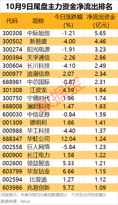 6个行业获主力资金净流入。 据证券时报·数据宝统计,今日(10月9日)沪深两市主力资金净流出255.37亿元,其中创业板净流出121.83亿元,沪深300成份股净流出137.82亿元。 行业板块方面,申万一级23个行业上涨,有色金属行业涨幅居首,达7.6%;钢铁和煤炭行业涨幅均在3%及以上,公用事业、电子、建筑装饰和电力设备行业均涨超2%。8个下跌行业中,传媒、房地产和社会服务行业跌幅居前,均超1%。 从资金流向来看,申万一级行业中,6个行业获主力资金净流入。有色金属行业净流入金额居首,达9.65亿元;建筑材料和建筑装饰行业净流入均在1.1亿元以上,纺织服饰、环保和美容护理行业净流入均超7300万元。 25个主力资金净流出的行业中,非银金融、电子和电力设备行业净流出金额居前,均超35亿元;传媒、国防军工、机械设备和家用电器行业净流出均超14亿元。 通信龙头股获主力资金抢筹居首 从个股来看,99股主力资金净流入均超1亿元,其中33股净流入均超2亿元。 通信龙头股中兴通讯盘中涨停,收盘涨9.51%,主力资金净流入30.24亿元,居首。消息面上,近日,在最新GAIA 评测基准榜单中,中兴通讯开源的“Co-Sight超级智能体2.0”再次以84.39%的综合成绩位列全球第一,成为首个登顶该榜单的中国超级智能体。此次登顶GAIA榜单,不仅彰显了中兴通讯在通用人工智能领域的技术实力,也标志着中国企业在智能体核心技术自主创新上的重要突破。 安防龙头股海康威视主力资金净流入13.76亿元,居次席。海康威视公布2025年中期权益分派方案,拟每10股派4元,股权登记日为10月9日,除权除息日为10月10日,派息日为10月10日,合计派发现金红利36.66亿元。 此外,还有比亚迪、视觉中国、融发核电、金力永磁、上海电气等热门股主力资金净流入居前,均超4亿元。视觉中国涨停,主力资金净流入7.74亿元,净流入额创2025年3月6日以来新高,连续2日净流入,累计净流入8.15亿元。 据数据宝统计,逾150股主力资金净流出均超1亿元,其中12股净流出均超6亿元。 多只龙头股遭到主力资金大幅抛售,阳光电源、新易盛、东方财富主力资金净流出均超10亿元。华工科技、三花智控、中芯国际、中际旭创、先导智能等热门股主力资金净流出金额均超7亿元。 尾盘4股获主力资金加仓均超1亿元 据数据宝统计,尾盘两市主力资金净流出65.82亿元,其中创业板尾盘净流出24.64亿元,沪深300成份股尾盘净流出45.94亿元。 从个股来看,19股尾盘主力资金净流入金额均超4000万元,其中4股尾盘主力资金净流入均超1亿元。 多只稀土概念股尾盘获大幅抢筹,北方稀土尾盘主力资金净流入2.65亿元,居首;金力永磁尾盘主力资金净流入1.46亿元,居次席。中国稀土尾盘净流入6454.44万元。 稀土永磁板块午后持续拉升,金力永磁涨超15%,北方稀土涨停,包钢股份、中国稀土、大地熊等跟涨。 消息面上,中国商务部10月9日发布两项关于加强稀土相关物项出口管制的公告,对含有中国成分的部分境外稀土相关物项以及稀土相关技术实施出口管制。商务部新闻发言人表示,为防范相关风险,中国政府经审慎评估后,决定对稀土相关技术实施出口管制,同时对中国组织和个人从事相关活动作出明确规定,以更好维护国家安全和利益,更好履行防扩散等国际义务,同时也保障全球稀土产业链供应链安全稳定。 据数据宝统计,20股尾盘主力资金净流出金额均超1亿元,其中7股尾盘净流出均超2亿元。 光模块龙头股中际旭创尾盘主力资金净流出5亿元,居首。还有新易盛、阳光电源、天孚通信、长川科技、浪潮信息等尾盘净流出金额居前。 |