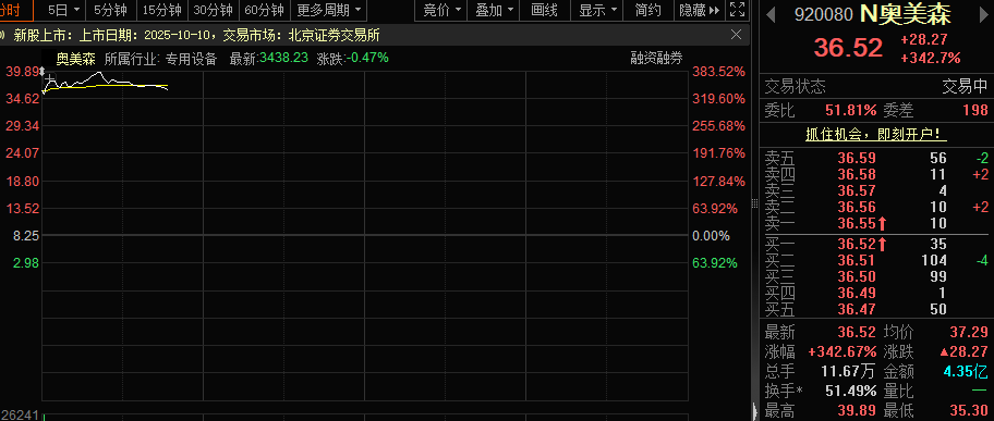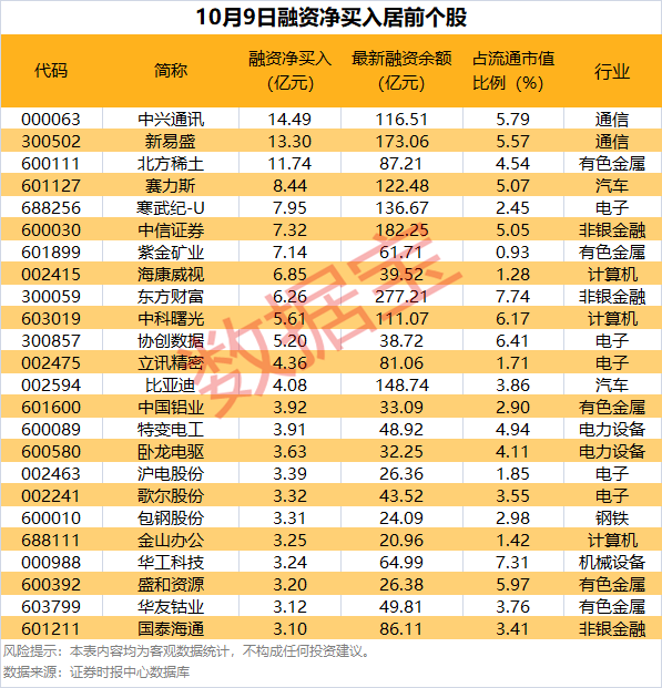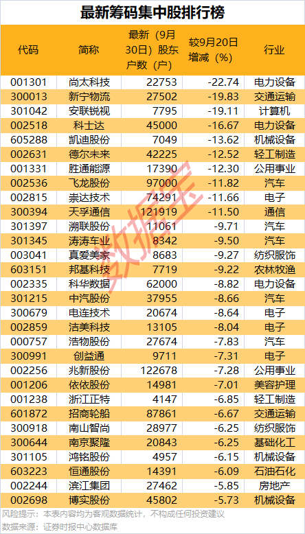 今日(10月10日),A股市场主要指数集体低开。燃气、纺织制造、煤炭开采加工、油气开采及服务板块逆市大涨。 盘面上,超硬材料概念开盘大涨,黄河旋风涨停,四方达、惠丰钻石涨超10%,三超新材、博云新材等跟涨。消息面上,商务部、海关总署公告,对超硬材料相关物项实施出口管制。 三季报业绩预增股表现亮眼,今日发布三季报的广东明珠开盘“一字”涨停,公司预计前三季度净利润同比增长858.45%到1071.44%,涛涛车业、广大特材等涨超7%。 新股提示:N奥美森开盘涨逾3倍 N奥美森(920080)今日在北交所上市,开盘价36.11元,上涨337.70%。 公司是专业的智能装备制造生产商,主要从事智能生产设备及生产线的研发、设计、生产、销售,公司产品可广泛应用于电器、环保、风电和锂电新能源及其他行业等领域,是实现生产自动化、智能化和高效化的关键装备。 单日融资增加额创历史次高 截至10月9日,市场最新融资余额为24291.95亿元,创历史新高,较上个交易日环比增加508.05亿元,当日融资增加额仅低于去年10月8日,创历史次高,2024年10月8日融资增加额为1074.86亿元。 具体到个股,10月9日获融资净买入1亿元以上的有104只,其中,11股融资净买入额超5亿元。中兴通讯融资净买入额居首,当日净买入14.49亿元;其次是新易盛、北方稀土,融资净买入金额分别为13.30亿元、11.74亿元;融资净买入金额居前的还有赛力斯、寒武纪-U、中信证券等。 据人民财讯,日前多家券商将中芯国际等多只股票的融资融券折算率调整为0,多家券商客服普遍回复根据相关规定进行的常规调整。对于折算率调整为0的情况,交易所早有明确规定,被实施风险警示、进入退市整理期的证券,静态市盈率在300倍以上或者为负数的A股股票等折算率为0。 据悉,融资融券折算率调整为0,则意味着该股票暂时失去作为担保品进行融资的功能。 最新筹码大幅集中股名单 统计显示,共有306只个股公布了9月30日股东户数,与上期(9月20日)相比,股东户数下降的有170只。其中股东户数降幅超一成的有10只。 股东户数降幅最多的是尚太科技,截至9月30日最新股东户数为22753户,较9月20日下降22.74%;其次是新宁物流,截至9月30日最新股东户数为27502户,较9月20日下降19.83%。 声明:数据宝所有资讯内容不构成投资建议,股市有风险,投资需谨慎。 校对:冉燕青 |