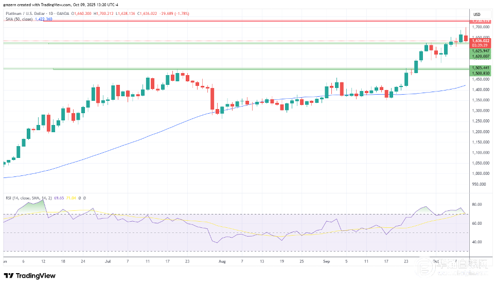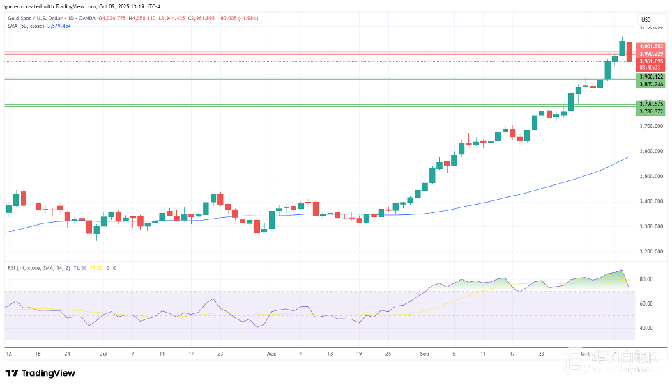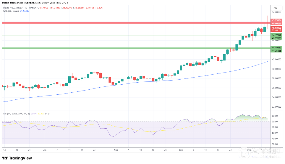 【华通白银网10月10日讯】•由于交易员在历史高点附近了结获利,金价正在下跌。 •白银测试了历史高点,但失去了动力,回落至49.00美元以下。 •铂金跌向1630美元水平。 黄金 金价回落至4000美元以下,交易员在强劲反弹后争相获利了结。 若金价跌破3950美元,则将朝着3890-3900美元支撑位前进。 白银 白银测试历史高点,但失去了动力,回落至49.00美元以下。 跌破48.50美元将为测试47.00-47.20美元支撑位开辟道路。 铂金 铂金走低,因交易商在大宗商品市场普遍回落之际了结部分获利。 如果成功测试1620-1625美元支撑位,则将向1600美元水平前进。 截止北京时间09:40,华通现货白银定盘价报10987元。 美国时间10月9日,全球最大白银ETF——iShares Silver Trust的白银持仓量为15452.23吨,较前一交易日增加36.7吨。全球最大黄金ETF—SPDR GOLD TRUST的黄金持仓量为1013.44吨,较前一交易日减少1.14吨。 白银网 |