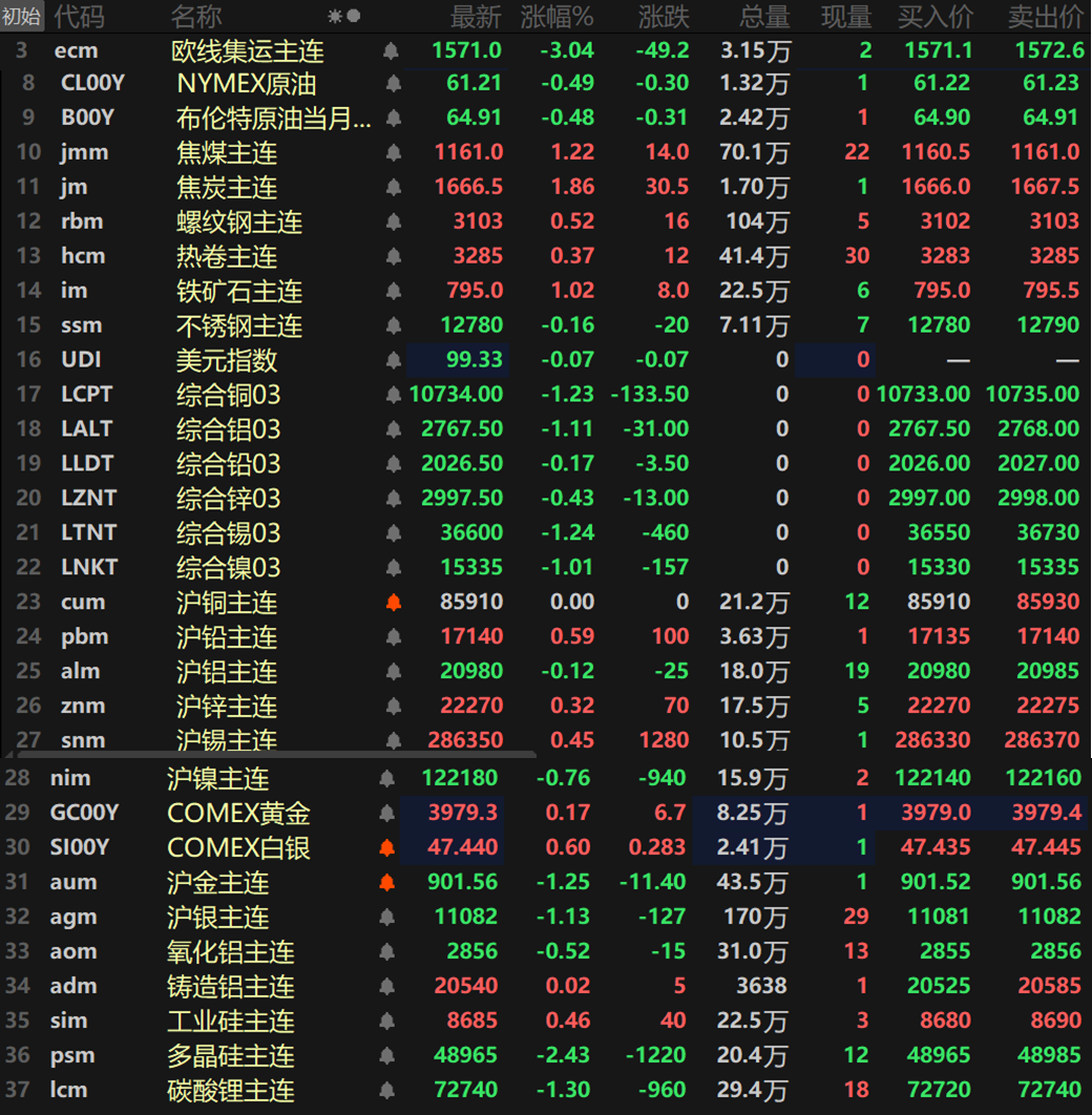 SMM 10月10日讯: 金属市场: 截至日间收盘,内盘基本金属涨跌互现,沪铜收平于85910元/吨。沪铅涨0.59%,沪锡涨0.45%,沪镍跌0.76%,其余金属涨跌幅波动均不大。氧化铝主连跌0.52%,铸造铝主连涨0.02%。 此外,碳酸锂主连跌1.3%,多晶硅主连跌2.43%,工业硅主连涨0.46%。欧线集运主连跌3.04%报1571。 黑色系方面多上涨,仅不锈钢跌0.16%。铁矿涨1.02%。双焦方面一同涨逾1%,焦煤涨1.22%,焦炭涨1.86%。 外盘方面,截至15:03分,外盘基本金属普跌,伦铜、伦铝、伦锡以及伦镍一同跌超1%,伦铜跌1.23%,伦铝跌1.11%。伦锡跌1.24%,伦镍跌1.01%。其余金属跌幅波动均不大。 贵金属方面,截至15:03分,COEMX黄金涨0.17%,COMEX白银涨0.6%。国内方面,沪金跌1.25%,沪银跌1.13%。 截至今日15:03分行情 》点击查看SMM行情看板 宏观面 国内方面: 【三部门发布《关于调整享受车船税优惠的节能 新能源汽车产品技术要求的公告》】工业和信息化部等三部门联合发布《关于调整享受车船税优惠的节能 新能源汽车产品技术要求的公告》。公告提出,对财税〔2018〕74号文中第一条第(一)项、第(二)项中涉及的节能乘用车、节能轻型商用车、节能重型商用车综合工况燃料消耗量限值标准进行更新,详见本公告附件1、附件2、附件3。对财税〔2018〕74号文中第二条第(二)项中涉及的新能源汽车产品技术要求进行调整,详见本公告附件4。享受车船税优惠的节能、新能源汽车产品其他技术要求继续按照财税〔2018〕74号文有关规定执行。本公告自2026年1月1日起实施。 【央行今日进行4090 亿元7天期逆回购操作 当日实现净回笼1910亿元】央行今日进行4,090 亿元7天期逆回购操作,操作利率1.4%。因今日有6000亿元14天期逆回购到期,当日实现净回笼1910亿元。 【C50风向指数调查:9月社融增速或趋缓 PPI同比降幅料有收窄】新一期财联社“C50风向指数”结果显示,市场预计9月信贷需求偏弱,新增社融规模或同比少增。其中,市场机构对9月新增人民币贷款的预测中值为1.2万亿元,或同比少增0.39万亿元;另对9月新增社融的预测中值为3.47万亿元,同比少增0.29万亿元。货币供应量方面,多家市场机构预计金融活化持续,9月M1有望延续上行,M2因去年高基数扰动则呈现回落。物价方面,9月CPI同比增速或仍处低位,PPI同比降幅收窄。具体来看,市场机构对9月CPI同比增速预测中值为-0.2%,对9月PPI同比增速预测中值为-2.4%。(财联社) ►10月10日银行间外汇市场人民币汇率中间价为1美元对人民币7.1048元 美元方面: 截至15:03分,美元指数下跌0.07%报99.33,据央视新闻客户端,当地时间9日,美国共和党提出的结束美国政府停摆的法案未能在参议院获得足够票数,法案未获通过。美国总统特朗普当天表示,鉴于美国国会在重启政府问题上似乎仍陷于僵局,他计划削减一些受民主党欢迎的联邦项目。美国联邦政府停摆态势延续,接下来的几天是观察转折的关键窗口,不确定性仍然存在。 美联储官员表态分歧仍存,美联储理事巴尔称应谨慎降息,当前利率具有温和限制性。旧金山联邦储备银行总裁戴利表示,就业市场走软,通胀放缓,都为美国上月降息提供了理由,并促使美联储暗示未来可能进一步降息。纽约联储总裁威廉姆斯也支持今年继续降息。(文华综合) 宏观方面: 今日将公布瑞士9月消费者信心指数-季调后、中国9月M2货币供应年率(1010-1017几点不定)、中国9月社会融资规模-年初至今(1010-1017几点不定)、中国9月新增人民币贷款-年初至今(1010-1017几点不定)、加拿大9月就业人数变动、加拿大9月失业率、美国9月非农就业人口变动季调后(10/10-10/15)、美国截至10月4日当周初请失业金人数(10/10-10/15)、美国截至10月4日当周续请失业金人数(10/10-10/15)、美国8月批发库存月率终值(10/10-10/15)、美国10月密歇根大学消费者信心指数初值等数据。 此外,还需关注:美联储理事巴尔和2026年FOMC票委、明尼阿波利斯联储主席卡什卡利在一场活动上发表讲话;2025年FOMC票委、圣路易联储主席穆萨莱姆就美国经济和货币政策发表讲话;2025年FOMC票委、芝加哥联储主席古尔斯比在一个社区银行家研讨会上致开幕词并主持讨论。值得注意的是:非农数据发布具体日期还没有确定,由于美国政府停摆还在持续,截至目前进行的六次临时支出法案投票均未获通过。9月美国CPI数据将由美国劳工统计局计划在月底前发布。 原油方面: 截至15:03分,两市油价一同下跌,美油跌0.49%,布油跌0.48%,地缘政治风险消退,令市场紧张情绪略有降温。OPEC+11月继续增产13.7万桶/日,供应压力继续加大。彭博调查数据显示,9月OPEC产量环比增加40万桶/日,主要由沙特增32万桶/日贡献,OPEC+增产8国中的伊拉克、科威特、阿联酋并未贡献增量,随着伊拉克库区石油出口于9月末重启,其10月产量有望重回增加。此外,委内瑞拉、伊朗、利比亚在9月分别贡献了8万桶/日、4万桶/日、4万桶/日的环比增量。在OPEC+持续增产的背景下,EIA在10月报中再次上调2025年供应增量至270万桶/日,但也小幅上调了2025年需求增量,认为2025年第四季度的累库压力极大。(文华综合) SMM日评 ►补充昨日涨势 打包易拉罐单日拉涨150元/吨【废铝日评】 ►【SMM MHP日评】10月10日 MHP价格因钴价上行而上行 ►【SMM硫酸镍日评】10月10日 镍盐价格有所上涨 ►【镍生铁日评】博弈之下高镍生铁价格持平 成本支撑下价格跌势缓慢 ►稀土价格偏弱运行 市场实际成交冷清【SMM稀土日评】 